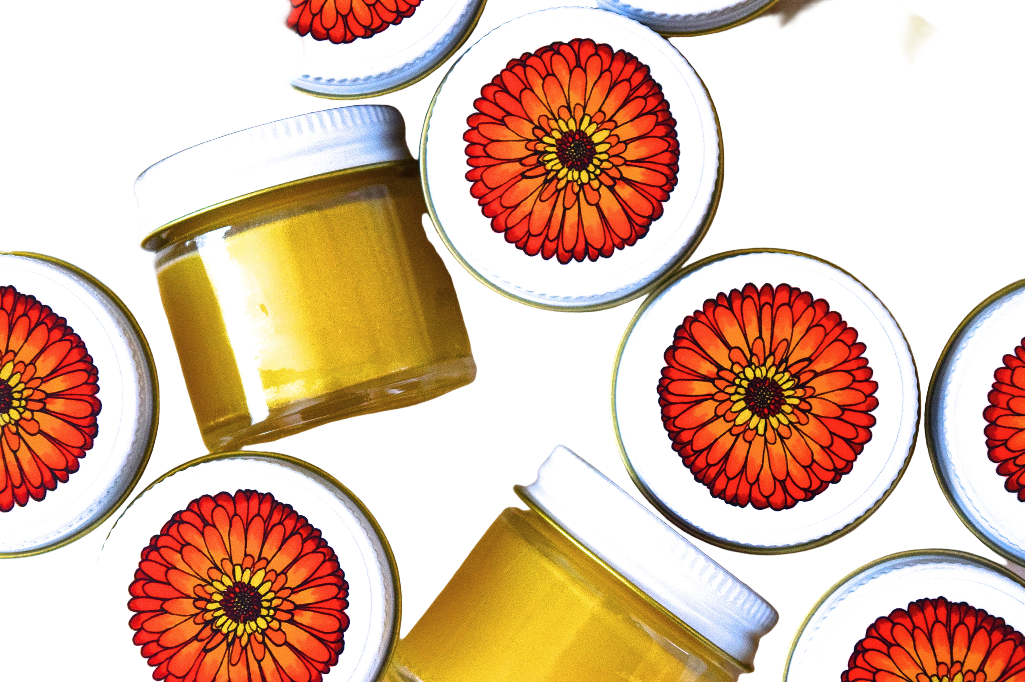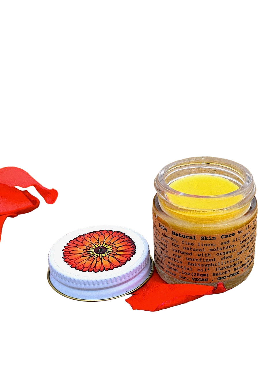 Includes: a 1oz (28ml) glass jar with a metal lid of Calendula Balm. Shipped + packaged with love and nature friendliness.