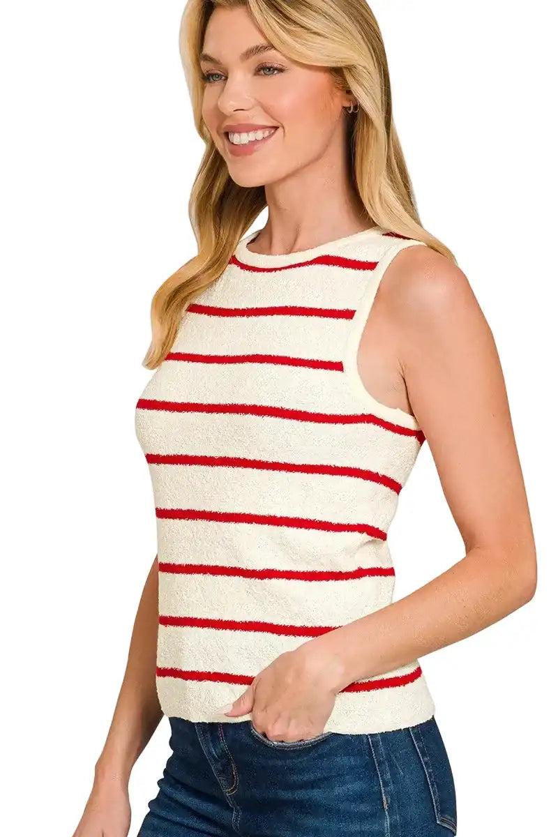 Embrace the essence of romance with the Zenana Round Neck Stripe Knit Tank Top, a piece that whispers elegance and charm. Its classic stripes dance gracefully across the fabric, evoking a timeless allure that captivates the heart.