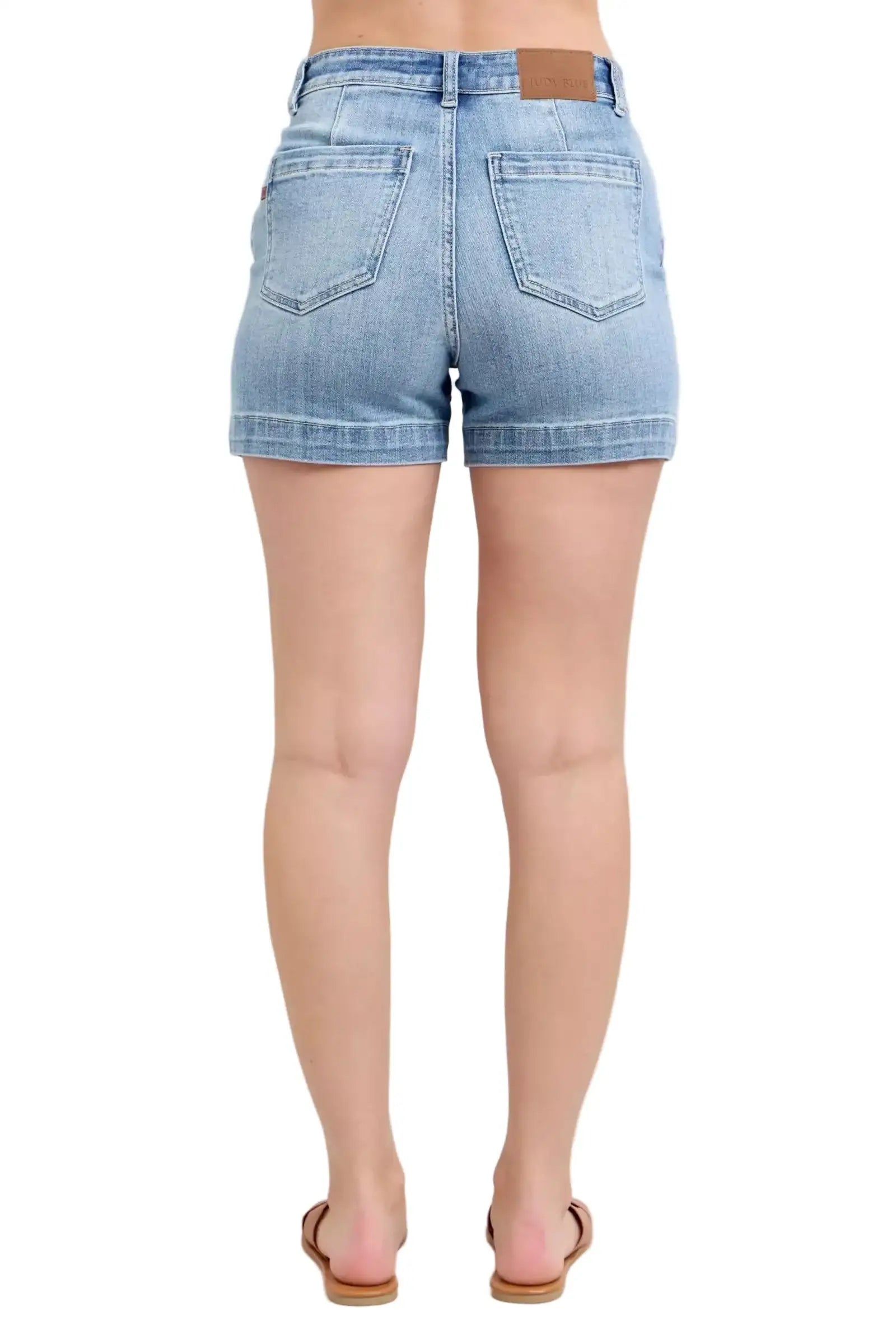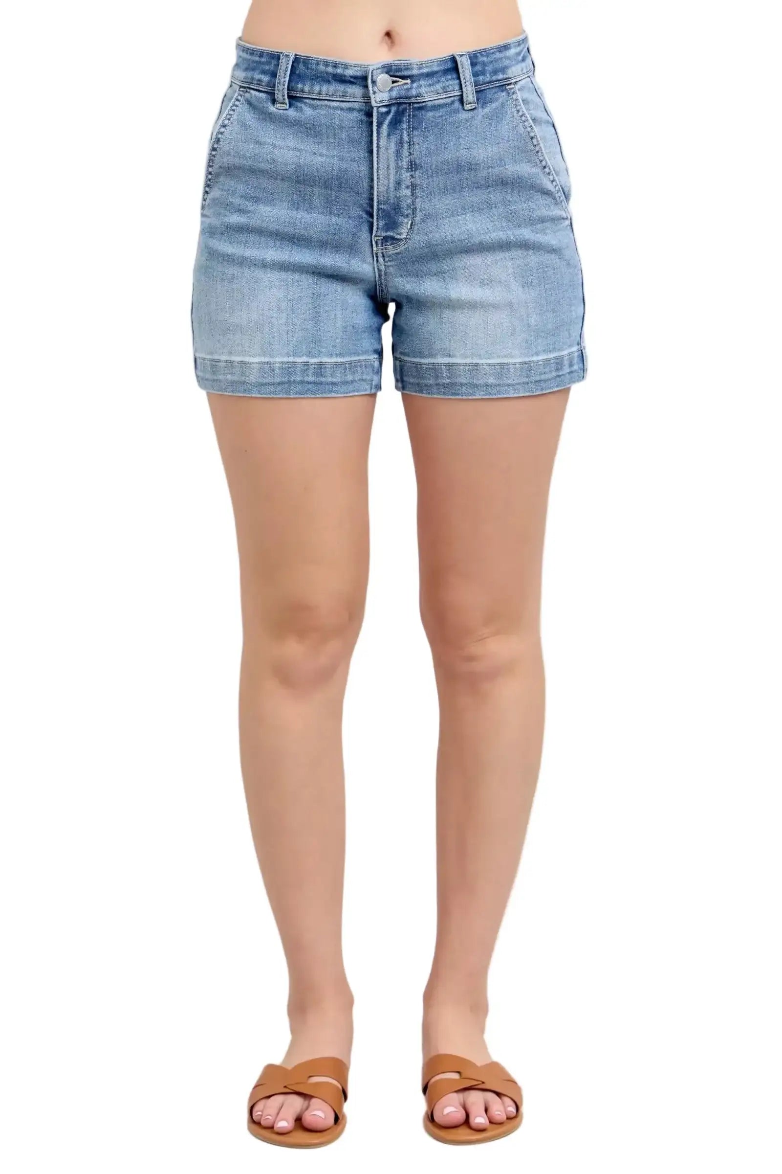 Embrace the essence of summer romance with the Judy Blue Mid Rise Denim Shorts. These shorts, with their elegant mid-rise waist and tailored trouser design, whisper sophistication into your wardrobe. The soft denim caresses your skin, offering comfort that lasts from sunlit picnics to moonlit strolls.