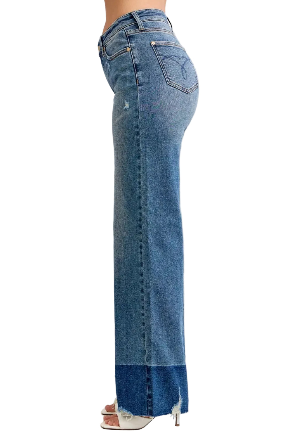 The high-waisted silhouette gently hugs your waist, while the raw hem adds a flirtatious edge, making every step a dance of sophistication. Perfect for a romantic evening or a casual stroll, these jeans promise to be your go-to companion, effortlessly blending style and comfort.
