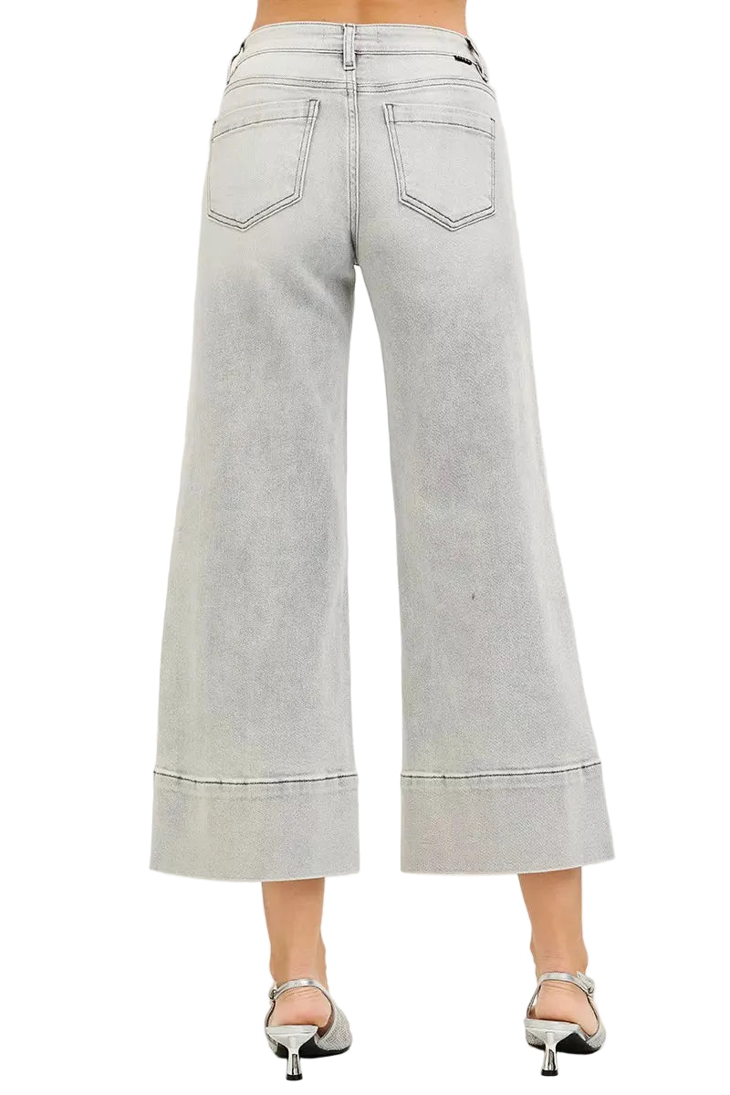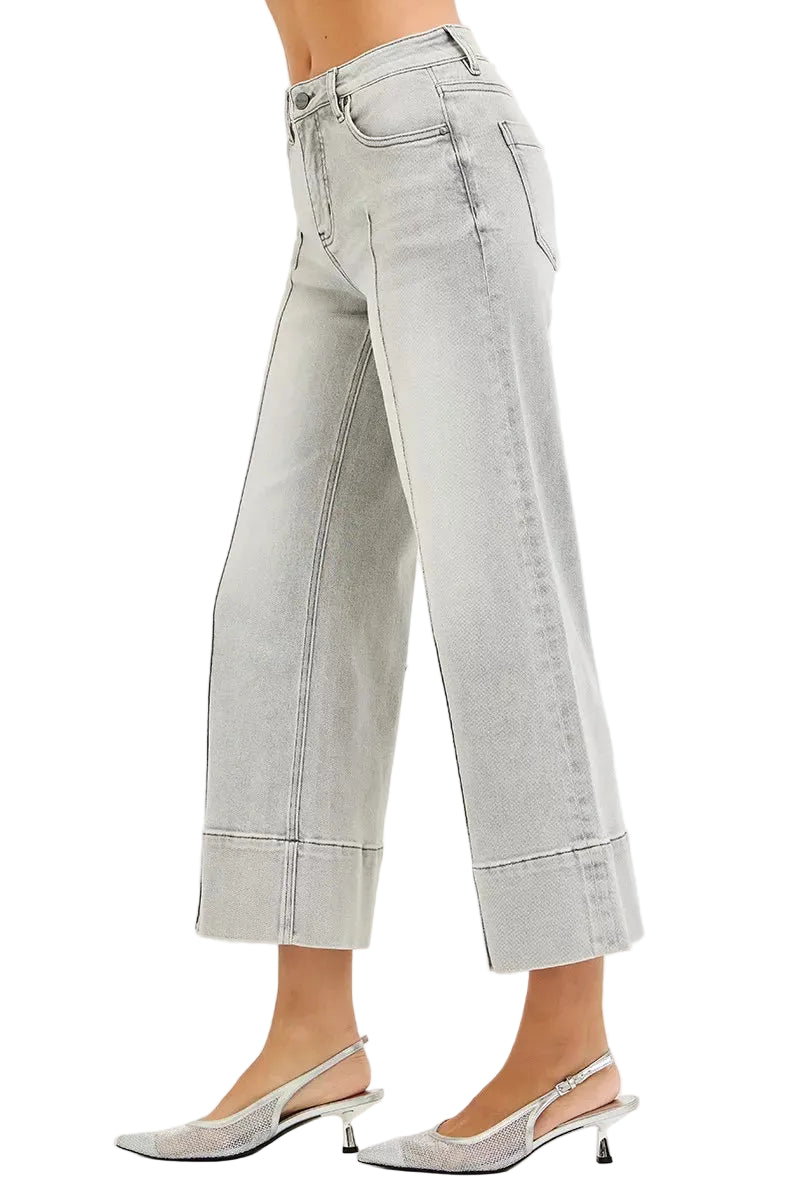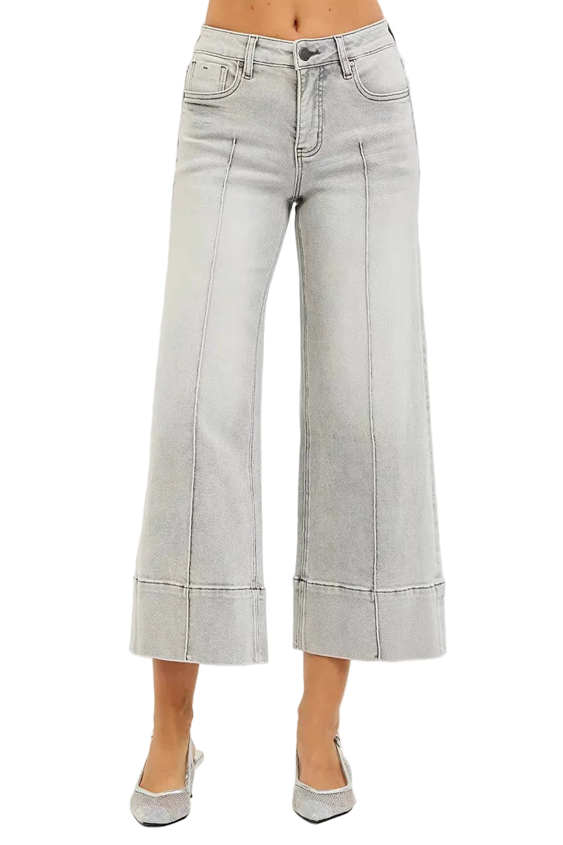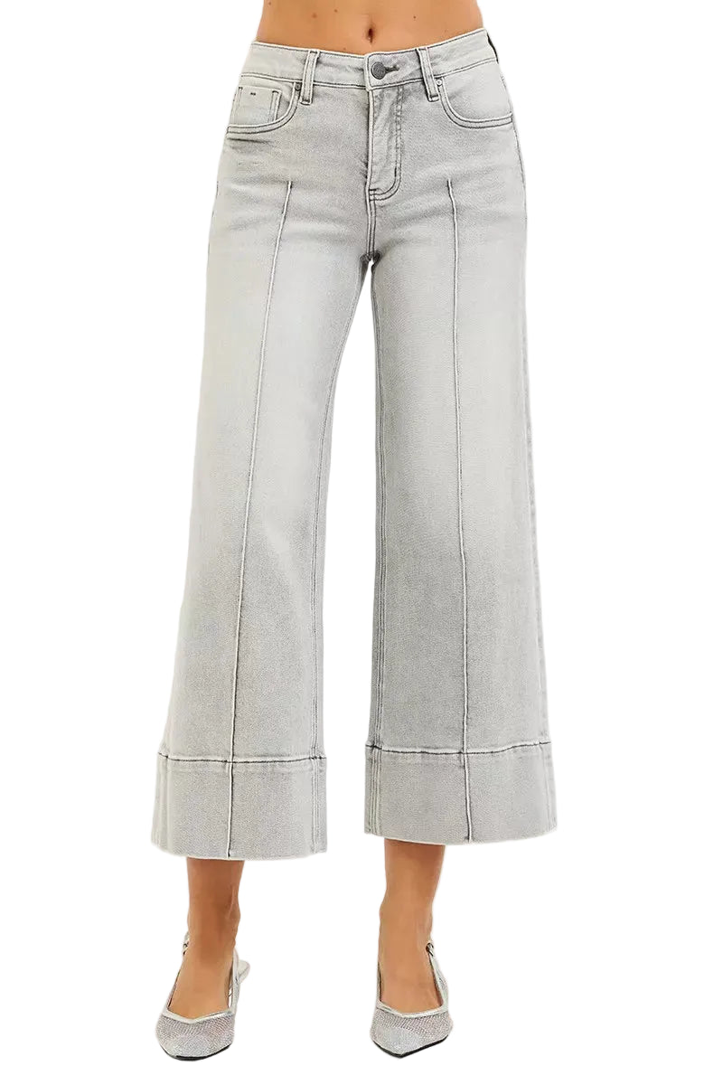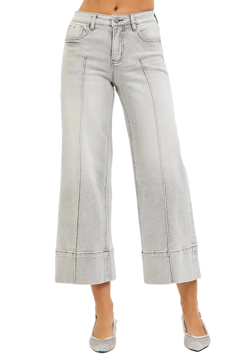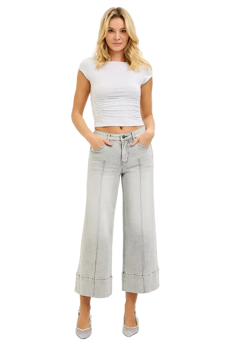 Embrace your curves with the enchanting RISEN Tummy Control Mid Rise Crop Wide Pintuck Front Jeans. These jeans caress your silhouette, offering a gentle embrace around your midsection, enhancing your natural beauty.