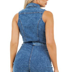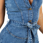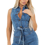 Embrace the allure of summer evenings with our Women Fashion Denim Rompers, a perfect blend of comfort and seduction. Each romper, adorned with a front button closure and a charming spread collar, whispers elegance while accentuating your silhouette.