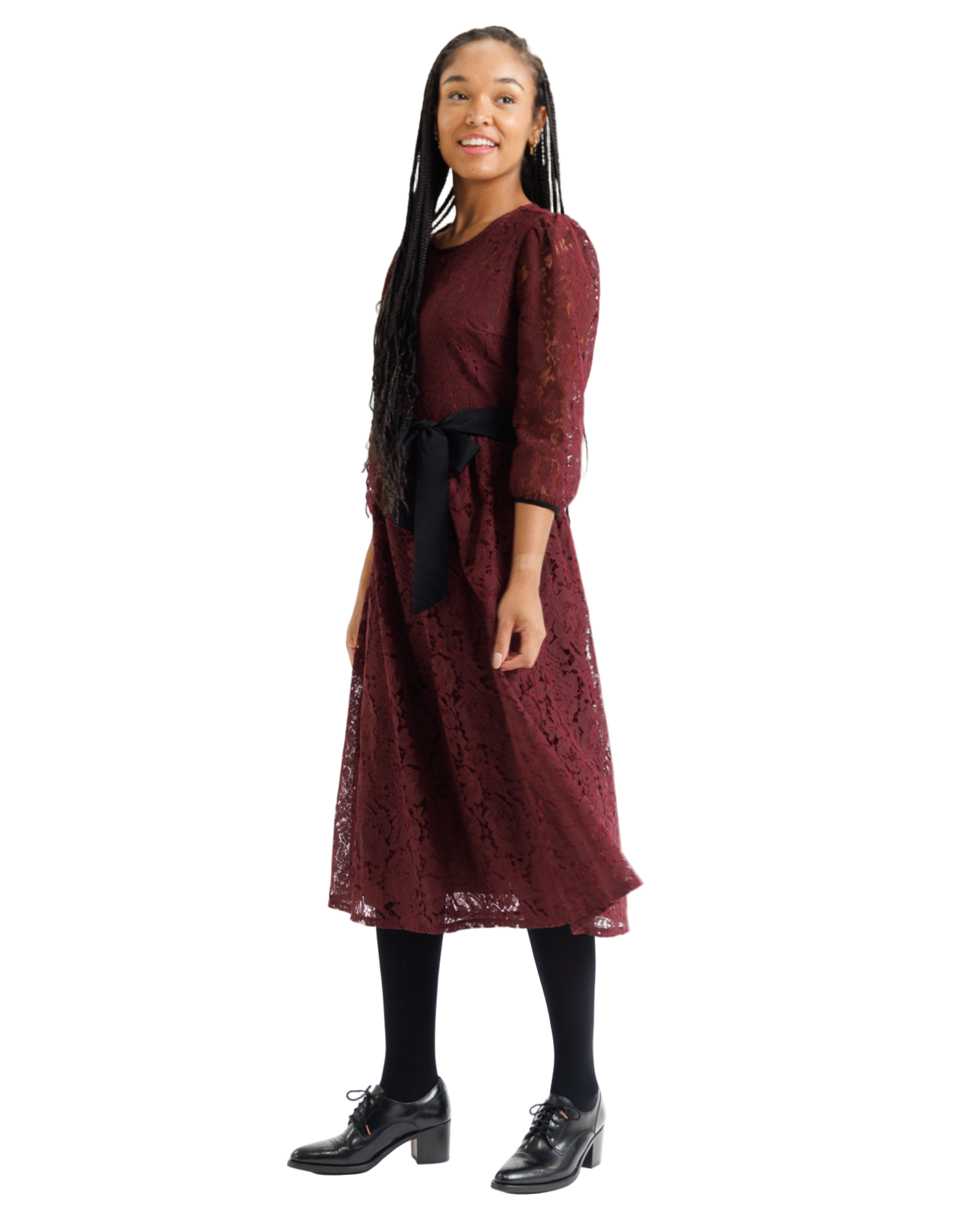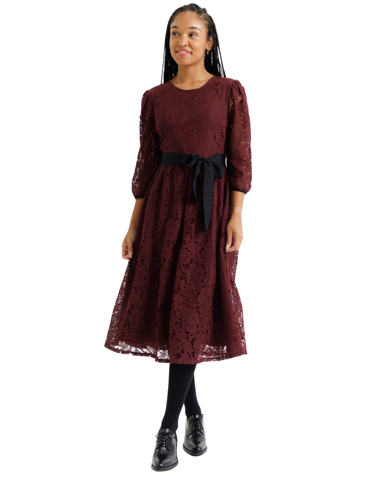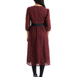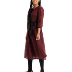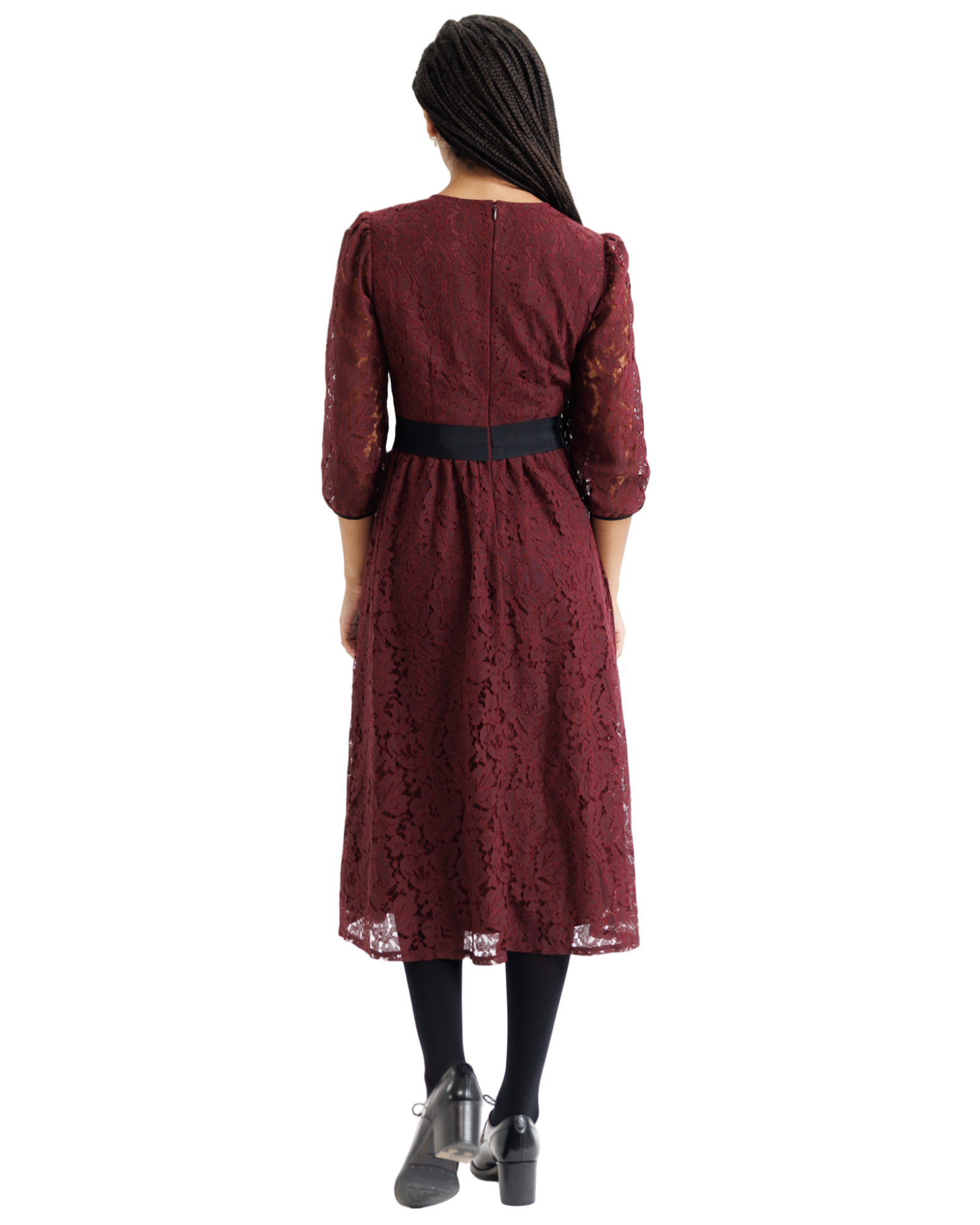 The delicate scoop neckline frames your beauty, while the waist ribbon cinches gently, accentuating your curves. With 3/4 sleeves adorned with elastic openings, this dress dances with your movements, creating a captivating allure.