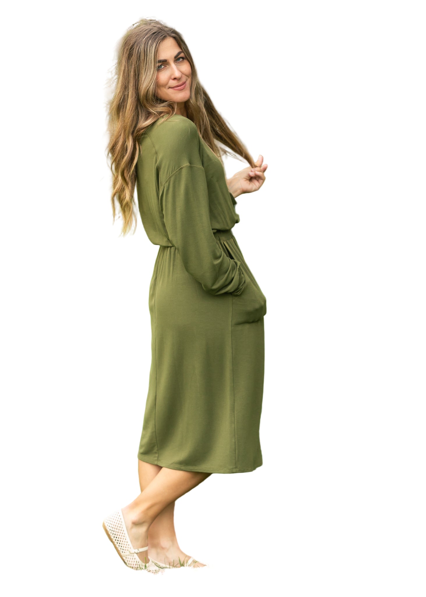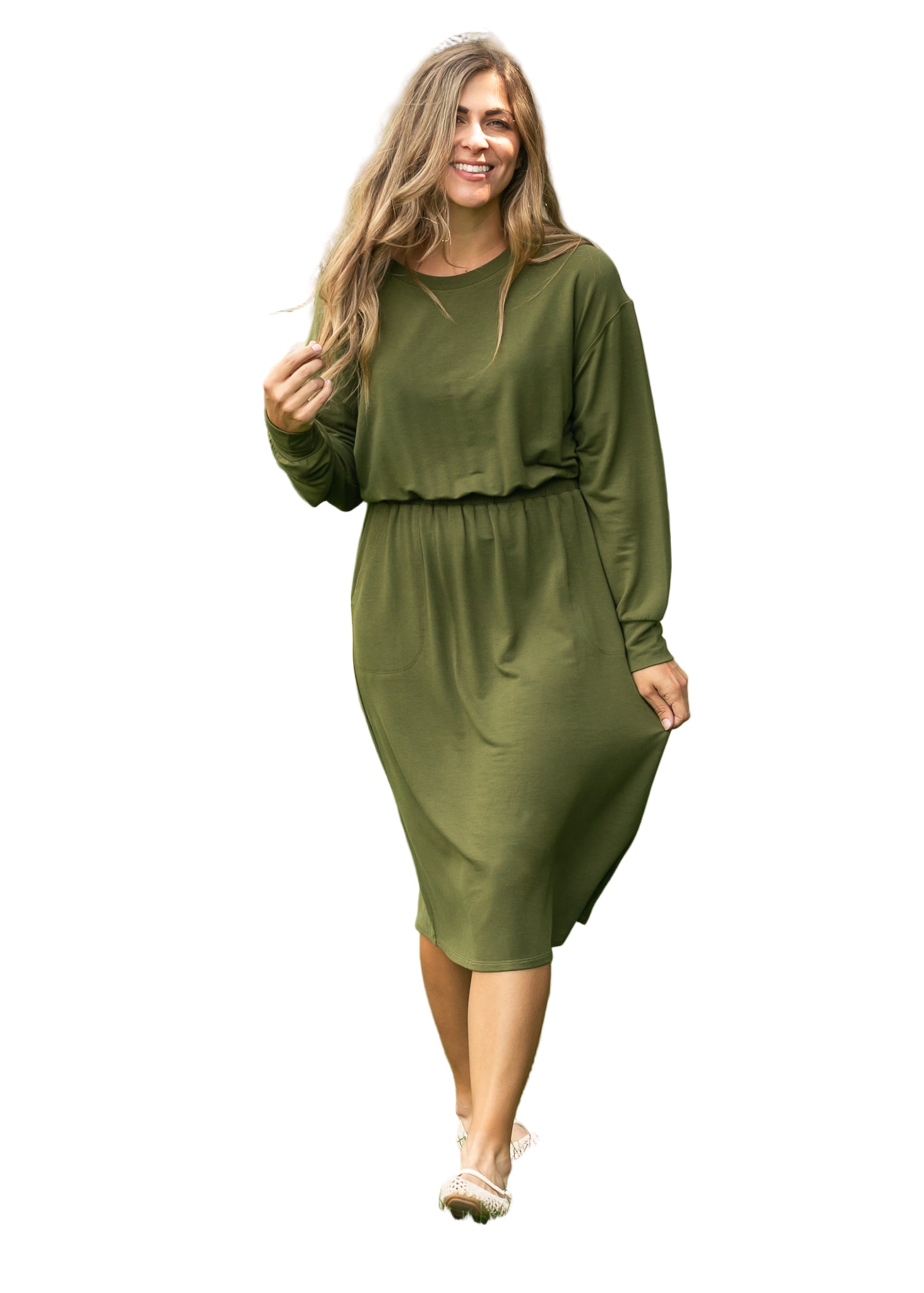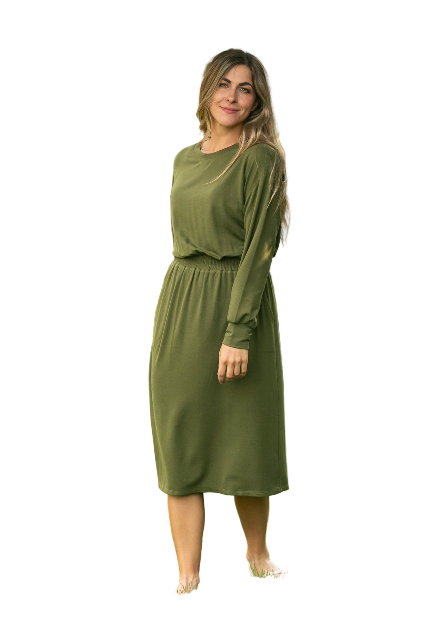 Embrace the allure of romance with the Ginger Midi Dress, a captivating olive green creation that whispers elegance. Its smocked waist gently hugs your silhouette, while the long sleeves drape gracefully, inviting admiration from every angle.