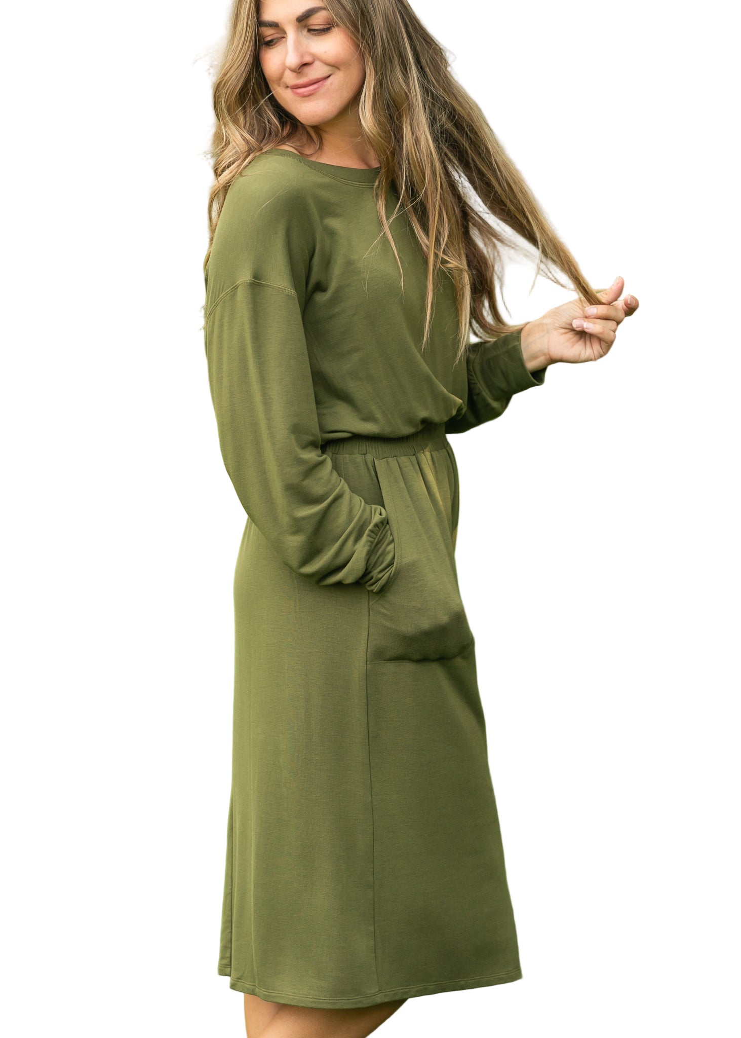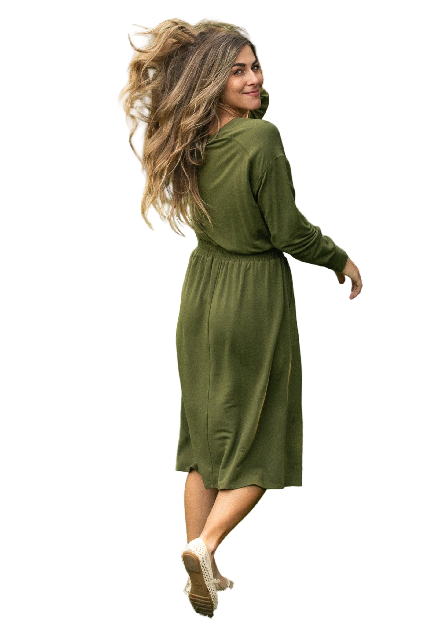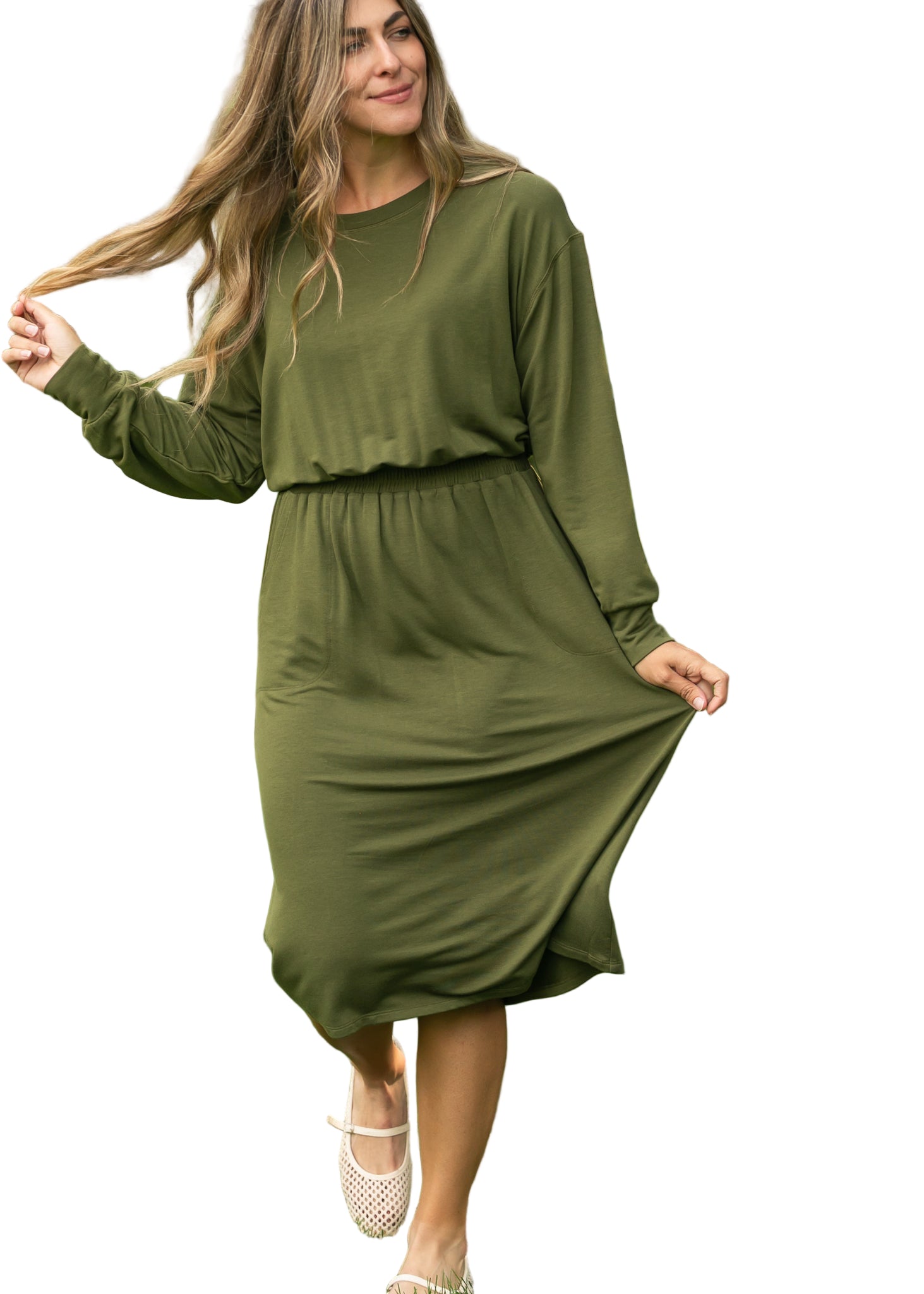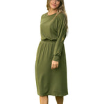 Embrace the allure of romance with the Ginger Midi Dress, a captivating olive green creation that whispers elegance. Its smocked waist gently hugs your silhouette, while the long sleeves drape gracefully, inviting admiration from every angle.