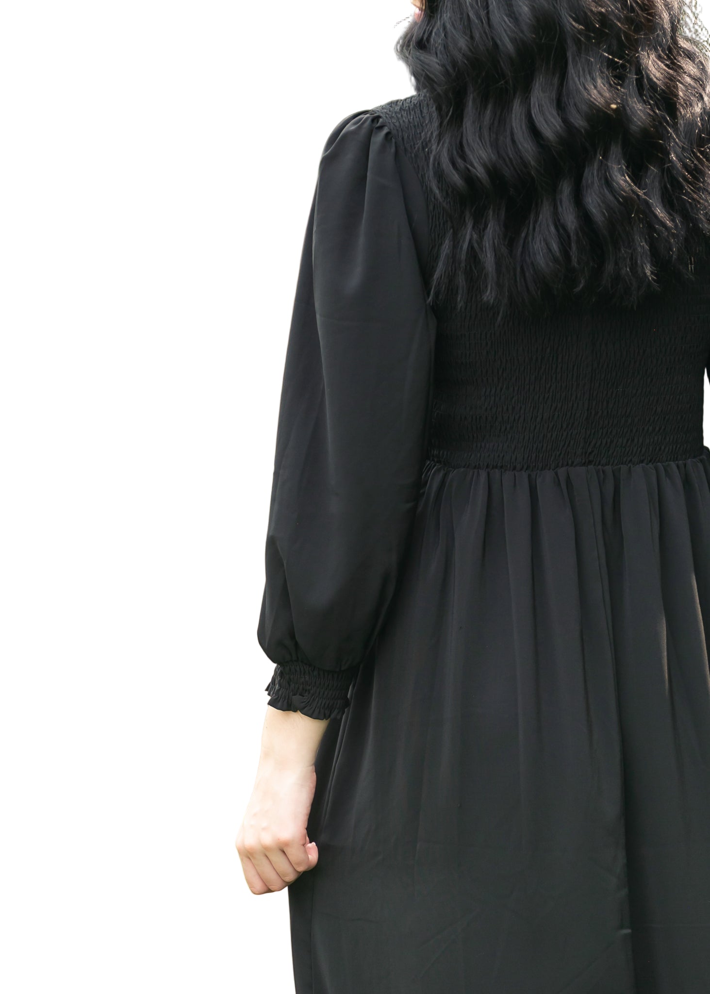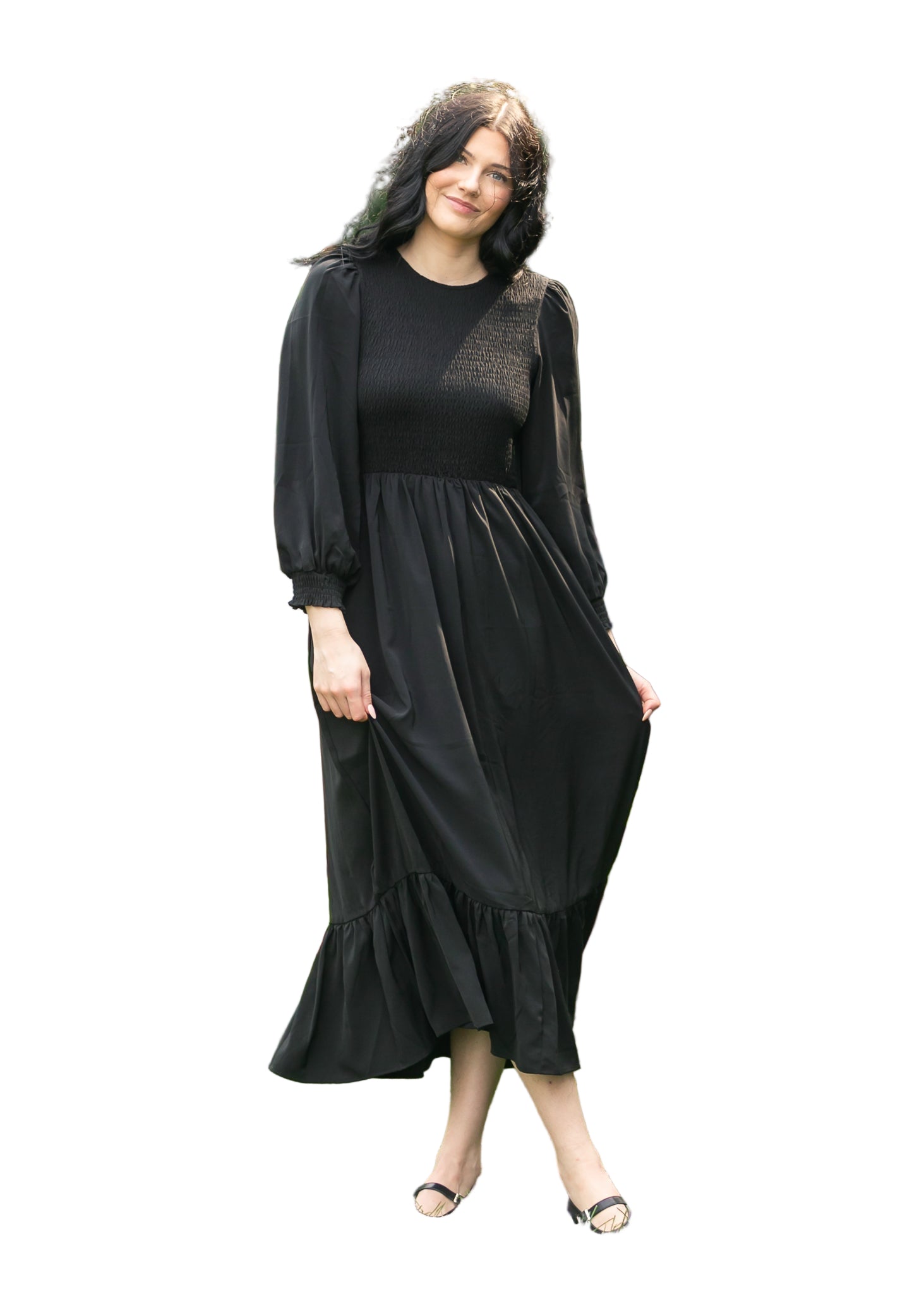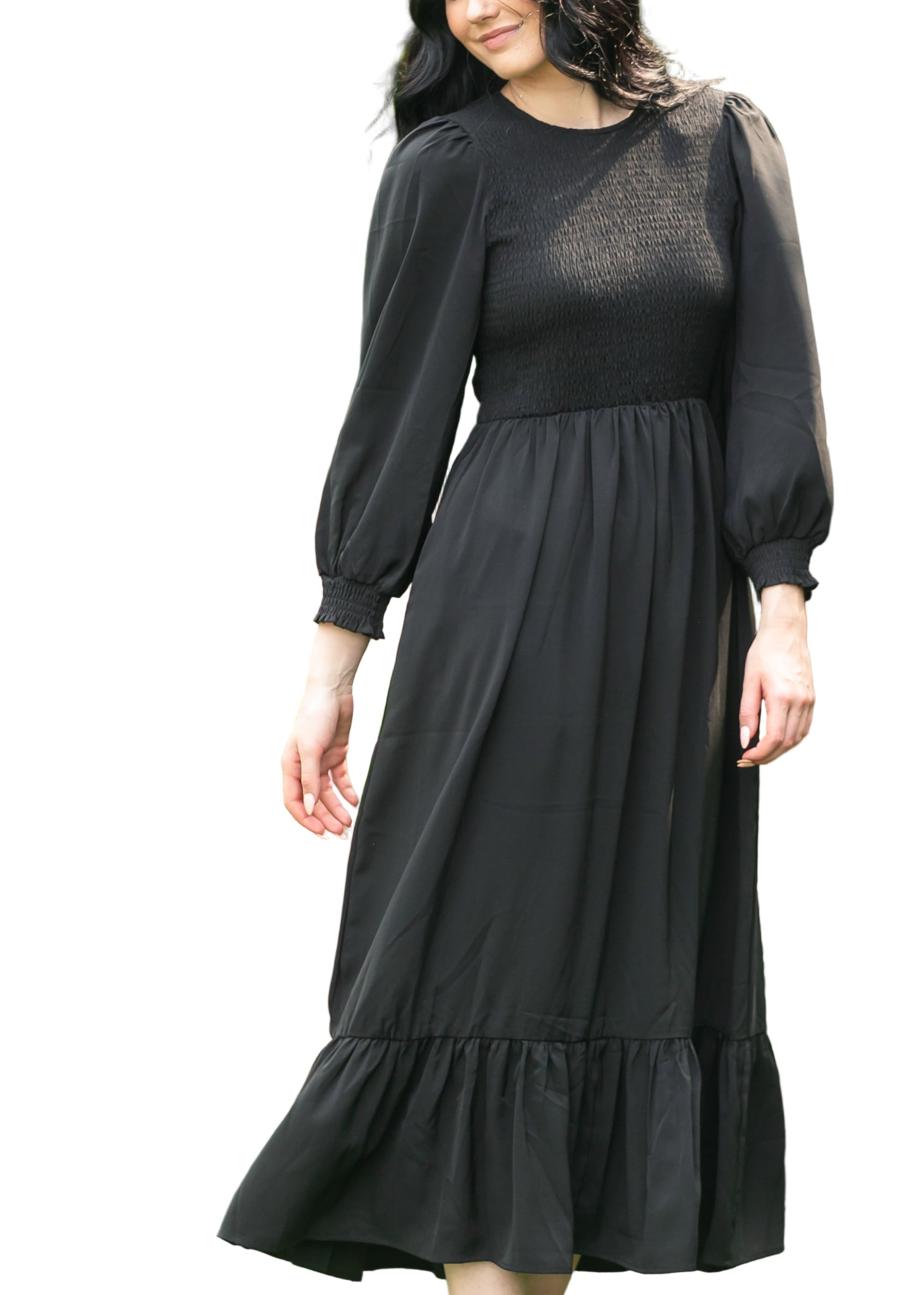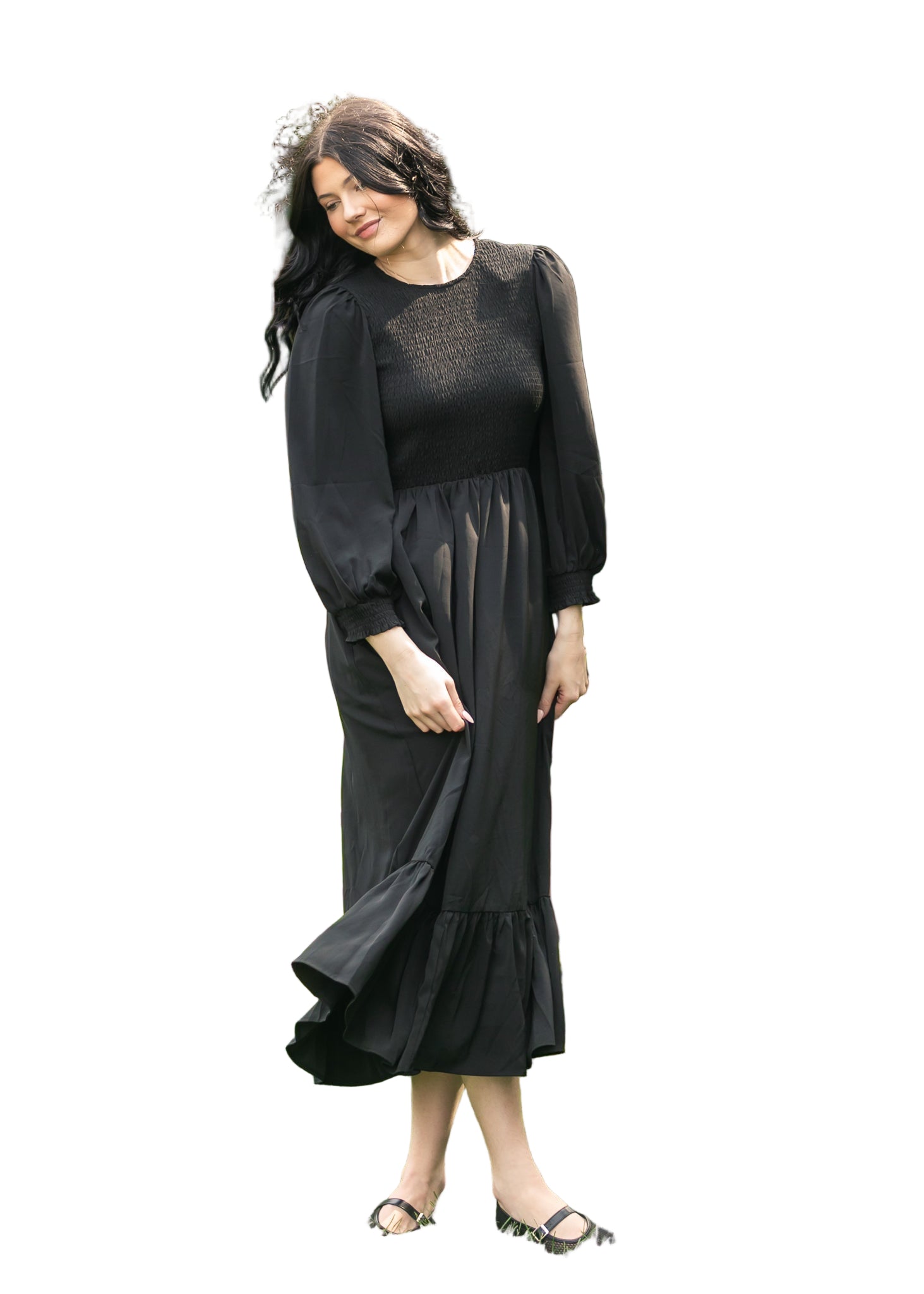 The smocked bodice hugs gently, while the tiered hem dances with every step you take. Long, loose sleeves add a touch of comfort, cinched at the cuffs to create a delicate balance of style and ease.