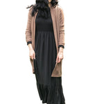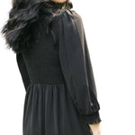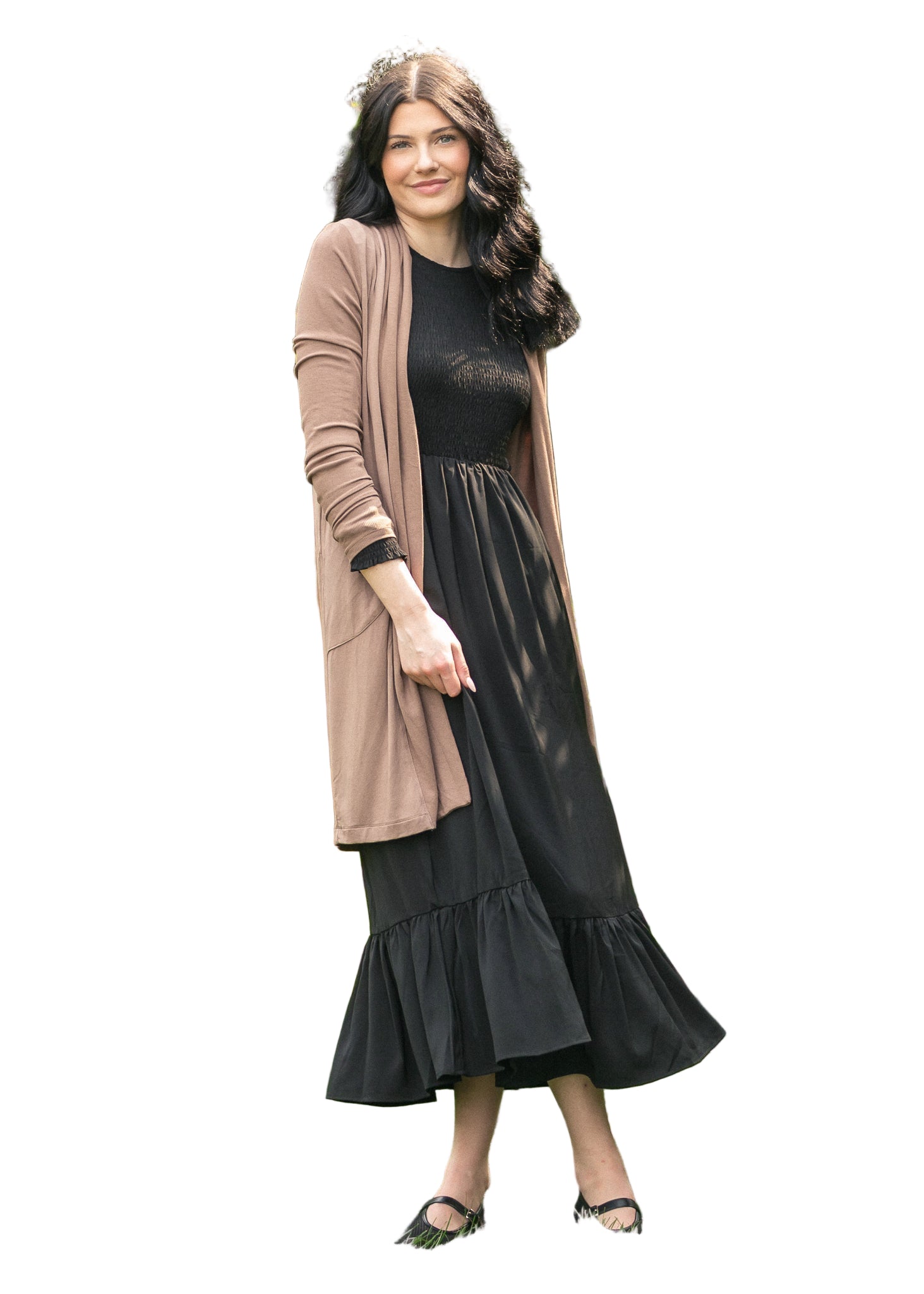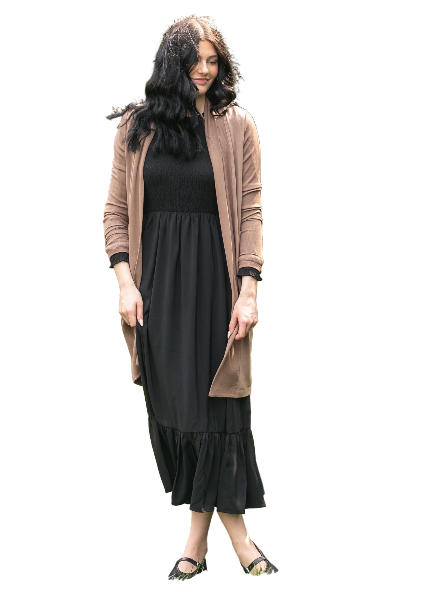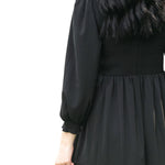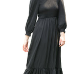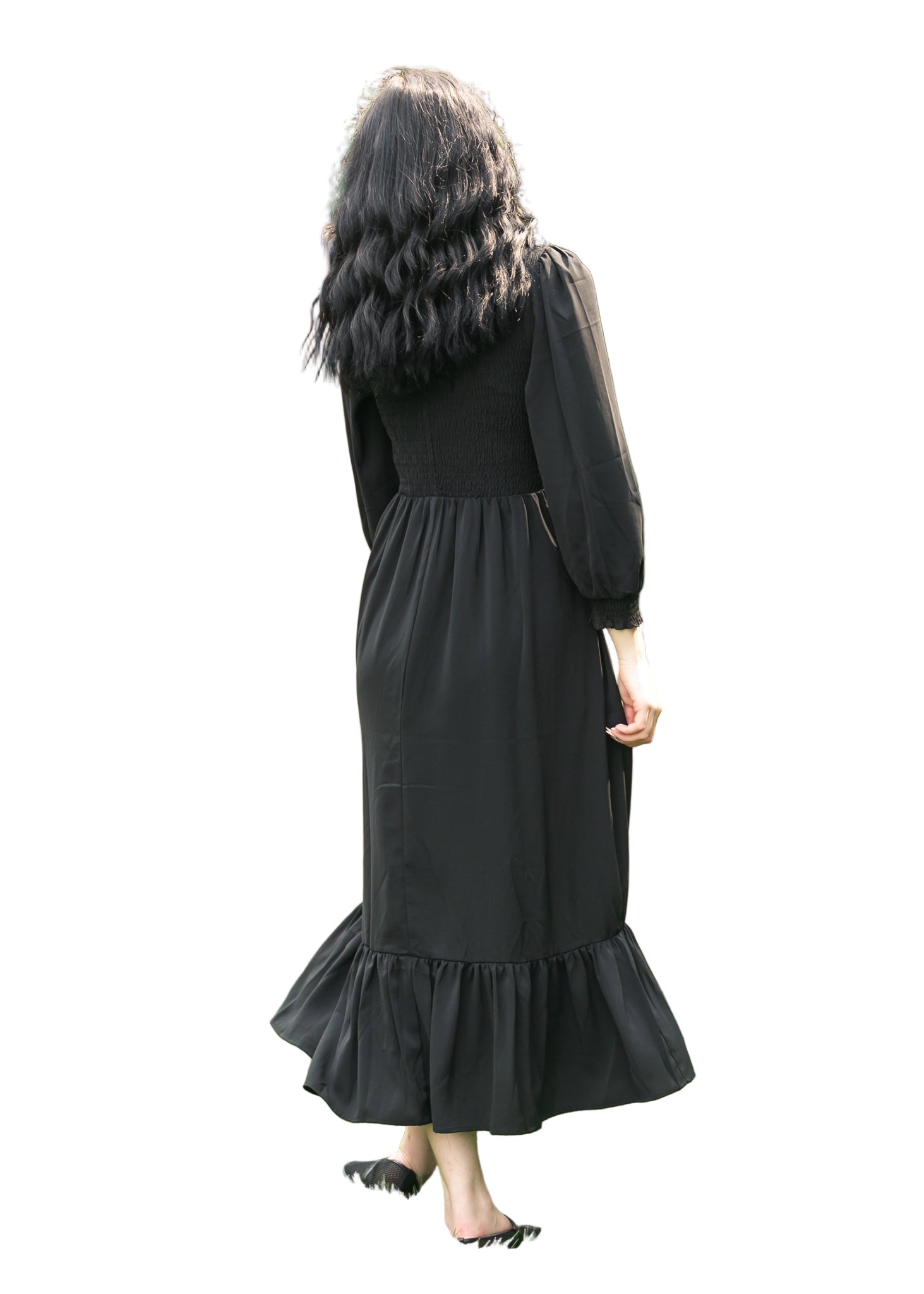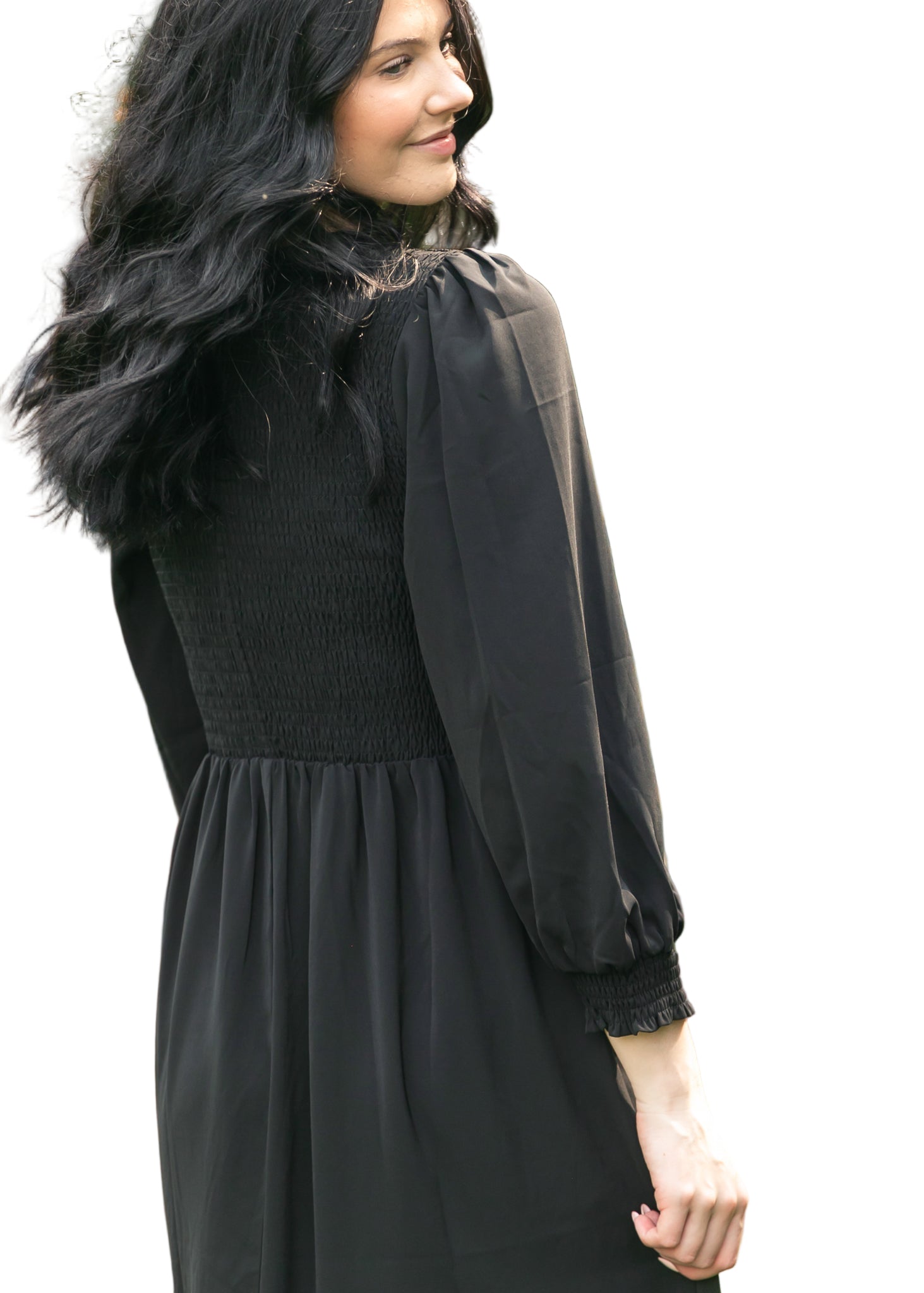The smocked bodice hugs gently, while the tiered hem dances with every step you take. Long, loose sleeves add a touch of comfort, cinched at the cuffs to create a delicate balance of style and ease.