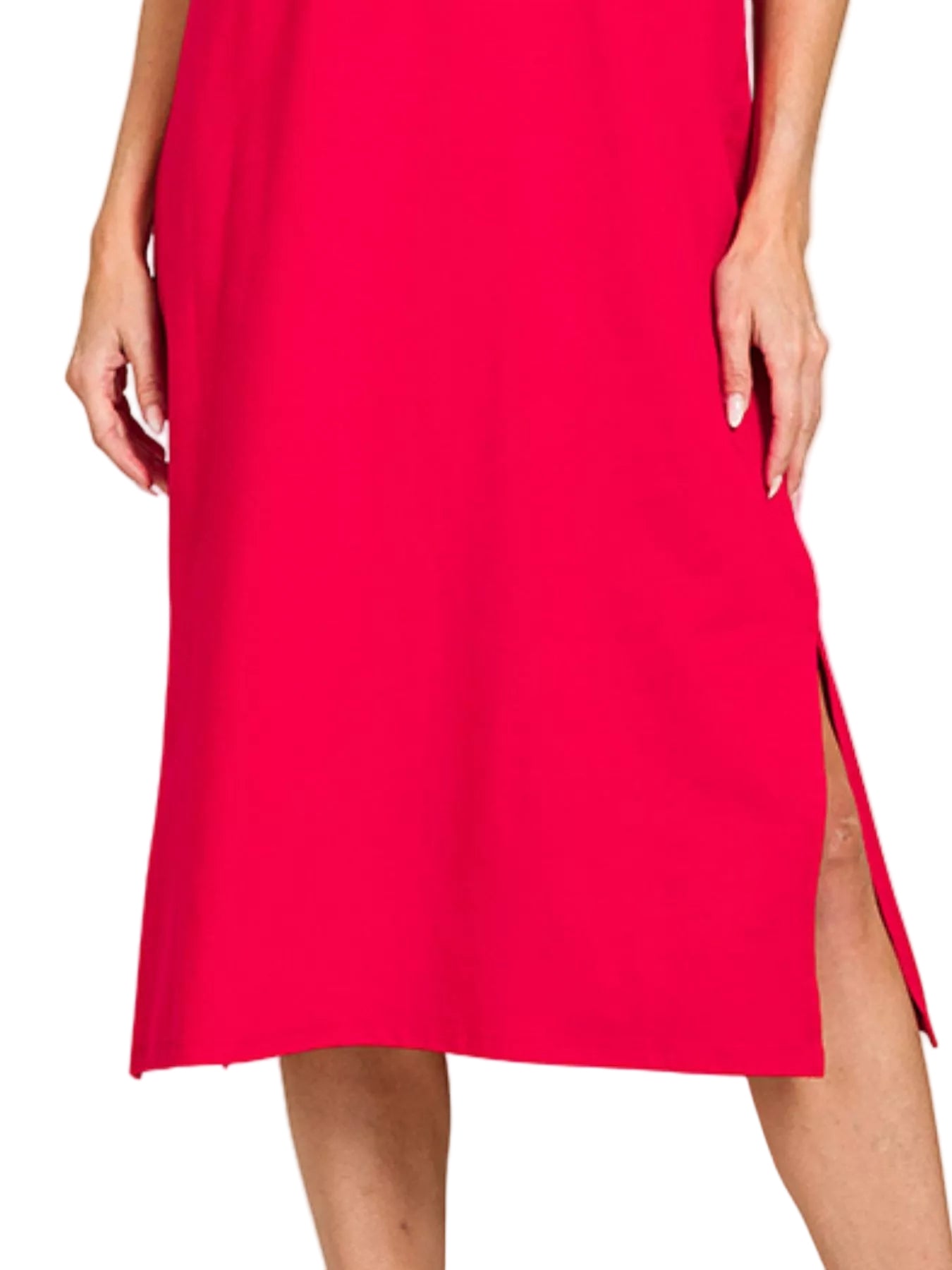 Embrace the essence of romance with the Zenana Round Neck Side Slit Midi Dress. This enchanting piece drapes gracefully, whispering elegance with every movement. The classic round neckline frames your beauty, while the side slits add a playful touch, inviting admiration.