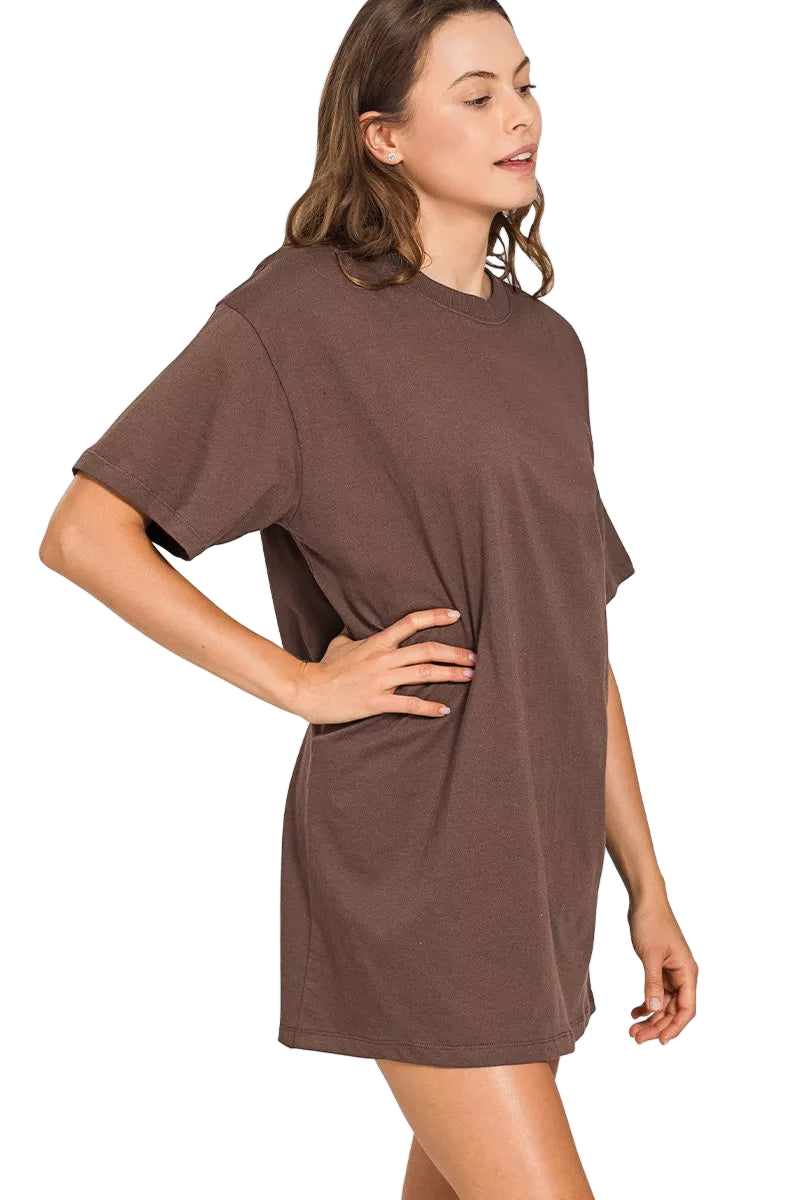 The classic crew neckline and short sleeves create a timeless allure, while the modern mini length adds a playful twist. In a versatile brown hue, this dress is your perfect companion for lazy afternoons or spontaneous outings, effortlessly blending comfort with chic elegance.