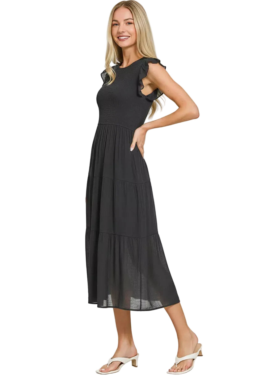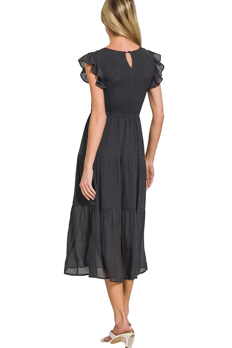 Zenana Woven Smocked Ruffle Sleeve Midi Dress