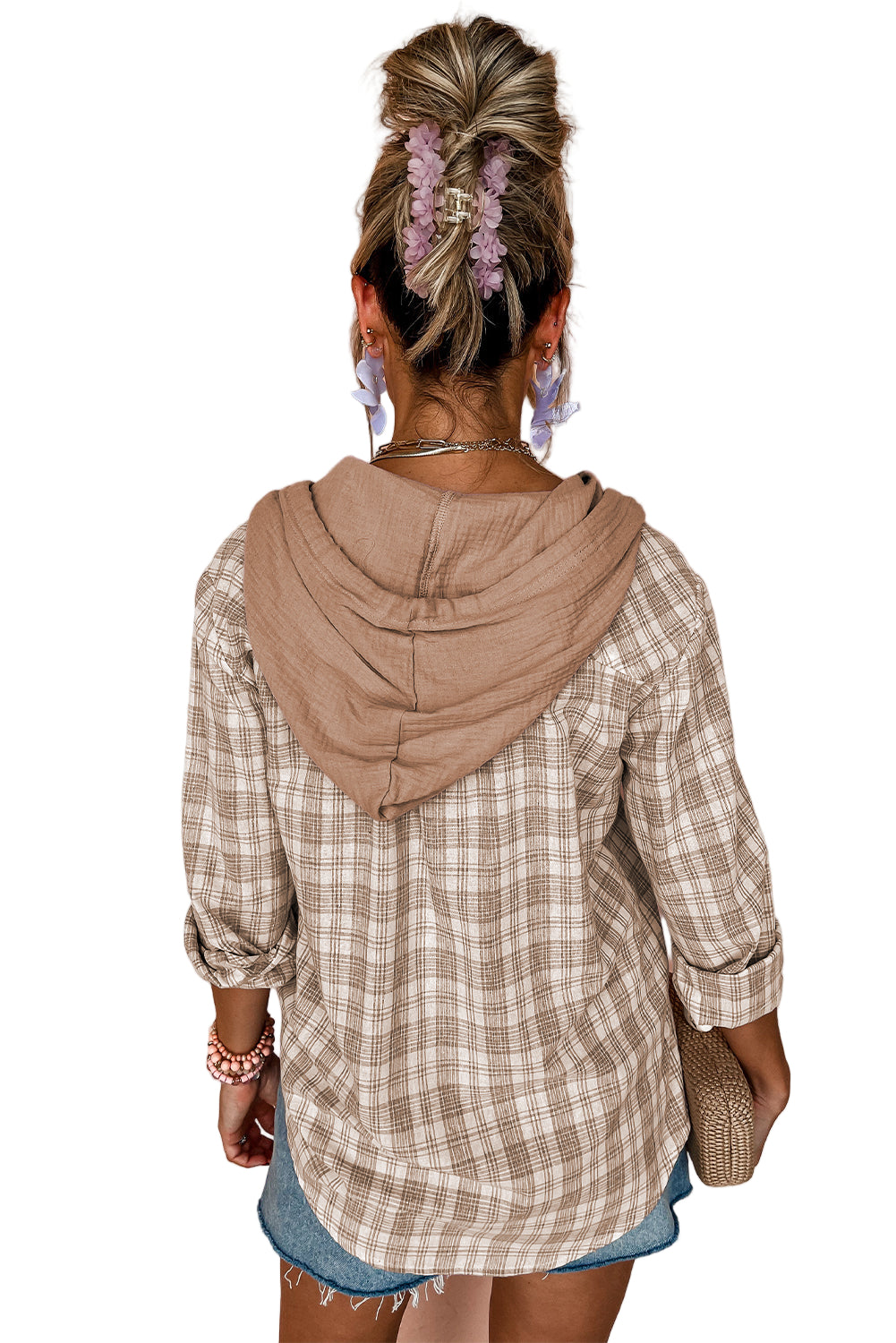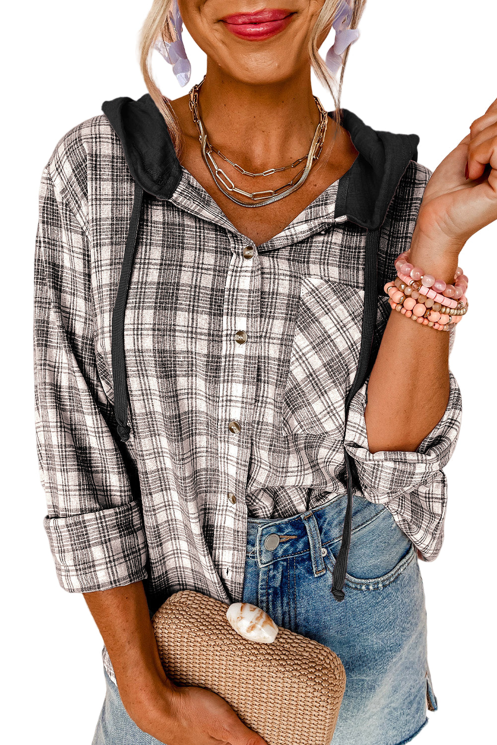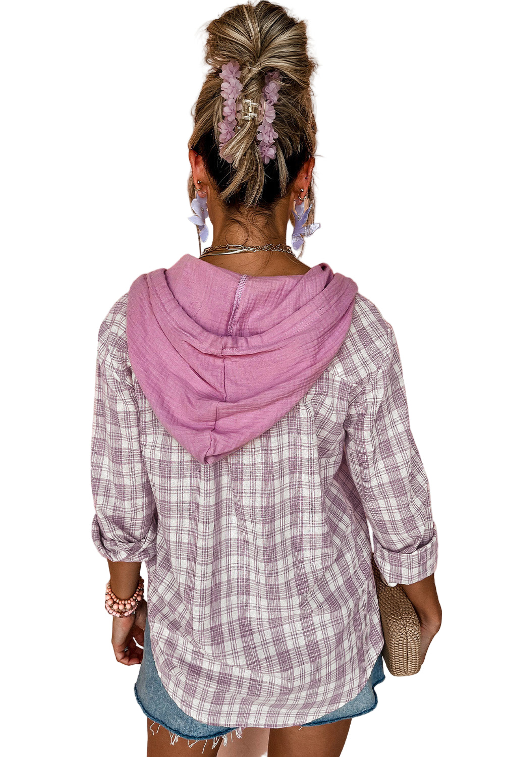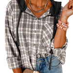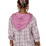 Wrap yourself in the tender embrace of our Pink Checkered Print Loose Fit Buttoned Hooded Shacket. This enchanting piece whispers romance with its soft hues and classic checkered pattern, inviting you to indulge in cozy moments.