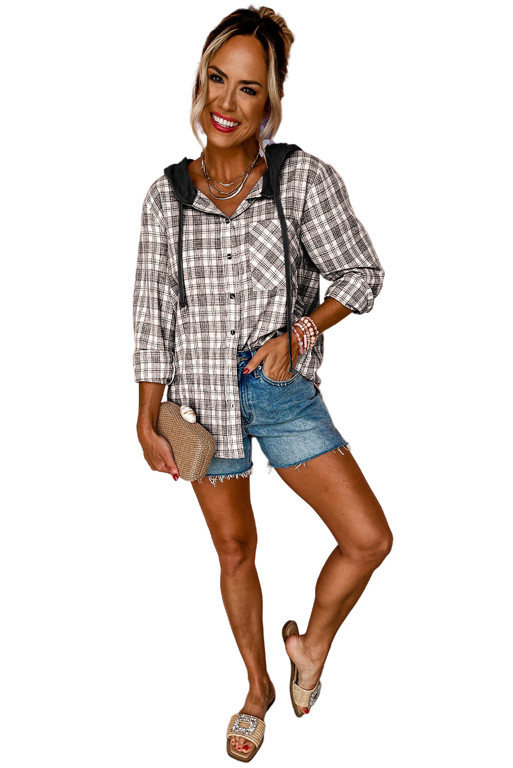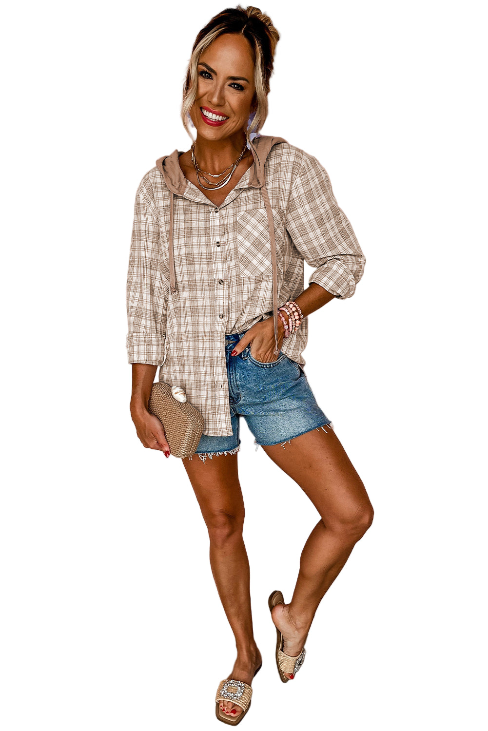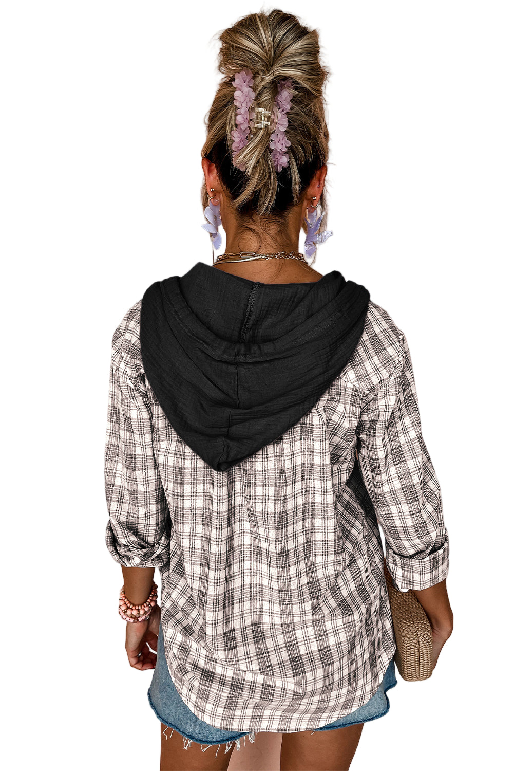 Wrap yourself in the tender embrace of our Pink Checkered Print Loose Fit Buttoned Hooded Shacket. This enchanting piece whispers romance with its soft hues and classic checkered pattern, inviting you to indulge in cozy moments.