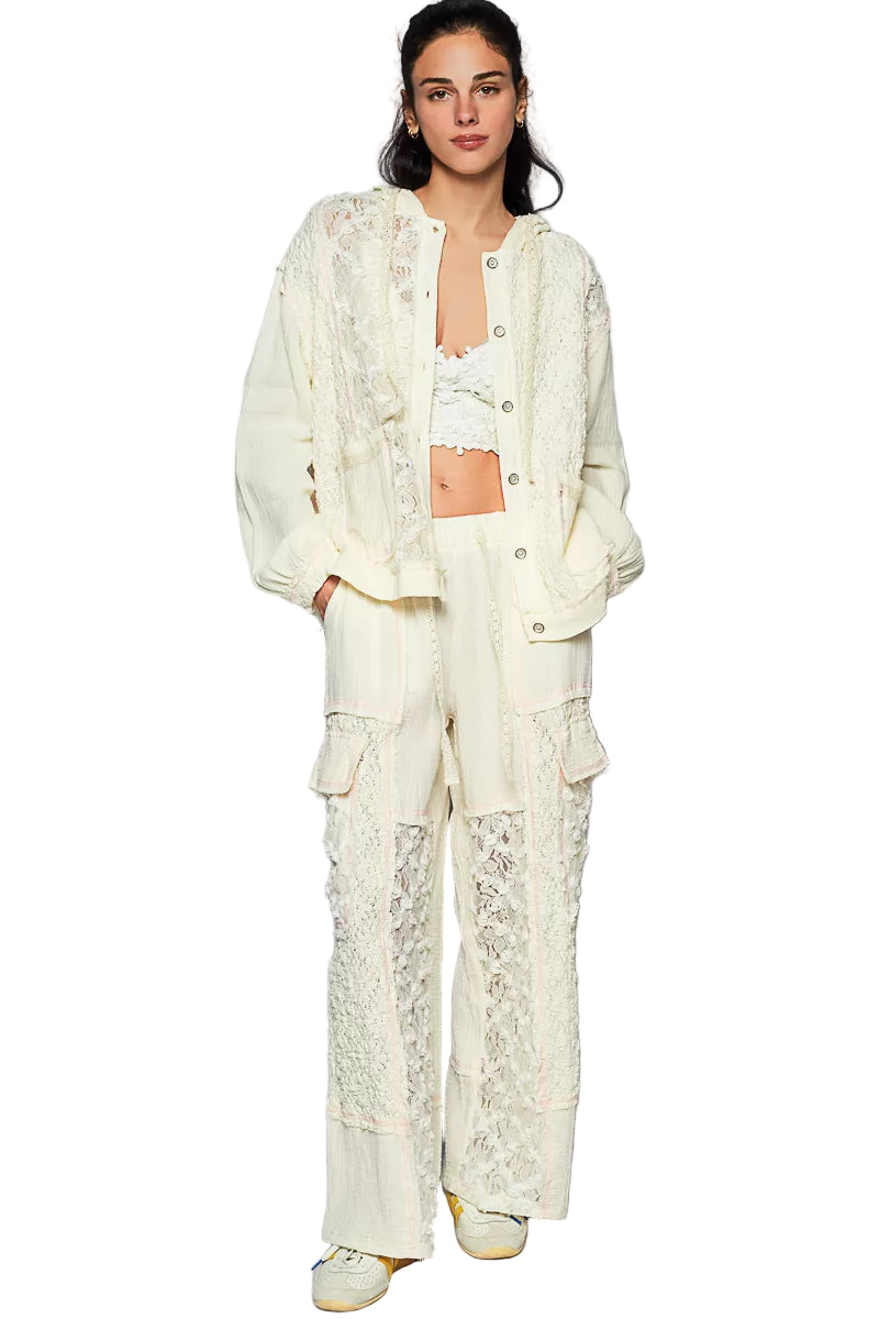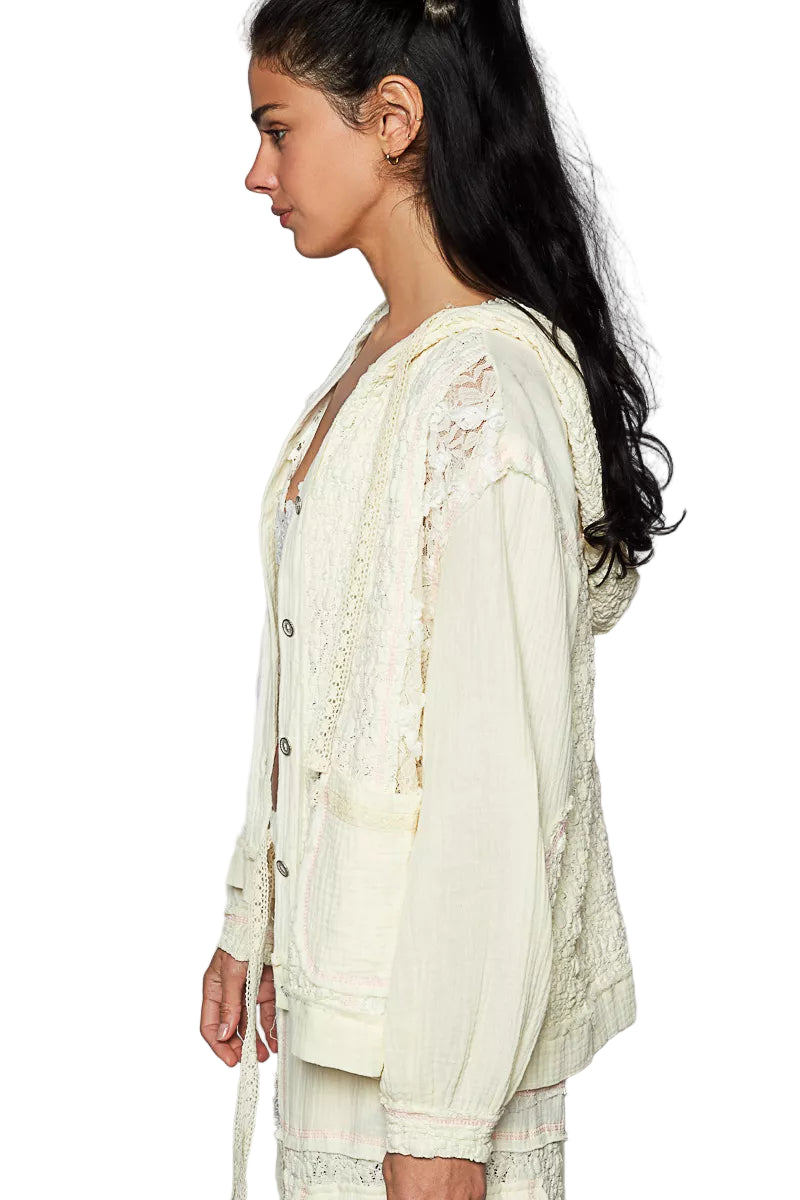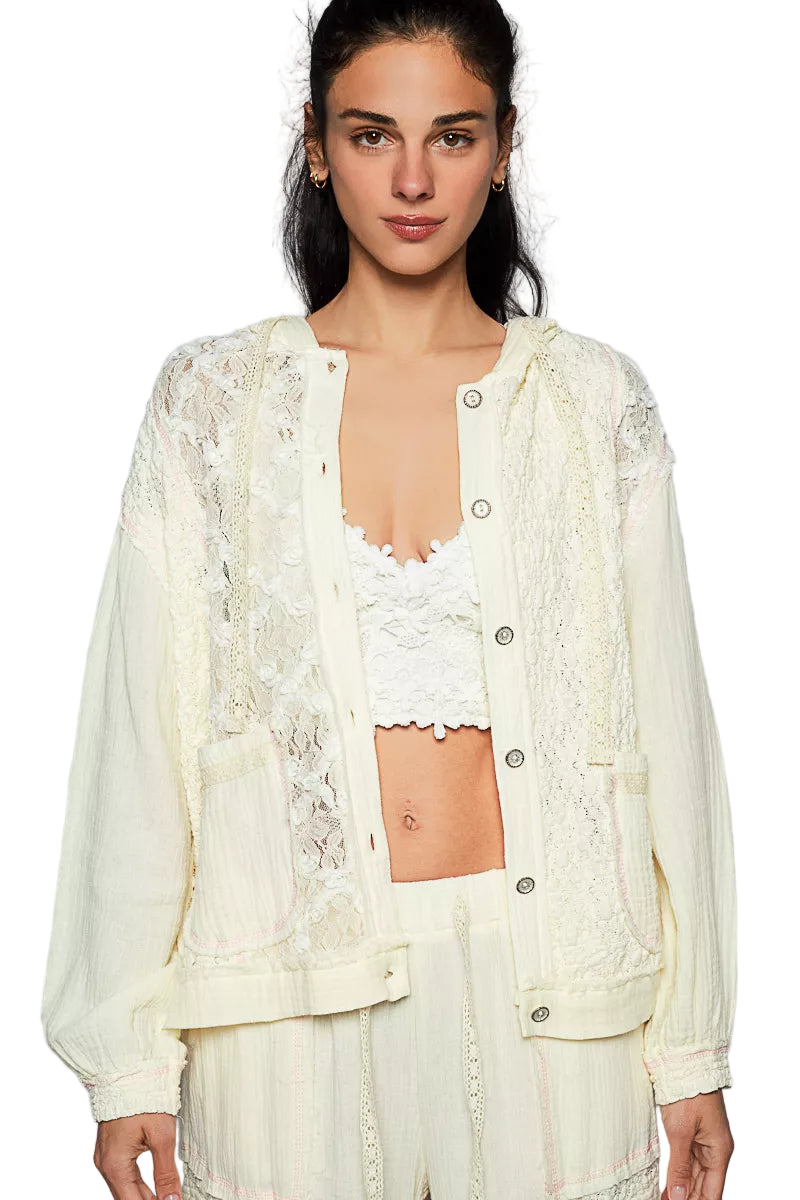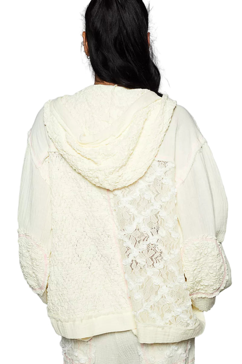 Wrap yourself in the enchanting embrace of the POL Exposed Seam Button Down Hooded Jacket with Lace Detail. This exquisite piece, adorned with delicate lace, whispers elegance and romance, making every moment feel special.