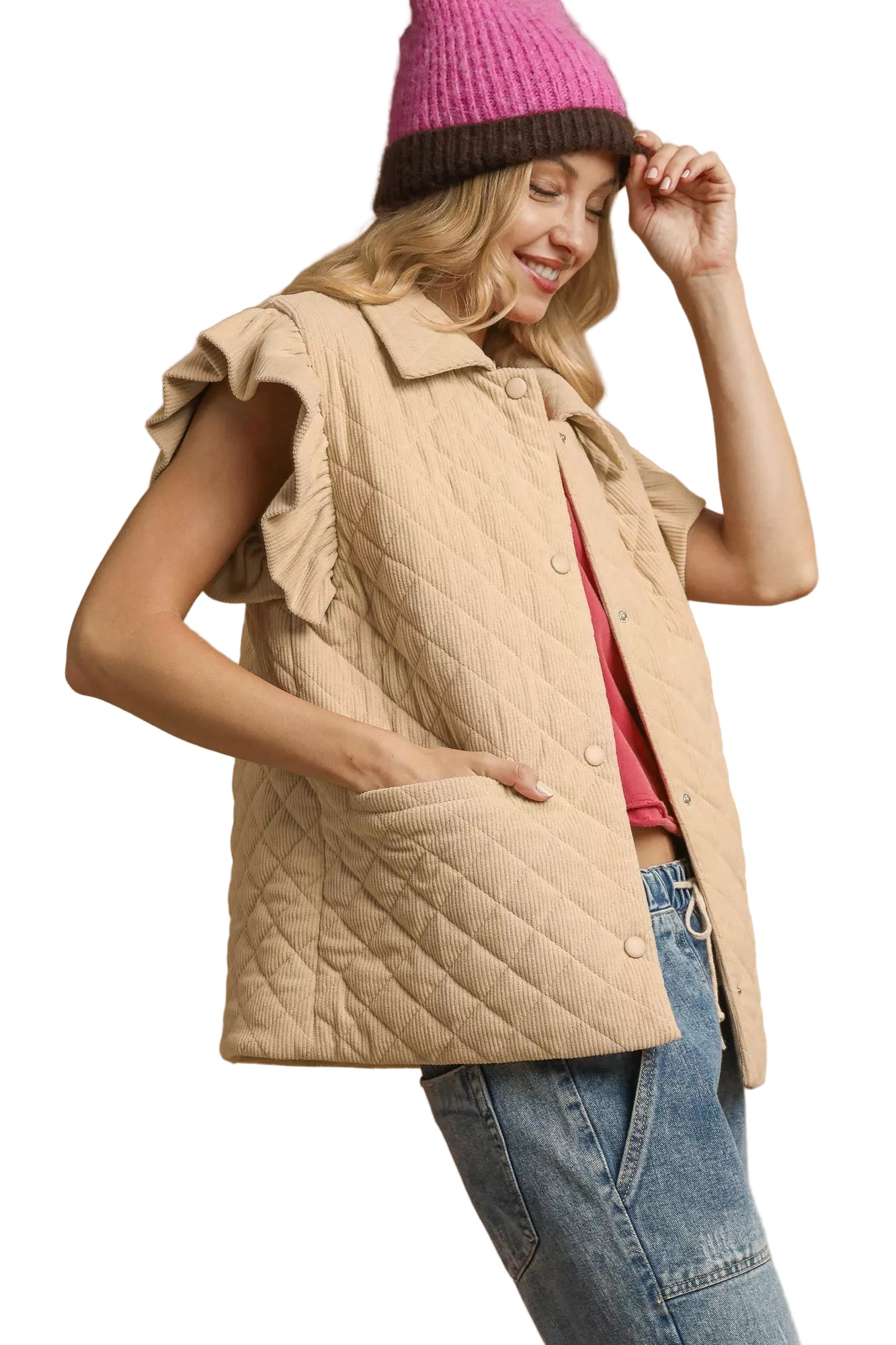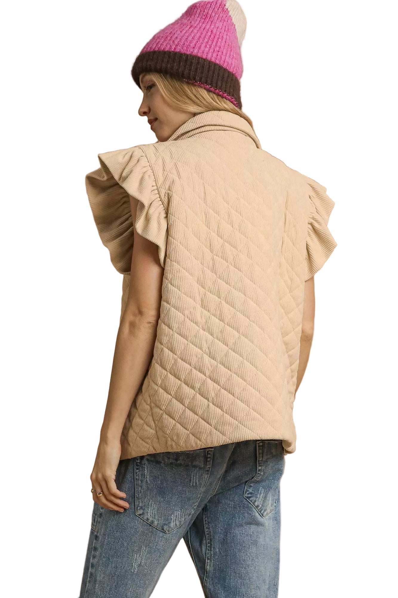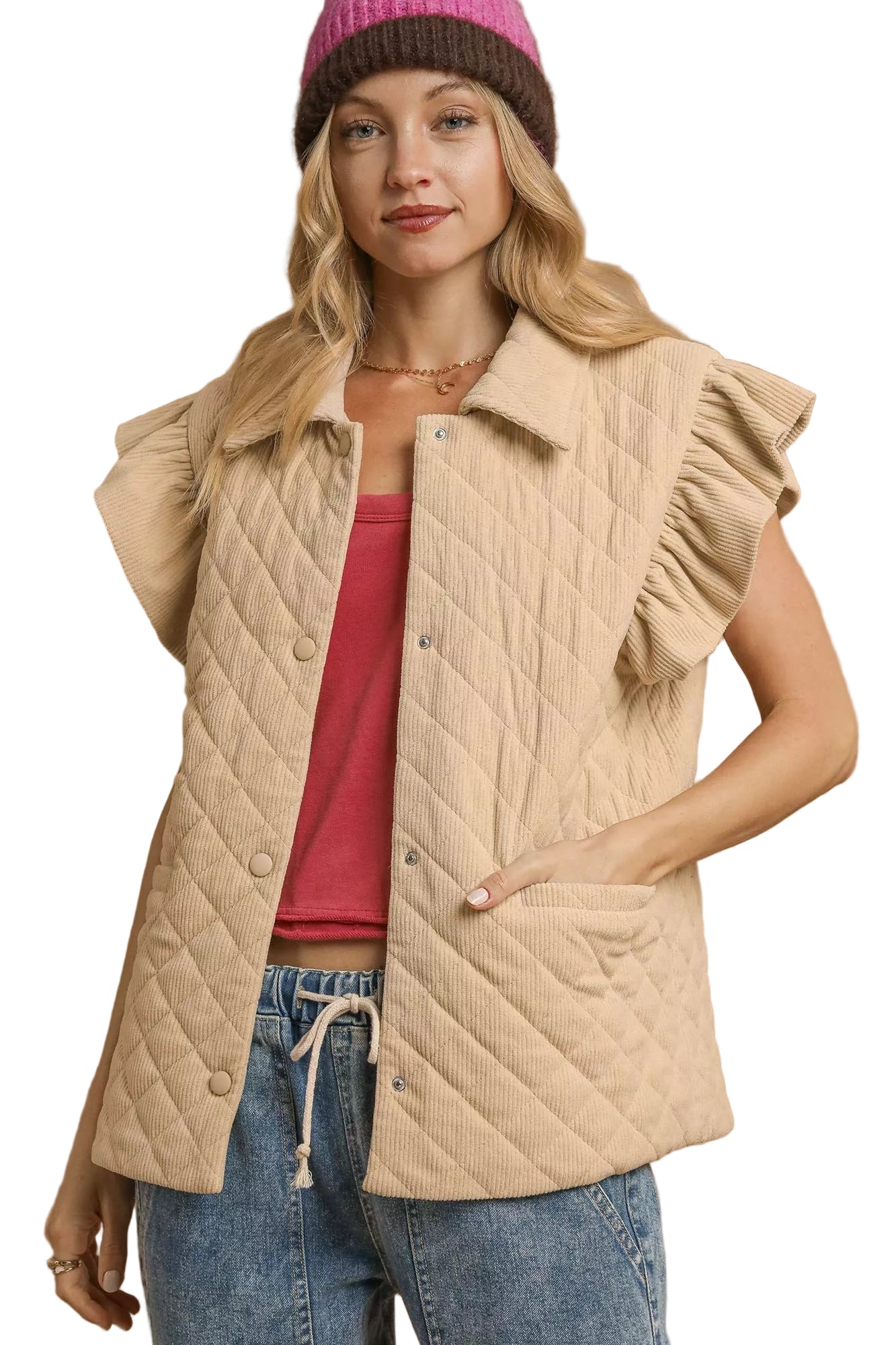Wrap yourself in the tender embrace of the Umgee Corduroy Quilted Ruffle Sleeve Vest, a piece that whispers romance with every stitch. Crafted from soft quilted corduroy, its diamond pattern evokes the warmth of cherished moments spent together, while the ruffle cap sleeves dance playfully, adding a touch of femininity to your ensemble.