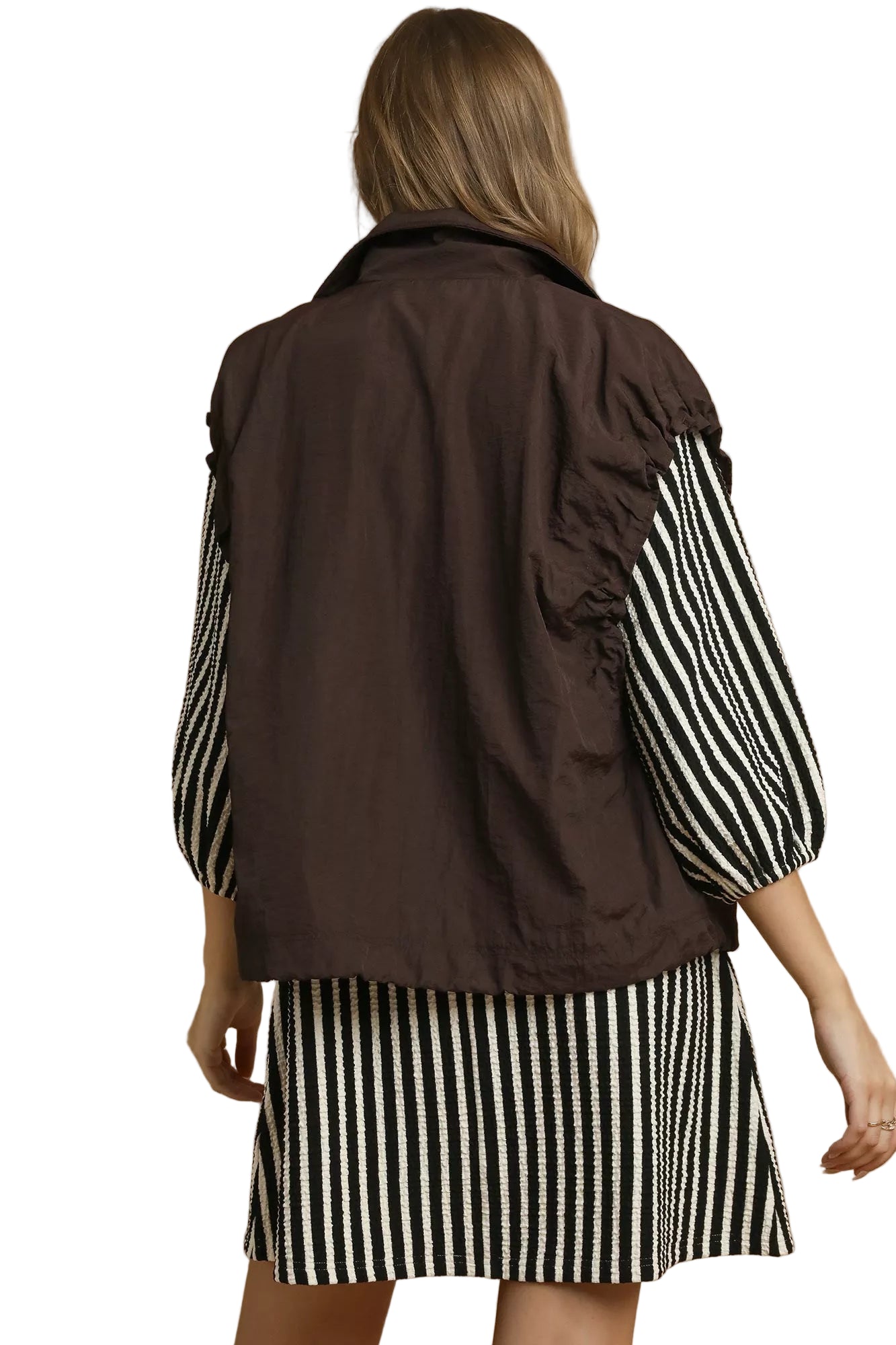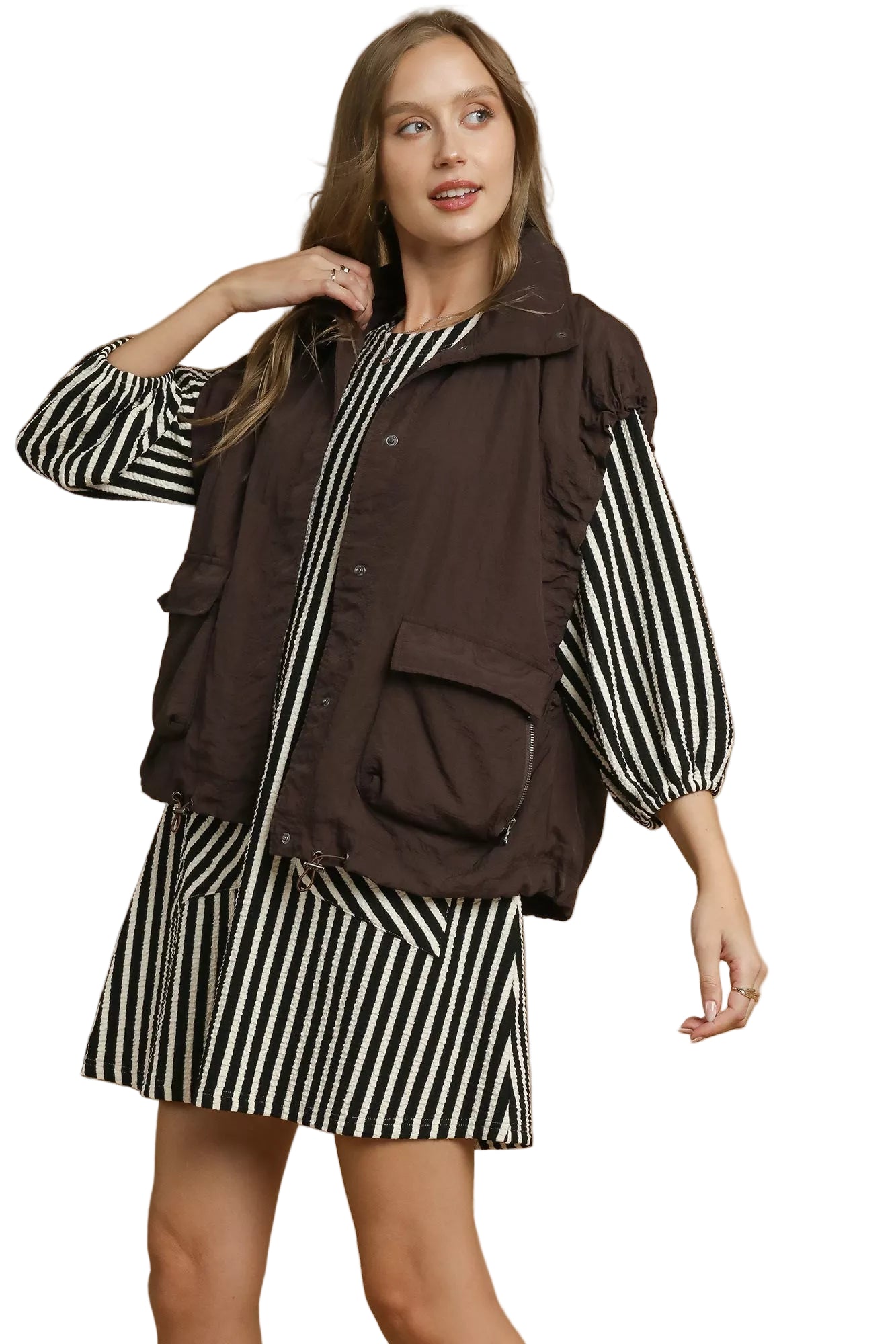 Wrap yourself in the warmth of romance with the Umgee Nylon Vest with Pockets. This enchanting brown vest coat, crafted from lightweight nylon, whispers comfort and elegance, making it a cherished companion for any occasion.
