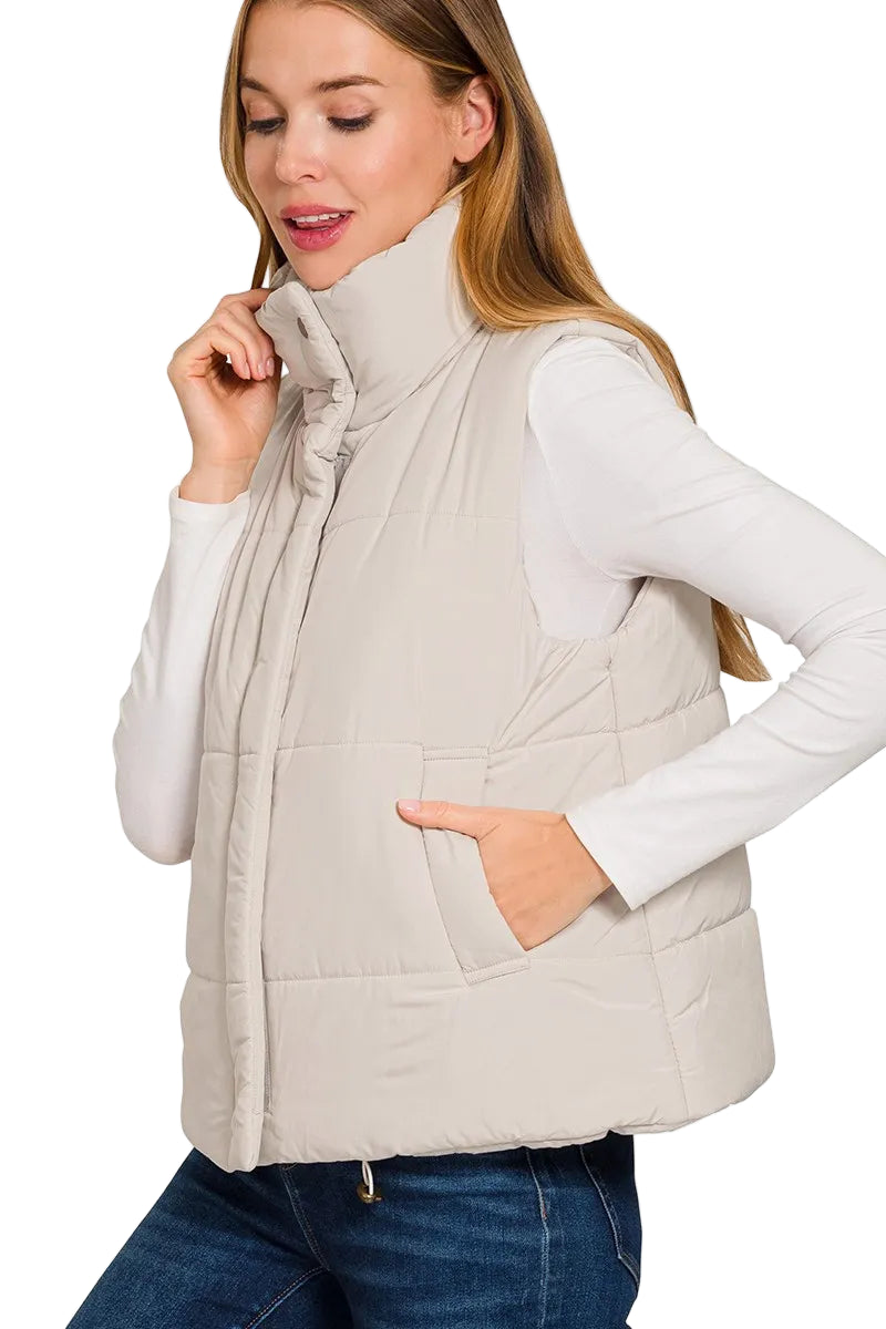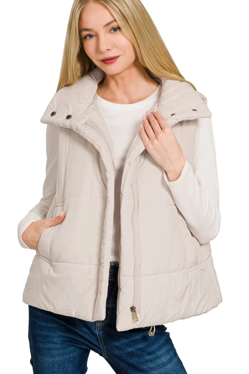 Wrap yourself in the embrace of the Zenana High Neck Zip-Up Vest Coat, where elegance meets warmth. This exquisite outerwear piece is designed to caress your silhouette, offering a high neck that whispers sweet nothings of comfort and style.