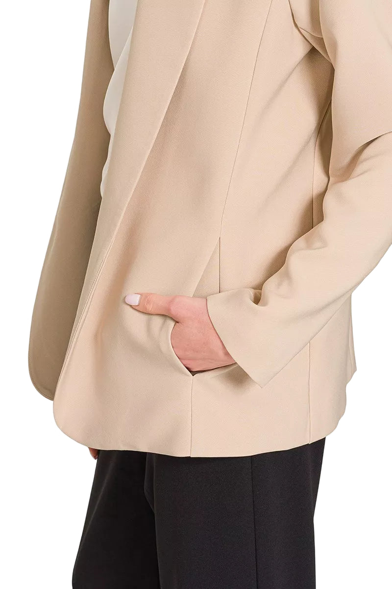 Crafted from a luxurious blend of polyester and spandex, this blazer drapes beautifully, offering a tailored fit that accentuates your silhouette. The lapel-free design and structured shoulders create a modern allure, perfect for both professional meetings and intimate evenings.