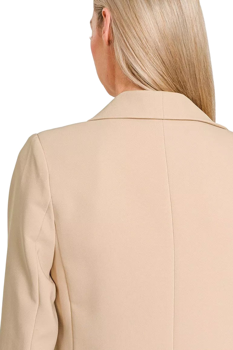 Embrace elegance with the Zenana Woven Long Sleeve Blazer, a piece that whispers romance in every stitch. Its timeless nude beige hue caresses the senses, effortlessly enhancing your wardrobe with a touch of sophistication.