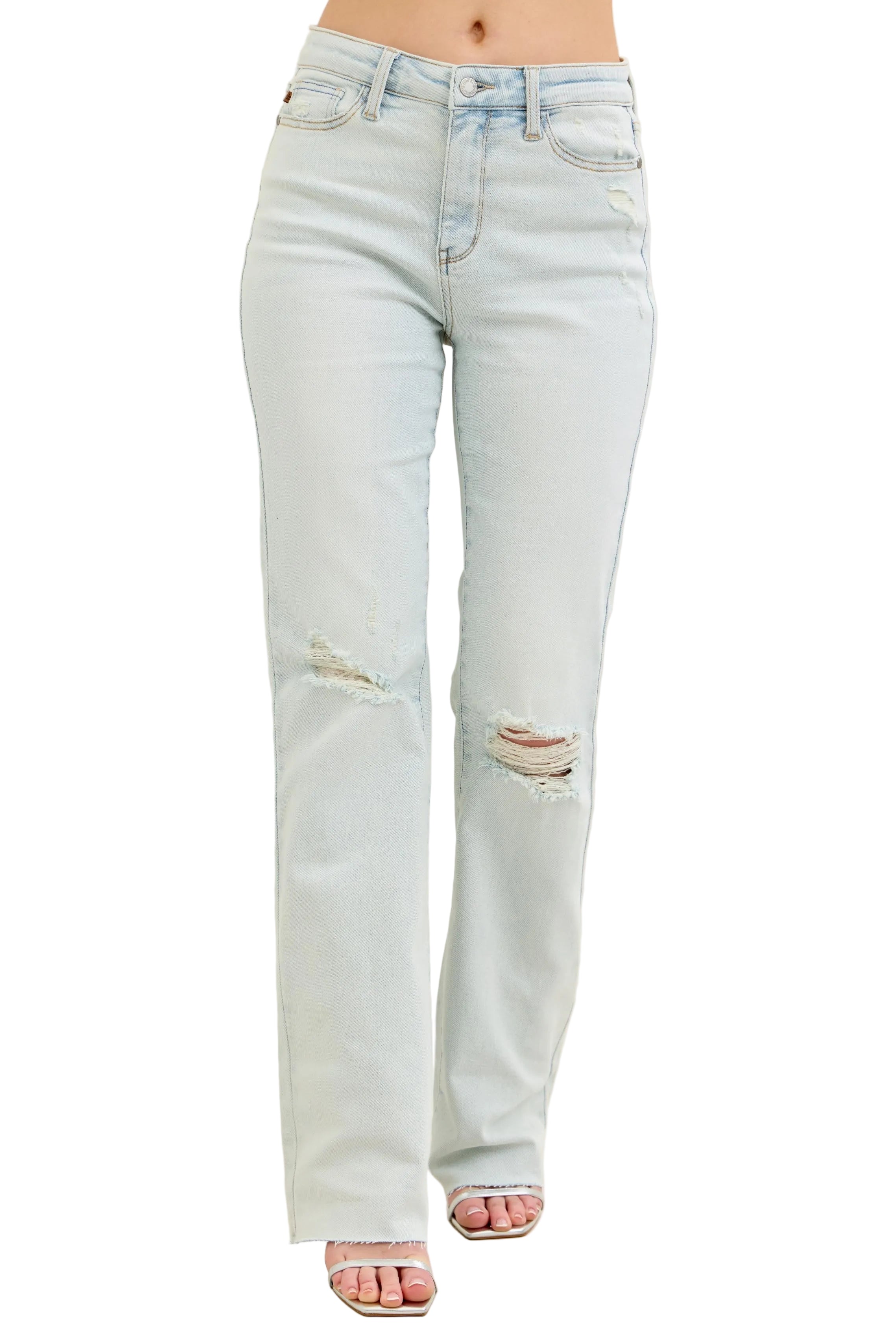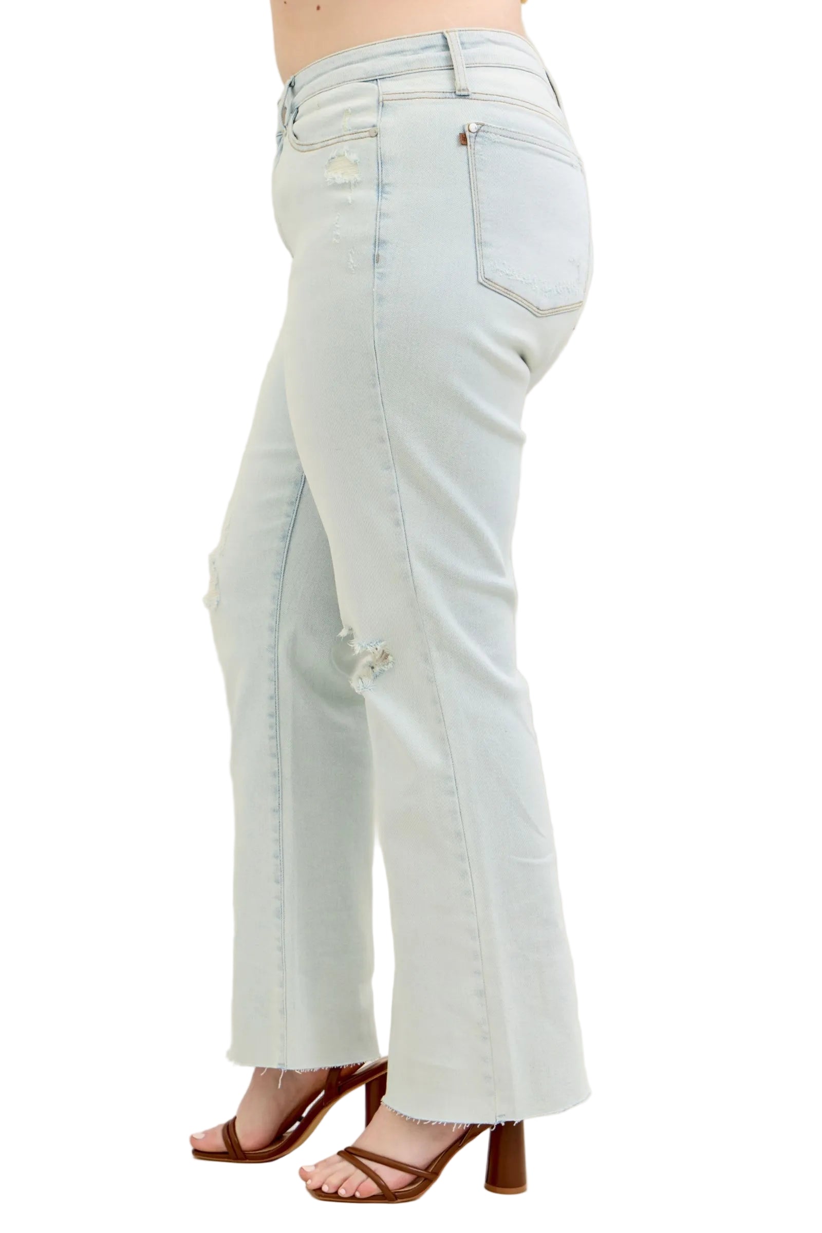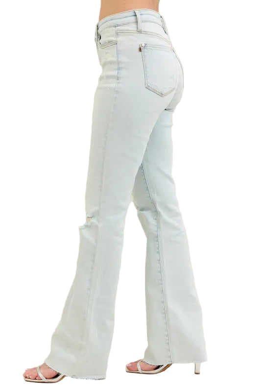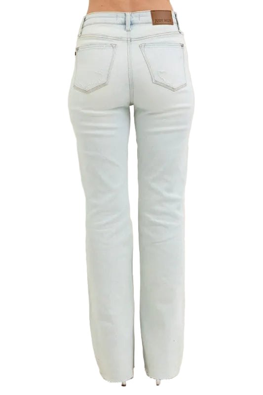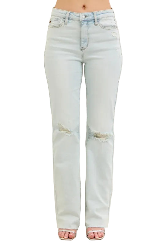 Embrace the allure of effortless elegance with the Judy Blue Full Size Destroy & Fray Hem Bootcut Jeans. These enchanting light blue jeans caress your curves, whispering sweet nothings of comfort and style. The high-waisted design accentuates your silhouette, while the delicate distressed detailing adds a touch of romance to your wardrobe.