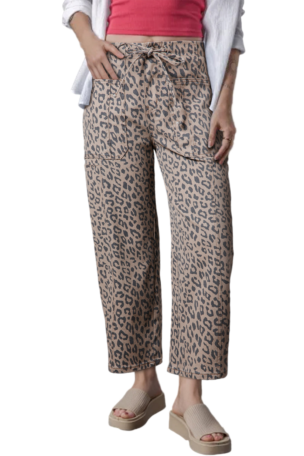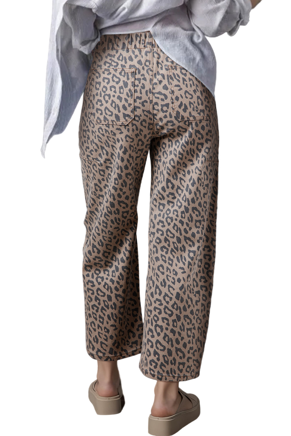 Embrace your wild side with the Khaki Leopard Printed Drawstring Elastic Waistband Pocketed Wide Leg Jeans. These enchanting jeans whisper tales of adventure, inviting you to dance through the day with effortless grace.