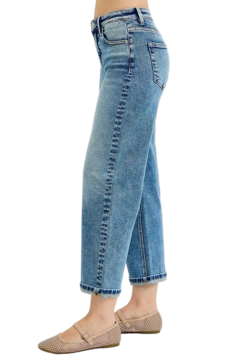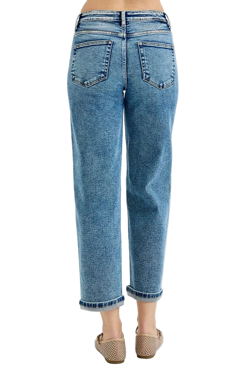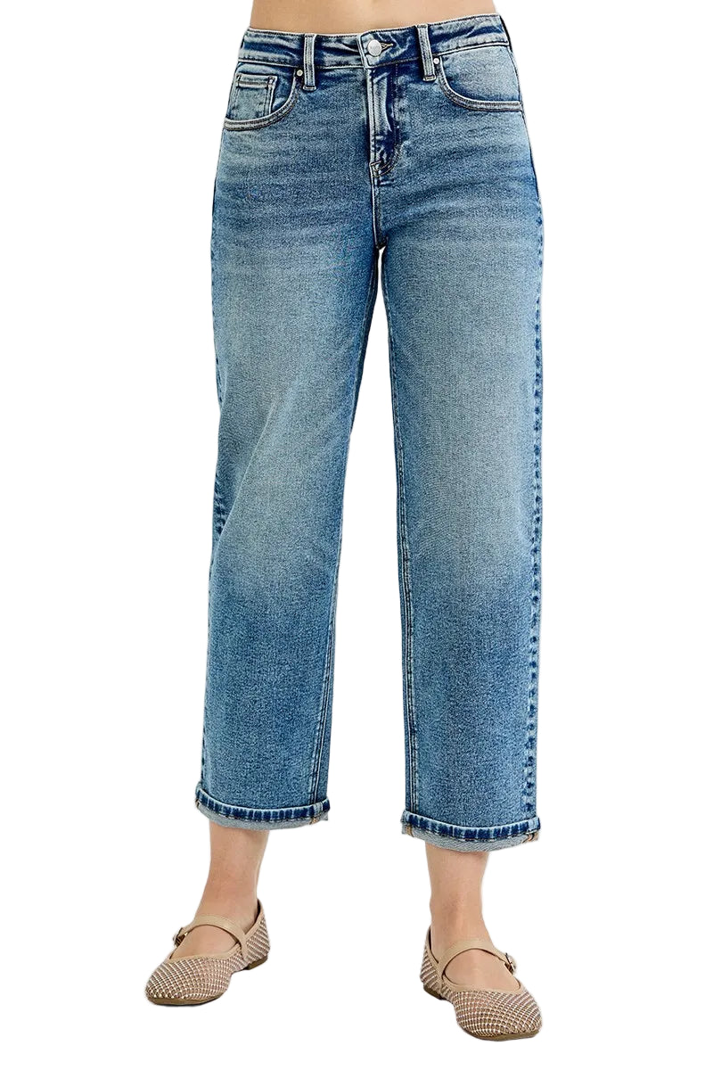 Embrace the romance of effortless style with the RISEN Full Size High Rise Crop Boyfriend Jeans. Their vintage-inspired medium blue wash whispers tales of timeless elegance, while the relaxed boyfriend fit cradles your curves in a gentle embrace.