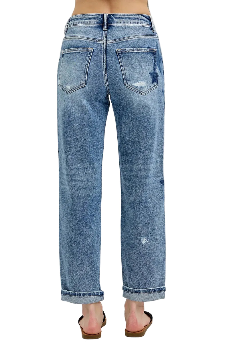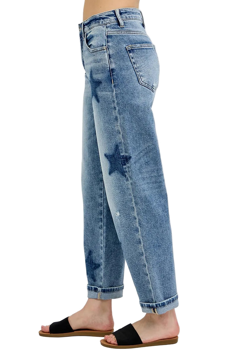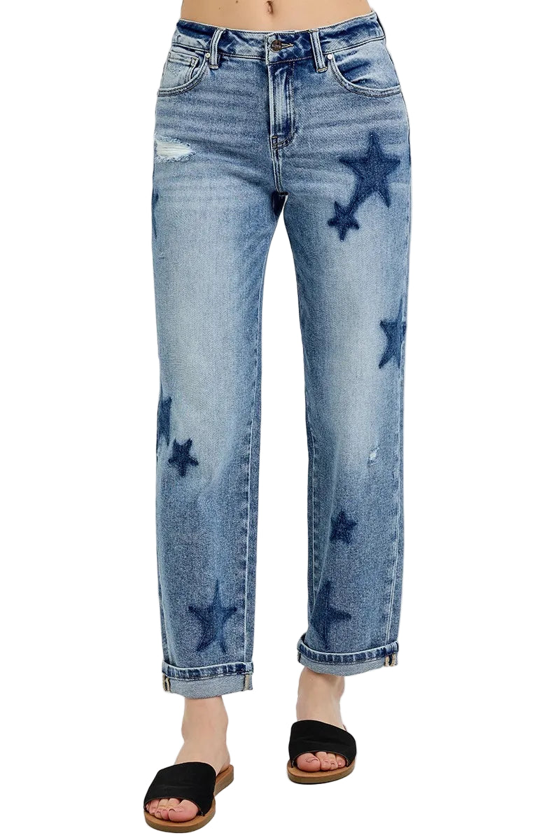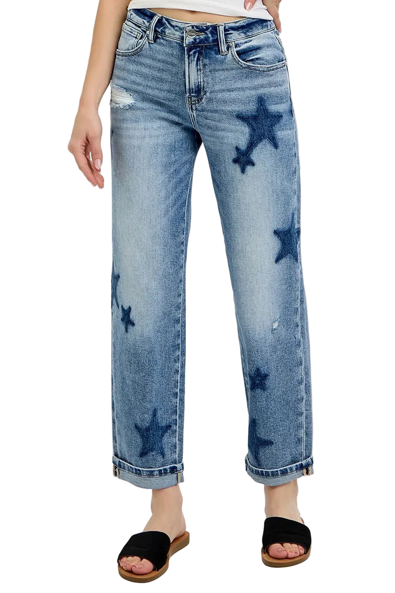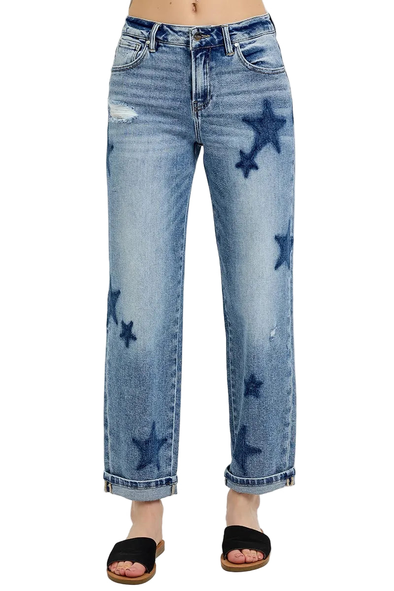 Embrace the allure of effortless style with our Full Size Mid Rise Boyfriend Star Shadow Detail Cuffed Jeans. These enchanting jeans, crafted from a luxurious cotton blend, caress your curves while offering a relaxed fit that whispers comfort.