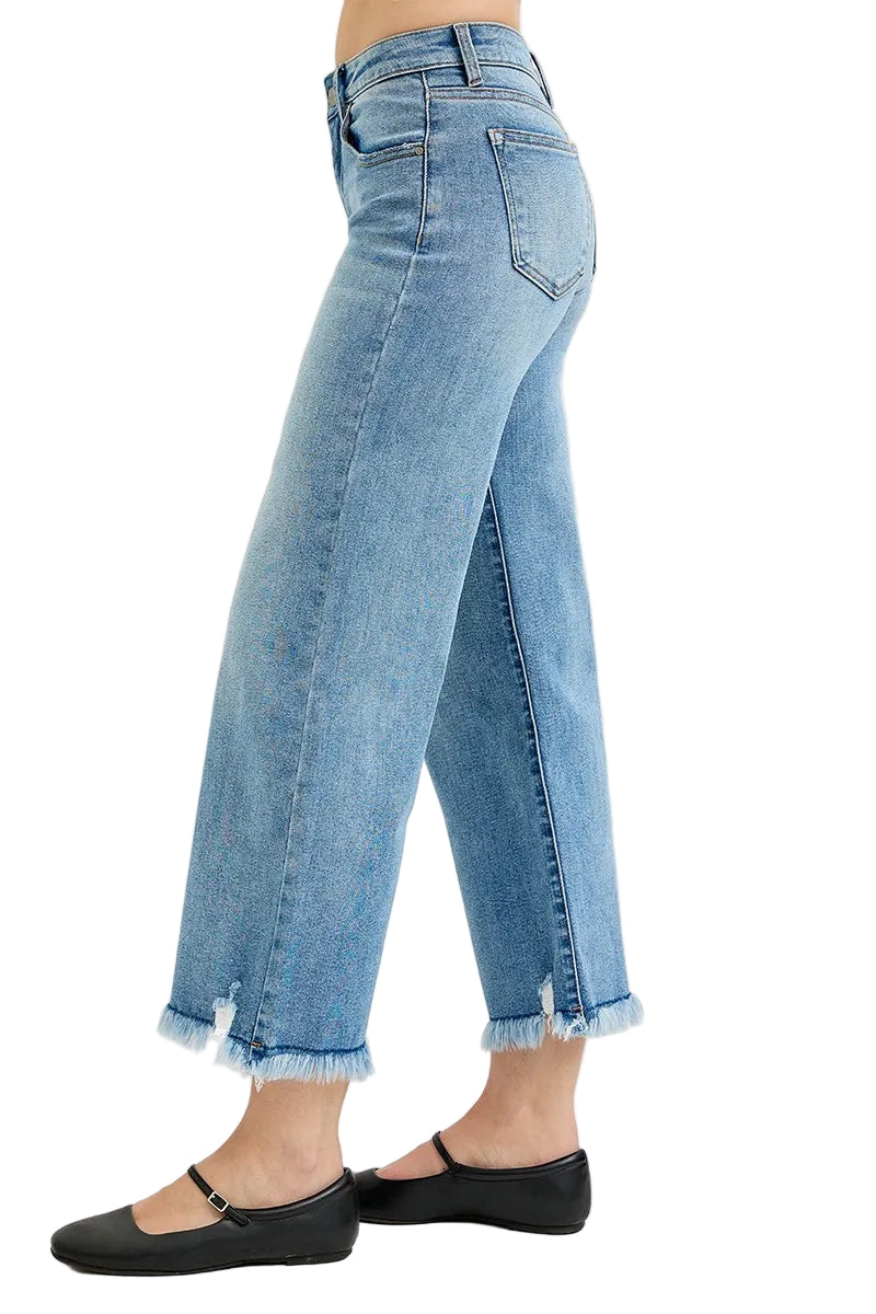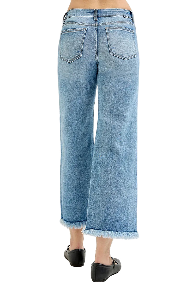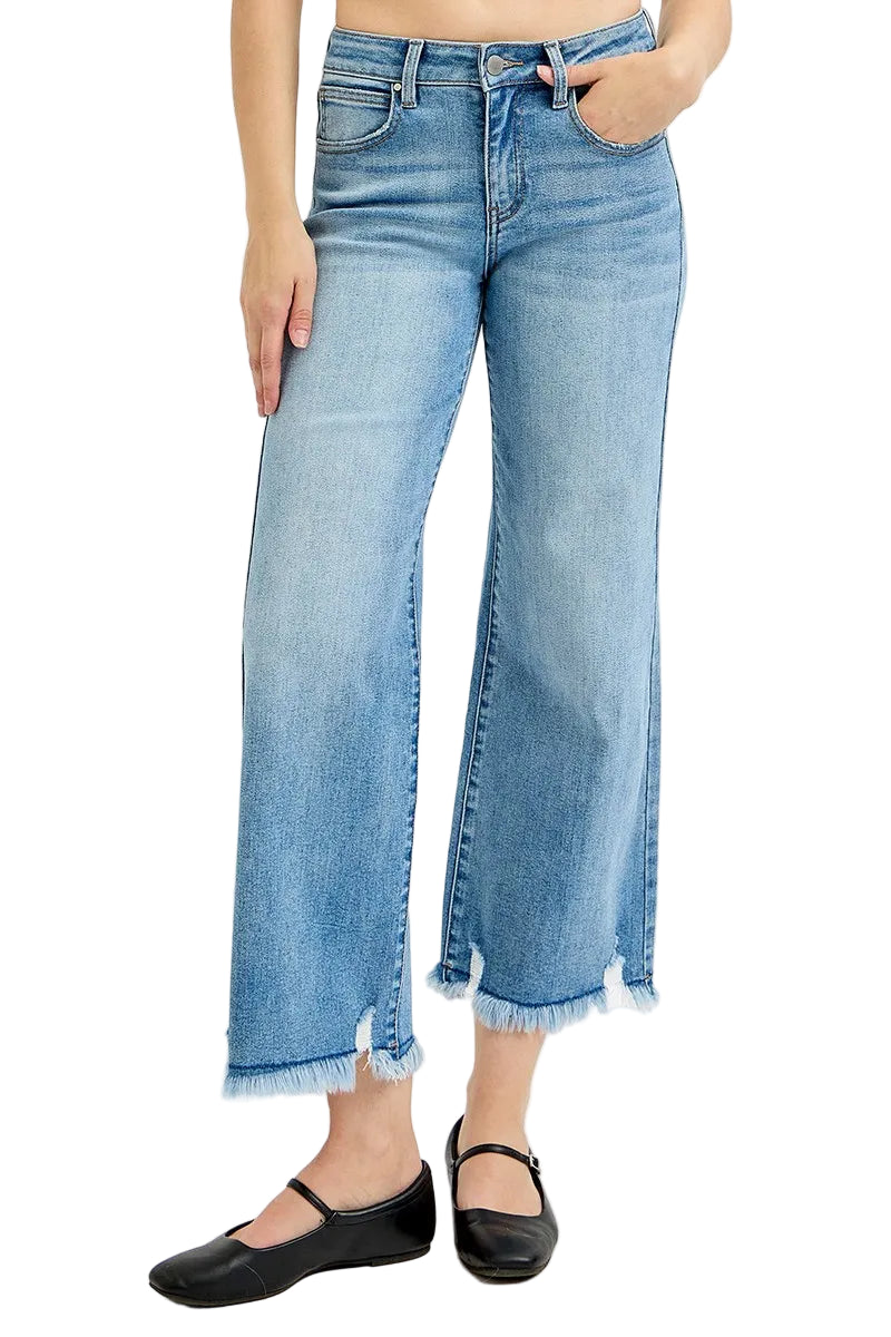 Embrace the allure of effortless elegance with the RISEN Full Size Mid Rise Crop Wide Leg Jeans. Crafted from premium stretch denim, these jeans envelop you in a soft, light wash blue that whispers romance with every wear.