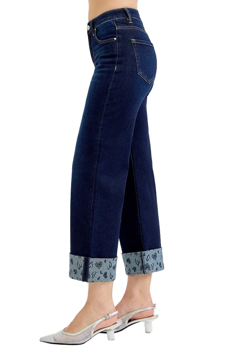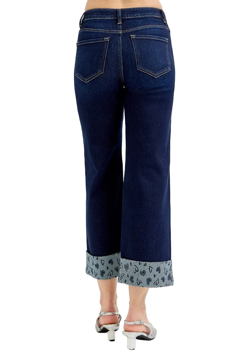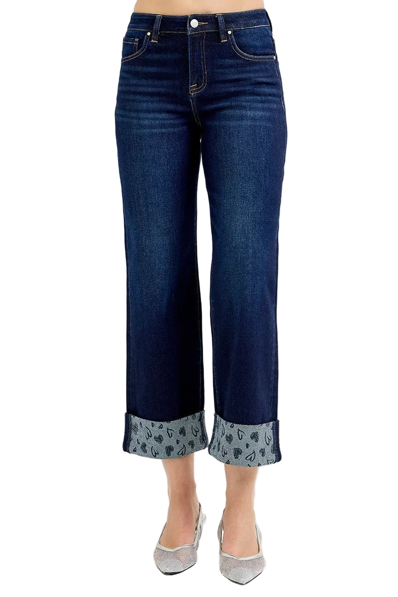 Embrace the romance of effortless style with the RISEN Full Size Mid Rise Fit Crop Wide With Printed Cuff Jeans. These enchanting wide-leg jeans, crafted from a luxurious cotton blend, caress your curves while offering a playful twist with their charming polka dot cuffs.