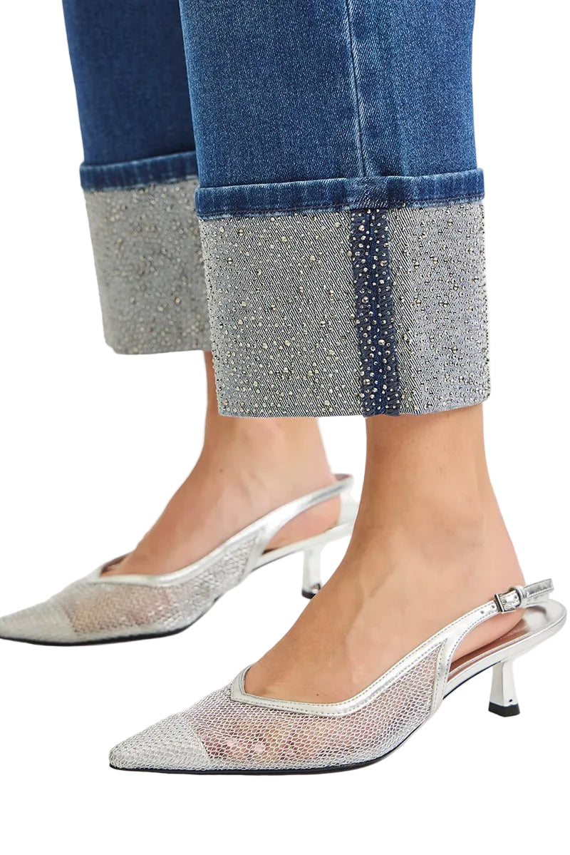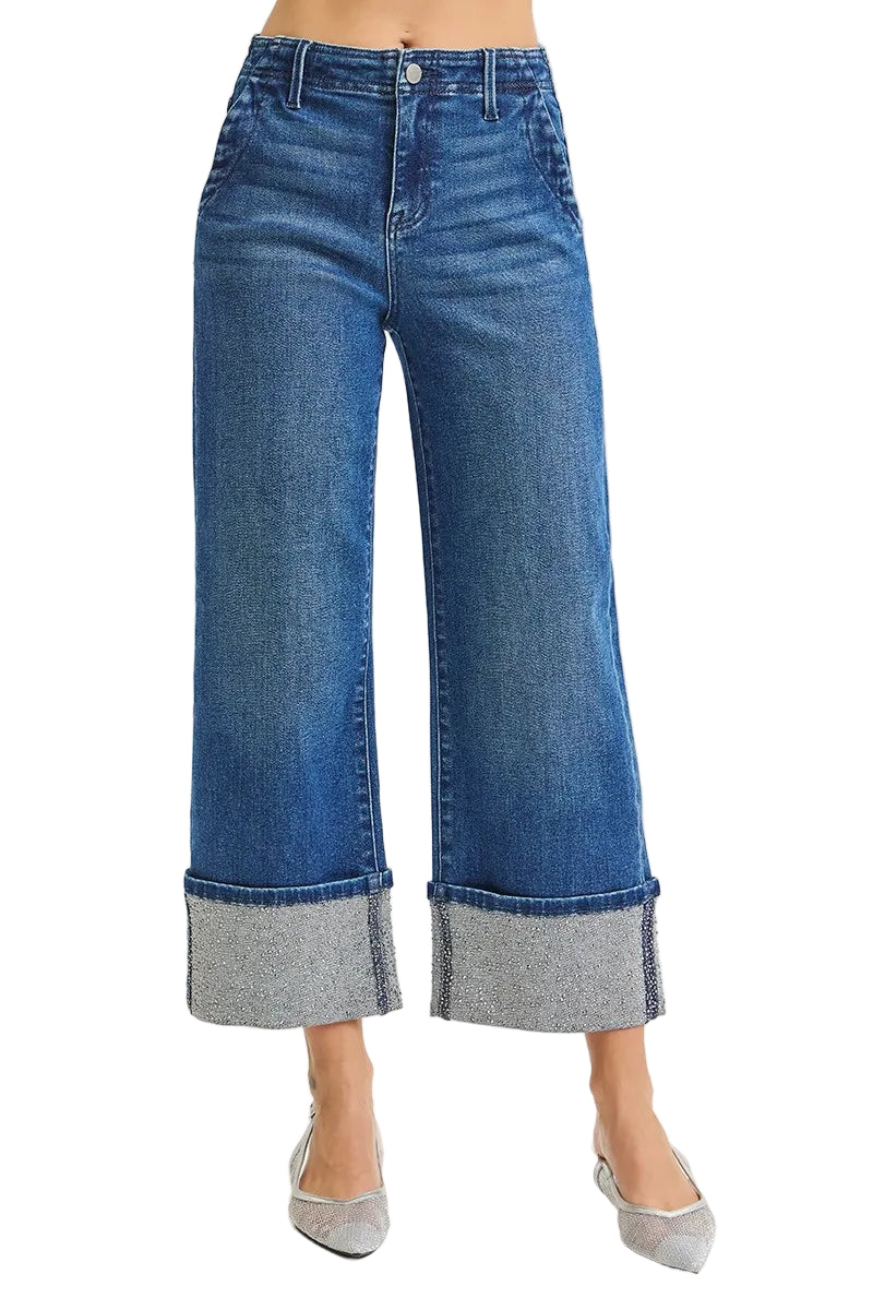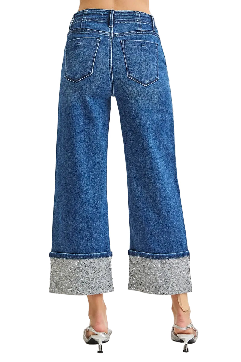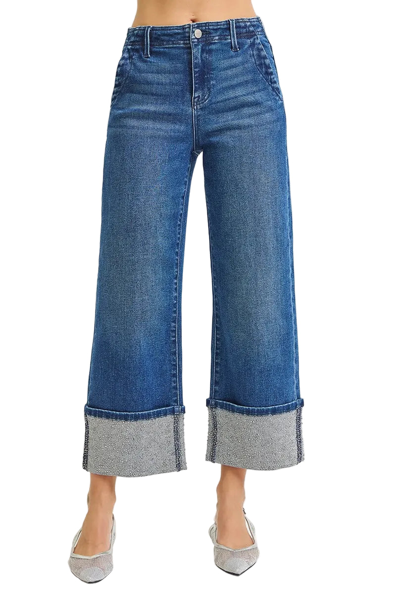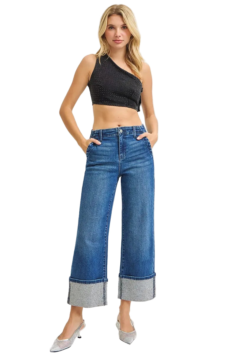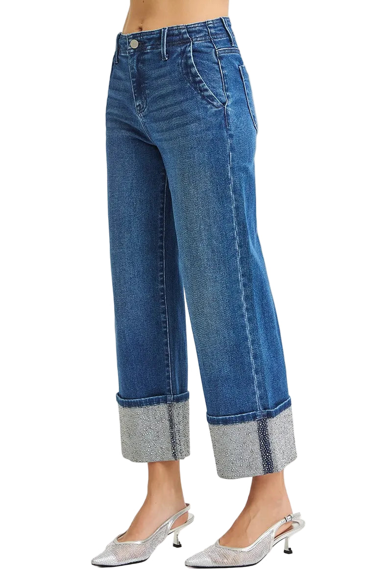 Indulge in the romance of fashion with the RISEN High Rise Ankle Wide Rhinestone Cuffed Jeans. These exquisite jeans embrace your silhouette, offering a high-rise fit that flatters your curves while ensuring comfort. The delicate rhinestone cuffs glisten like stars, adding a touch of glamour to your every step.