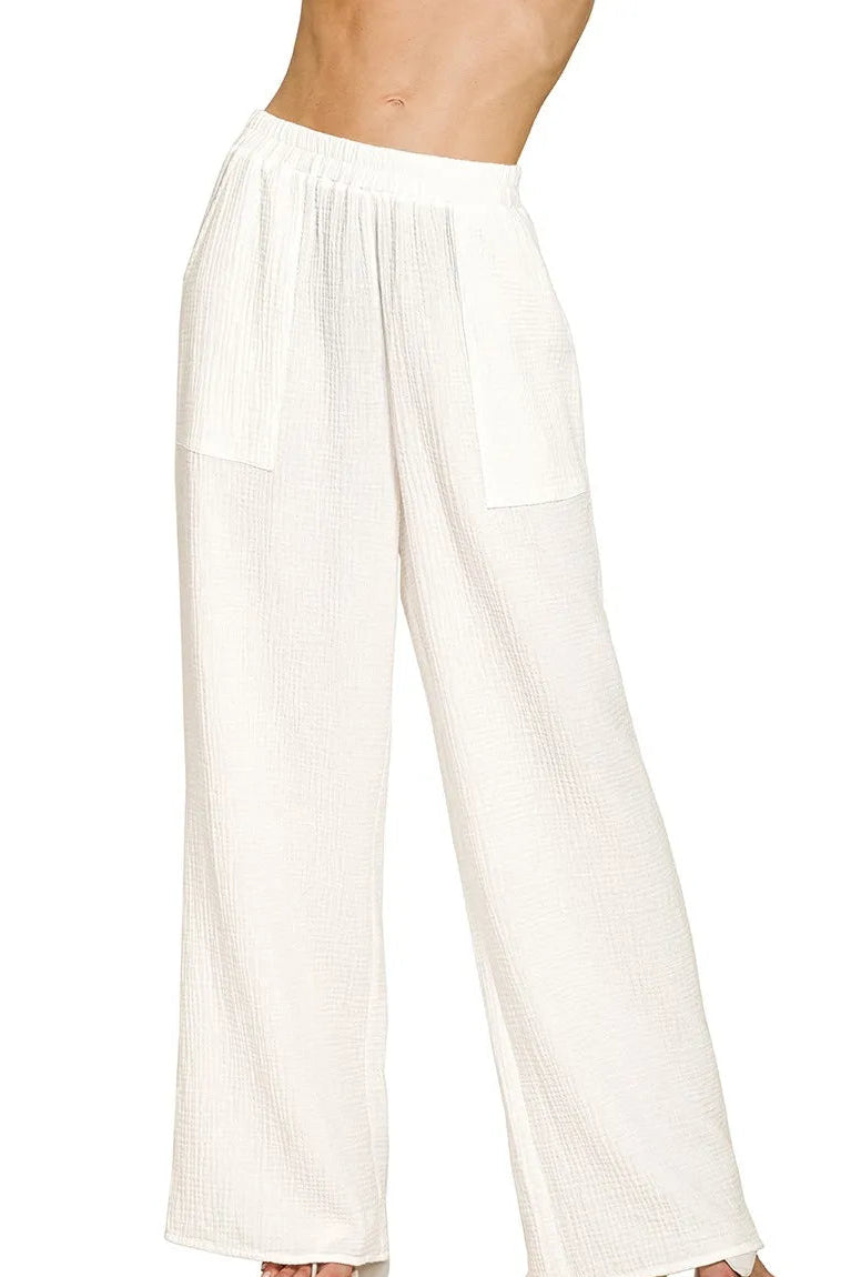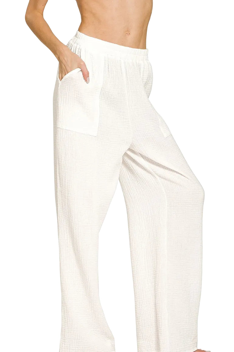 Embrace the gentle caress of summer with the Zenana Double Gauze Elastic Band Pants, where comfort meets elegance. Crafted from 100% cotton, these pants whisper sweet nothings against your skin, inviting you to revel in their lightweight embrace.