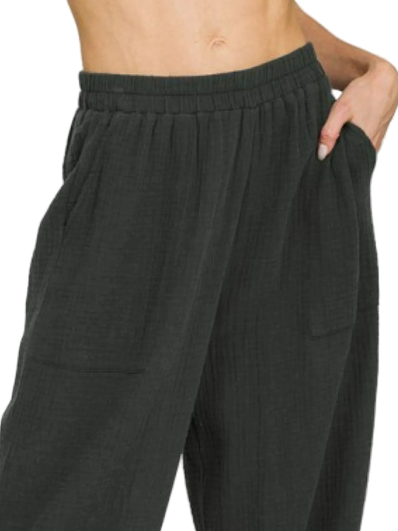 Embrace the gentle caress of summer with the Zenana Double Gauze Elastic Band Pants, where comfort meets elegance. Crafted from 100% cotton, these pants whisper sweet nothings against your skin, inviting you to revel in their lightweight embrace.