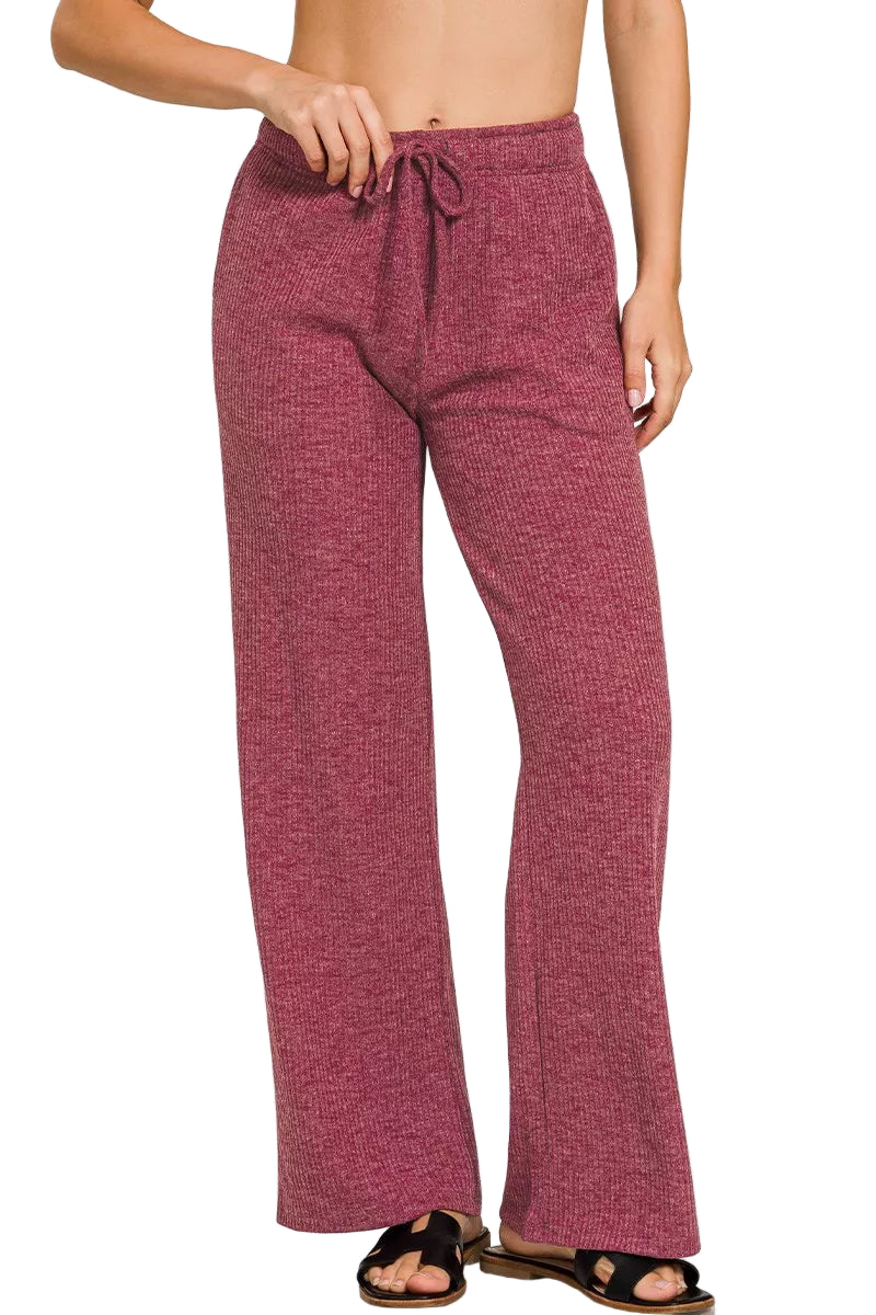 Embrace the allure of comfort with the Zenana Ribbed Drawstring Lounge Pants, where elegance meets relaxation. Crafted from a sumptuous heathered burgundy fabric, these pants wrap you in a warm embrace, inviting you to unwind in style.