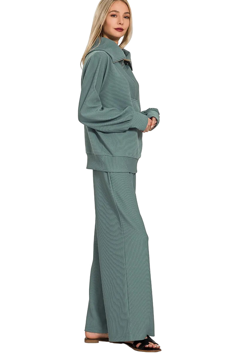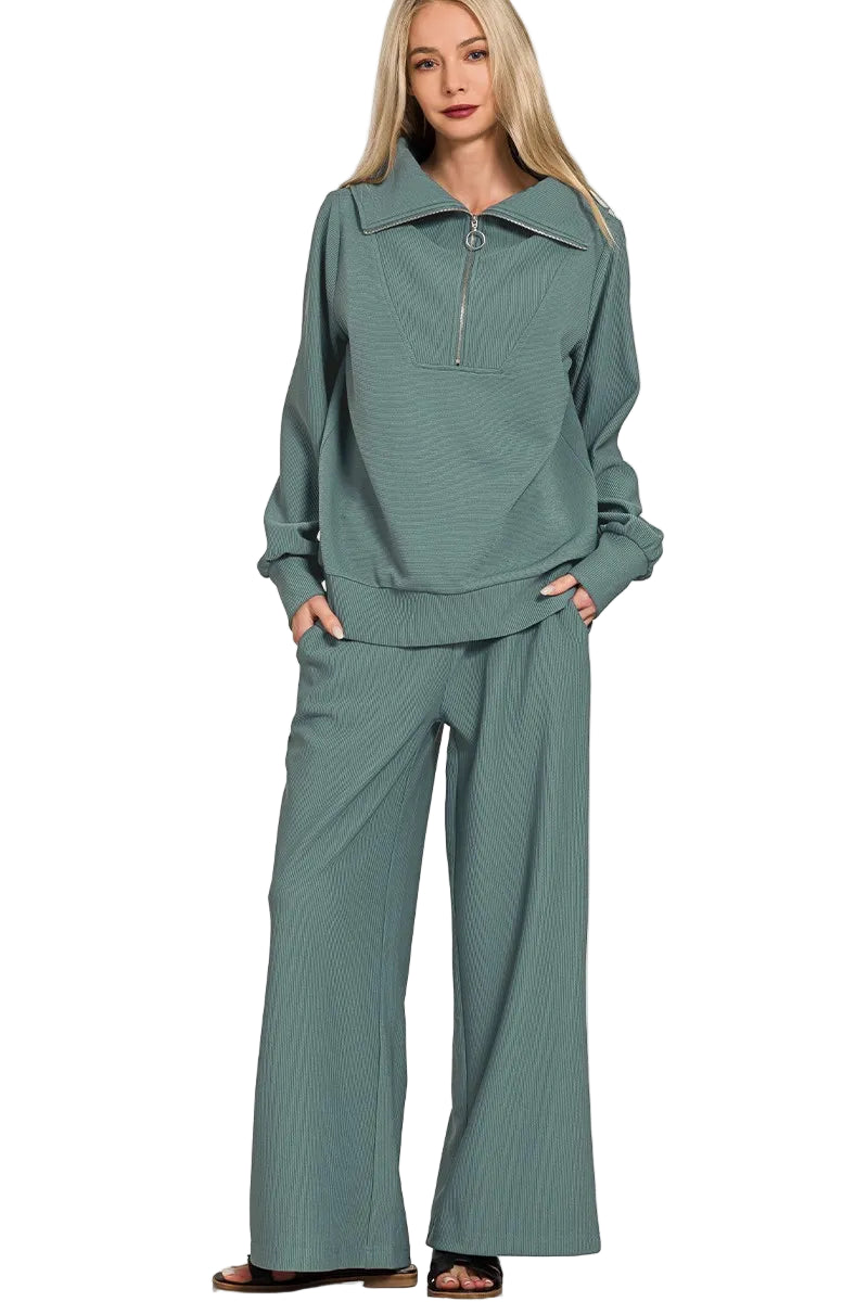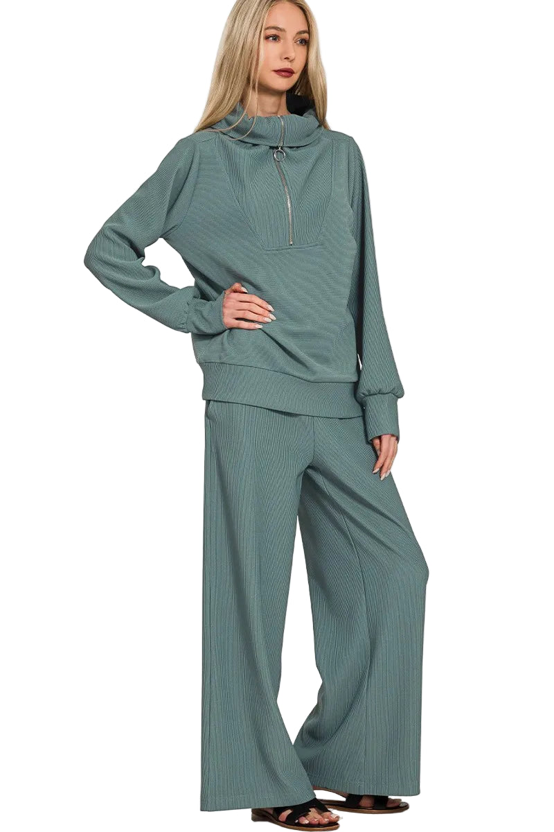 Wrap yourself in the tender embrace of the Zenana Ribbed High Neck Half Zip Pullover & Pants Set, where comfort meets elegance. The soft ash jade hue whispers of serene afternoons spent in quiet bliss, while the ribbed texture invites you to indulge in its gentle caress.