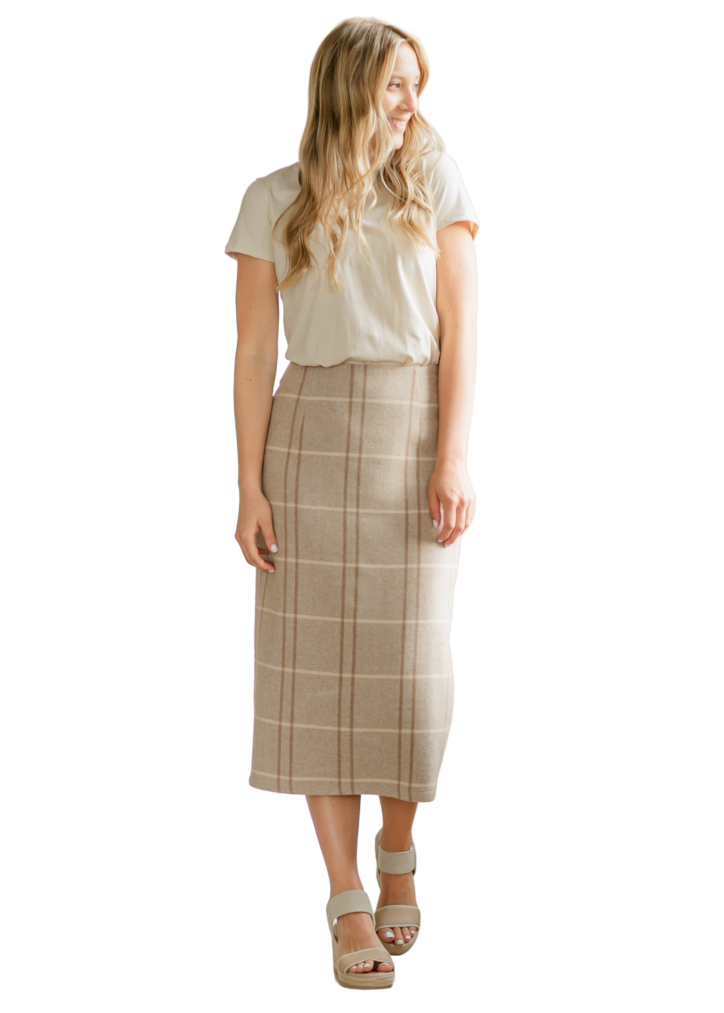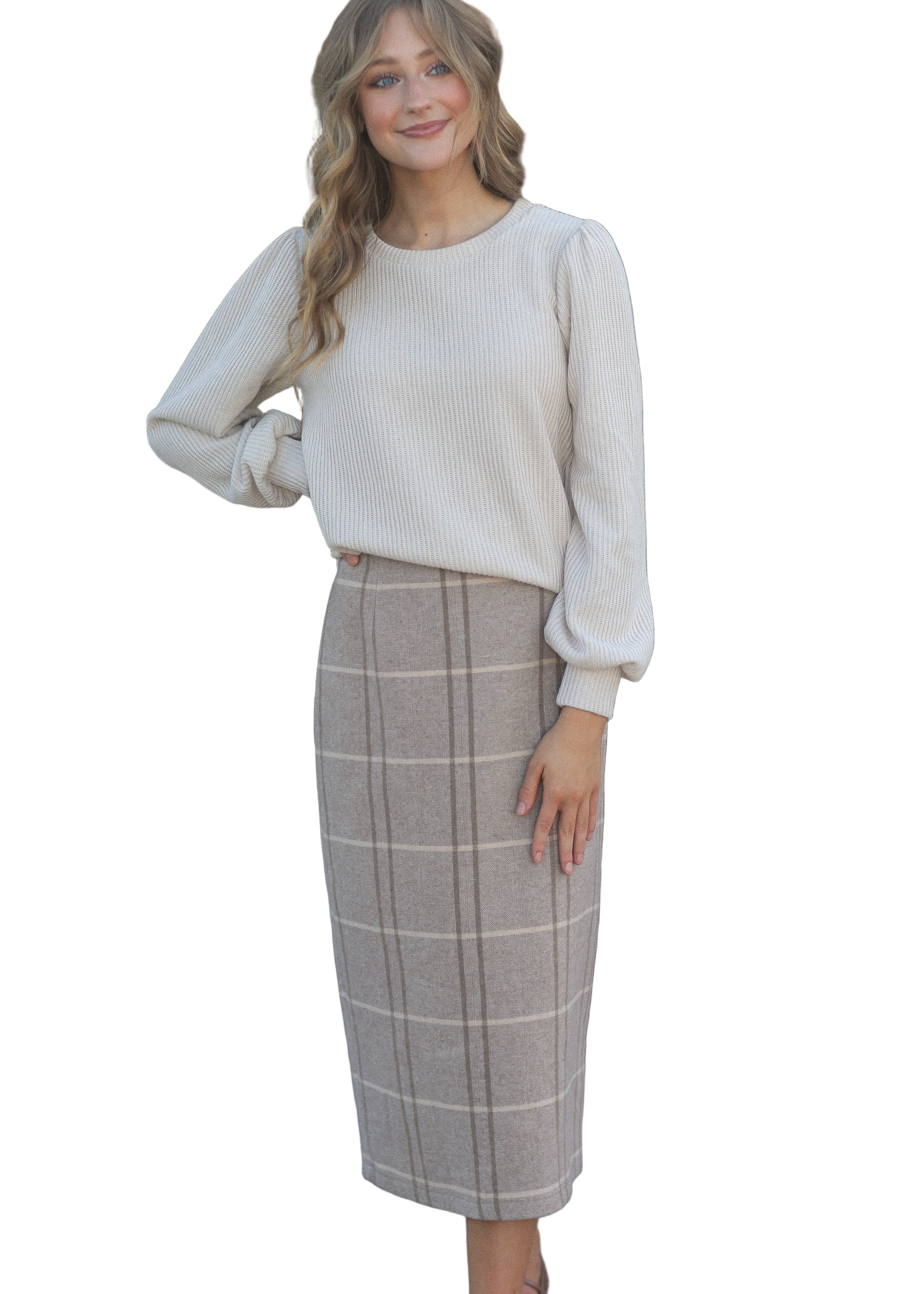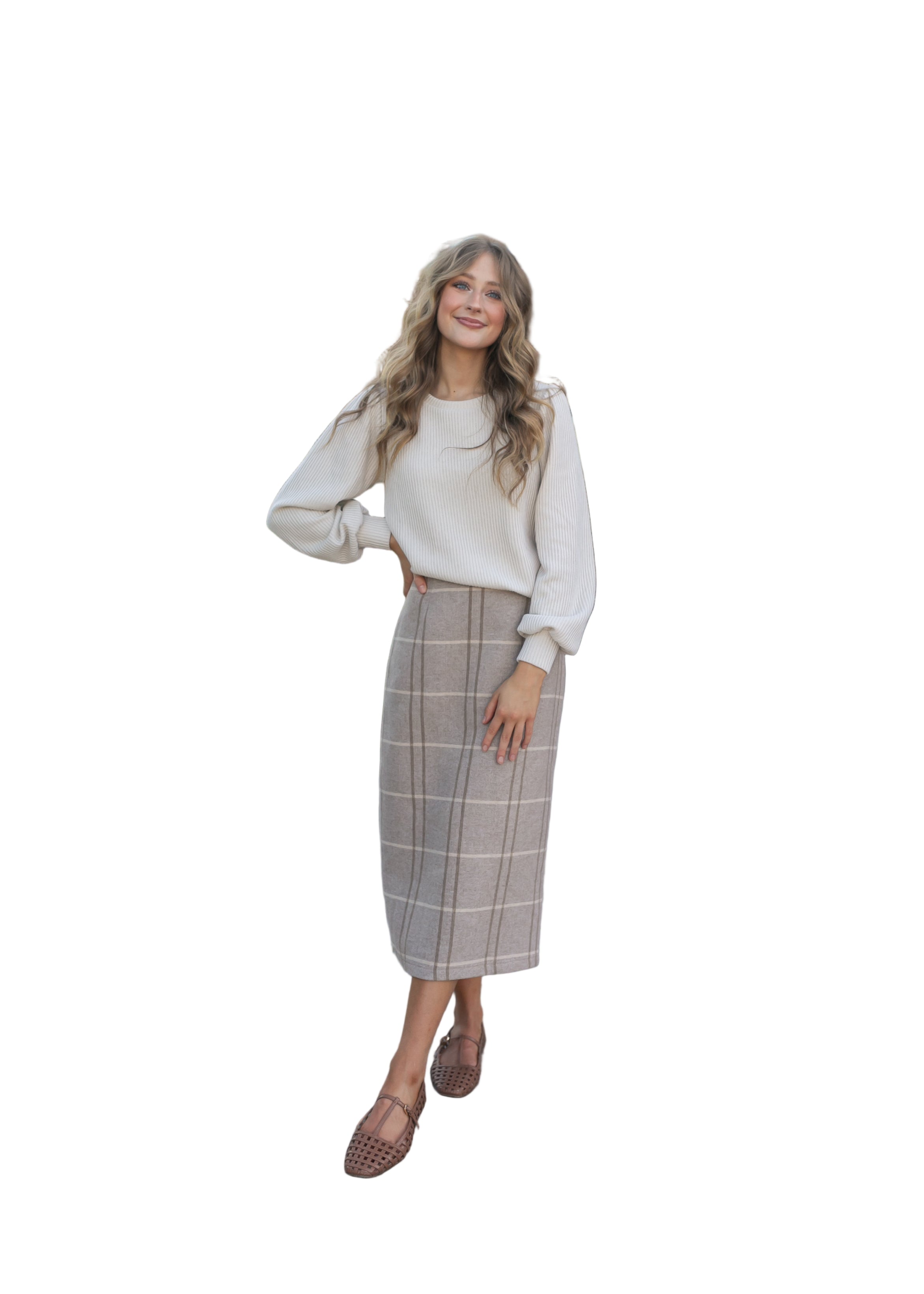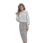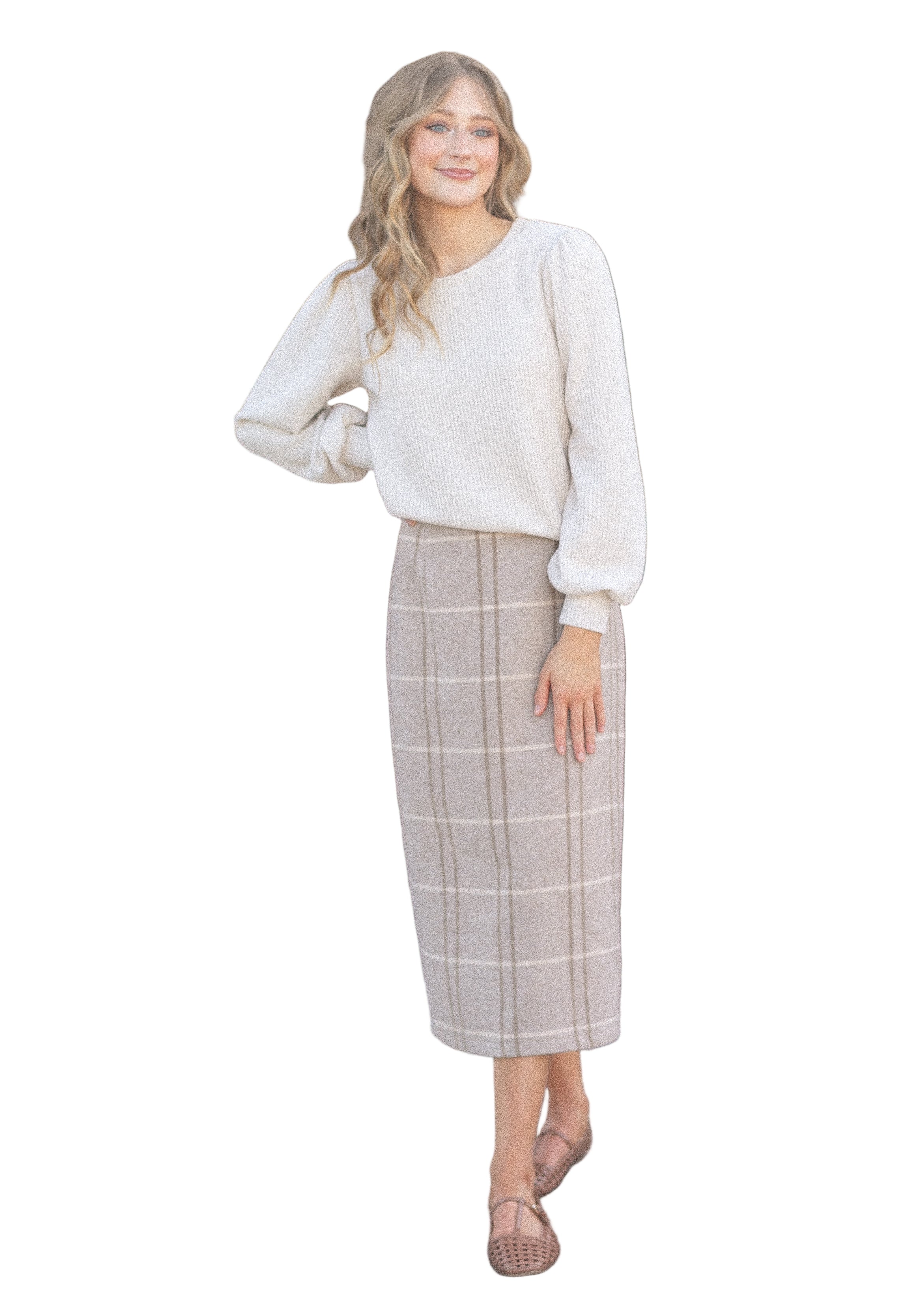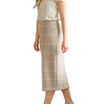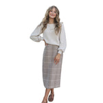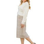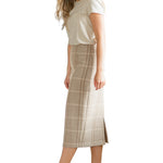 Embrace the allure of timeless elegance with the Calista Plaid Wool Midi Pencil Skirt. This enchanting piece weaves together classic structure and soft sophistication, inviting you to indulge in its warm wool blend. The neutral plaid dances gracefully, whispering tales of romance and charm.