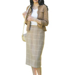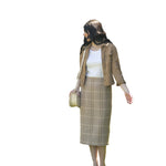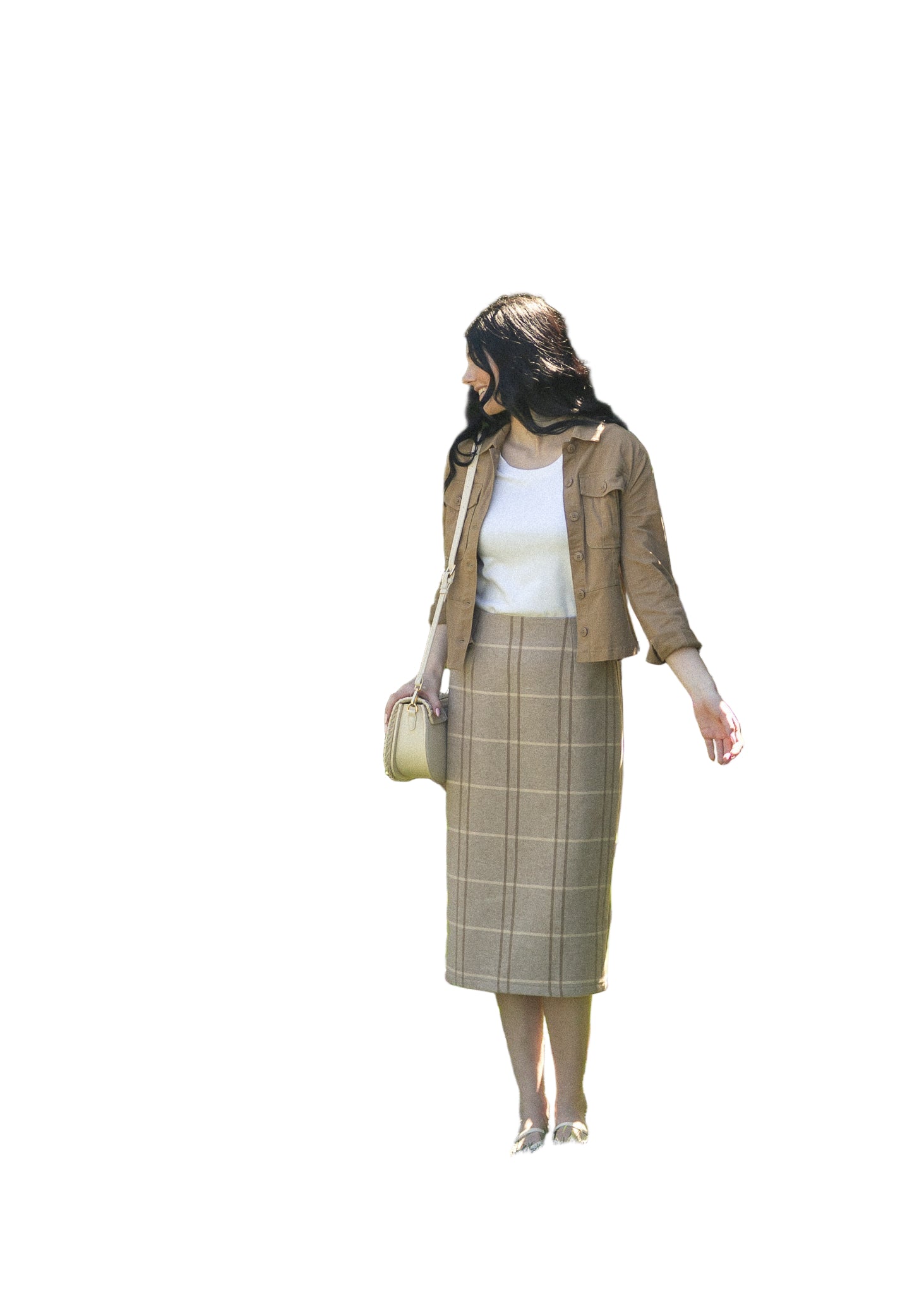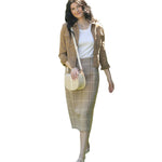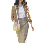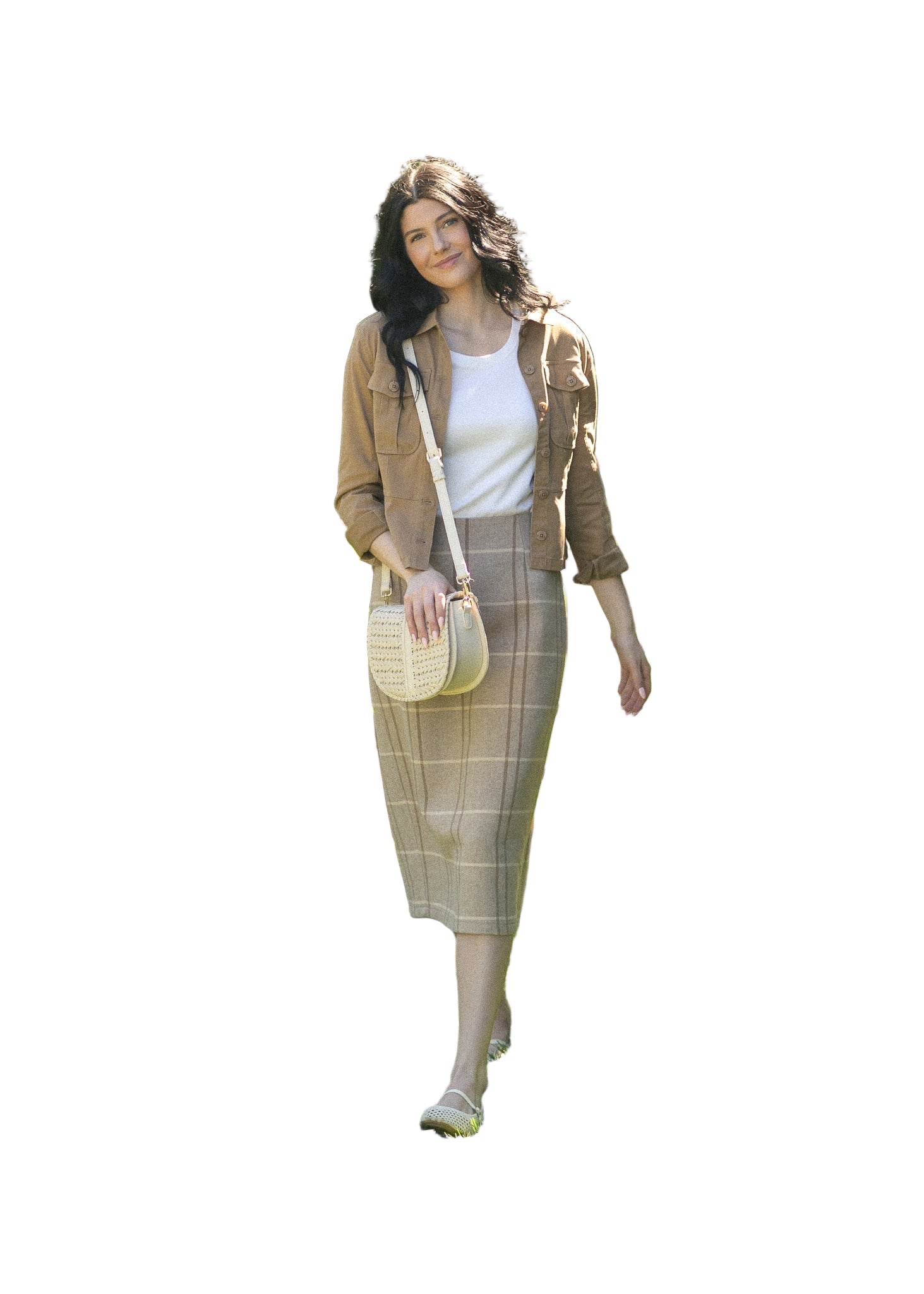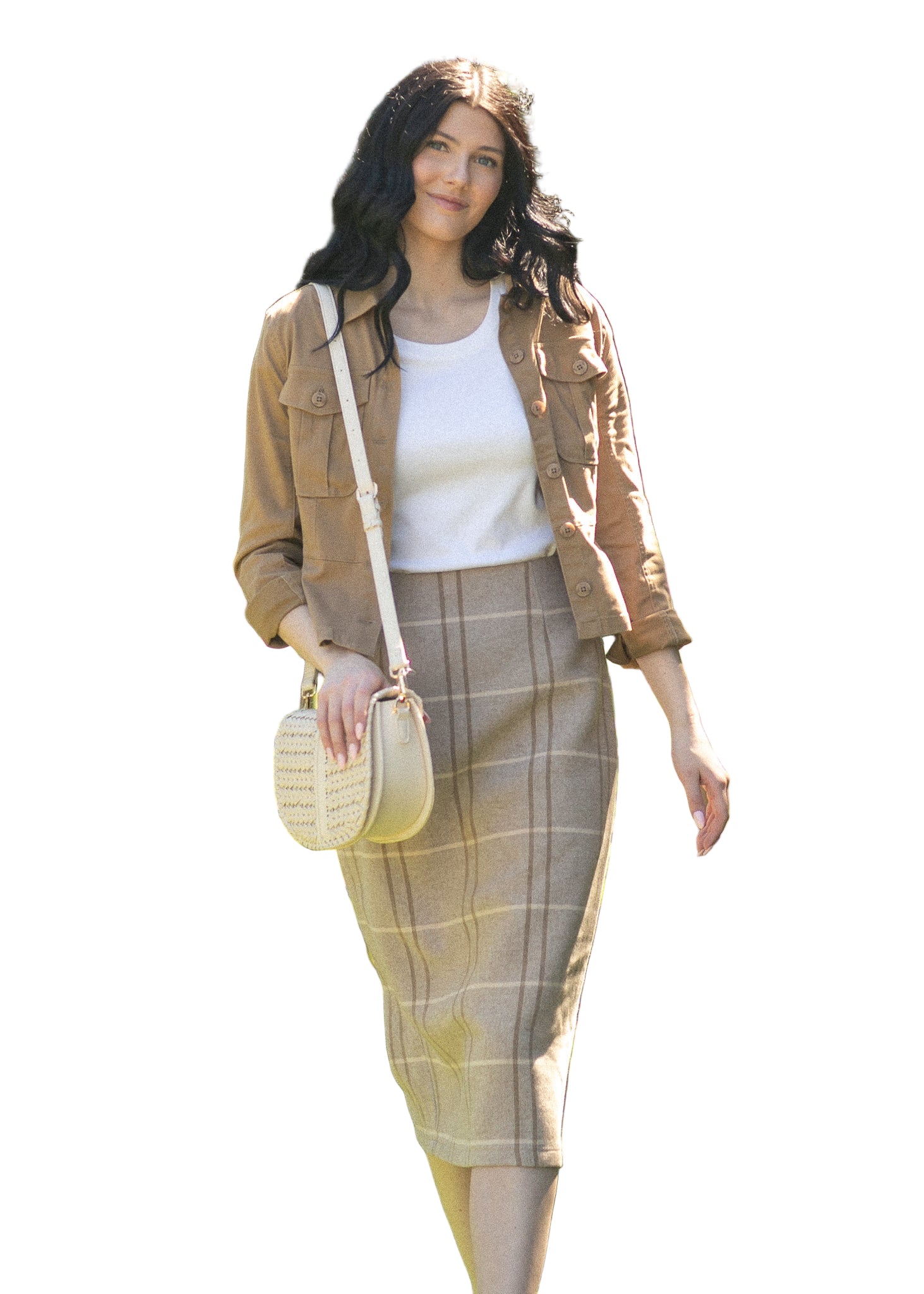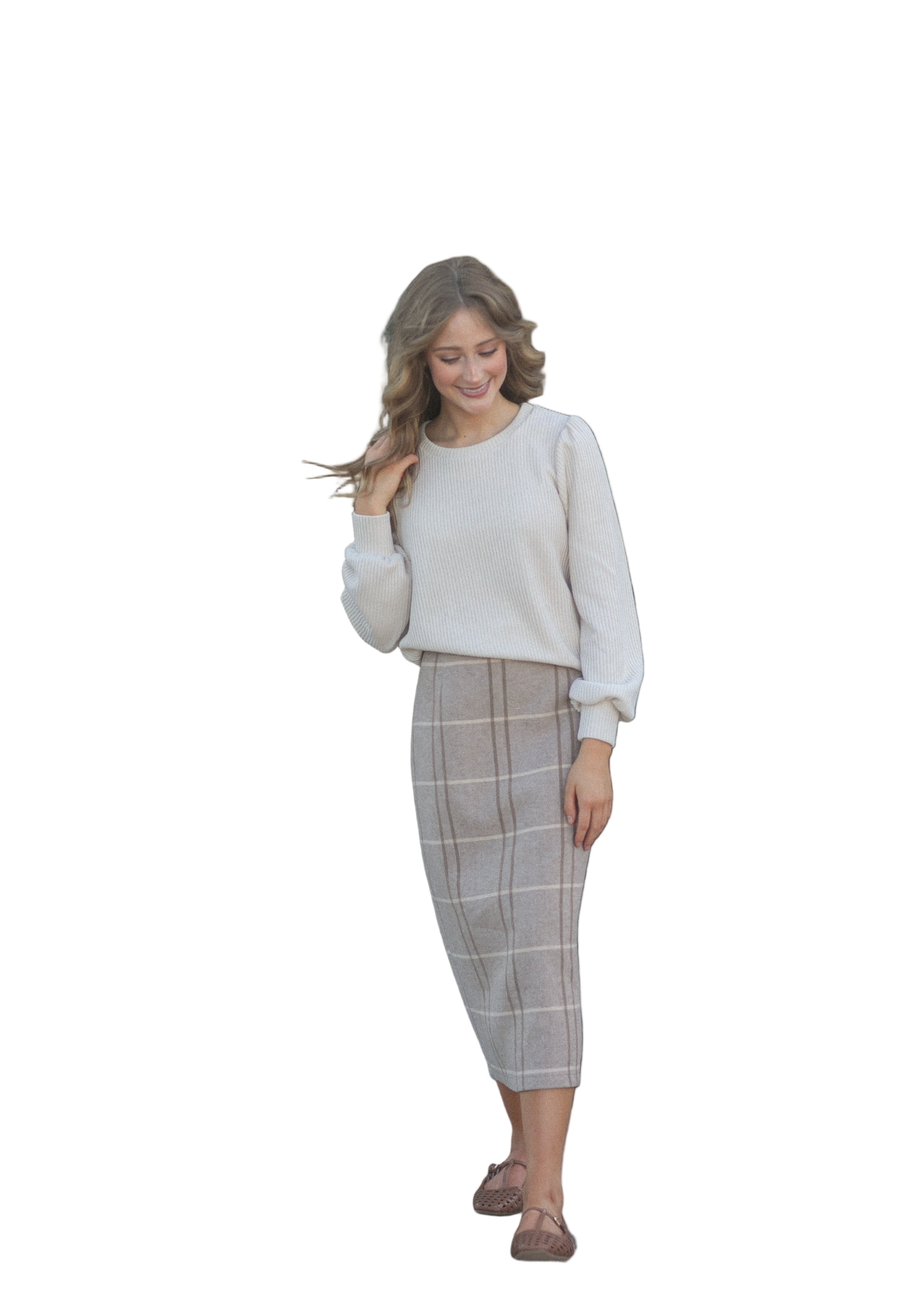 Embrace the allure of timeless elegance with the Calista Plaid Wool Midi Pencil Skirt. This enchanting piece weaves together classic structure and soft sophistication, inviting you to indulge in its warm wool blend. The neutral plaid dances gracefully, whispering tales of romance and charm.