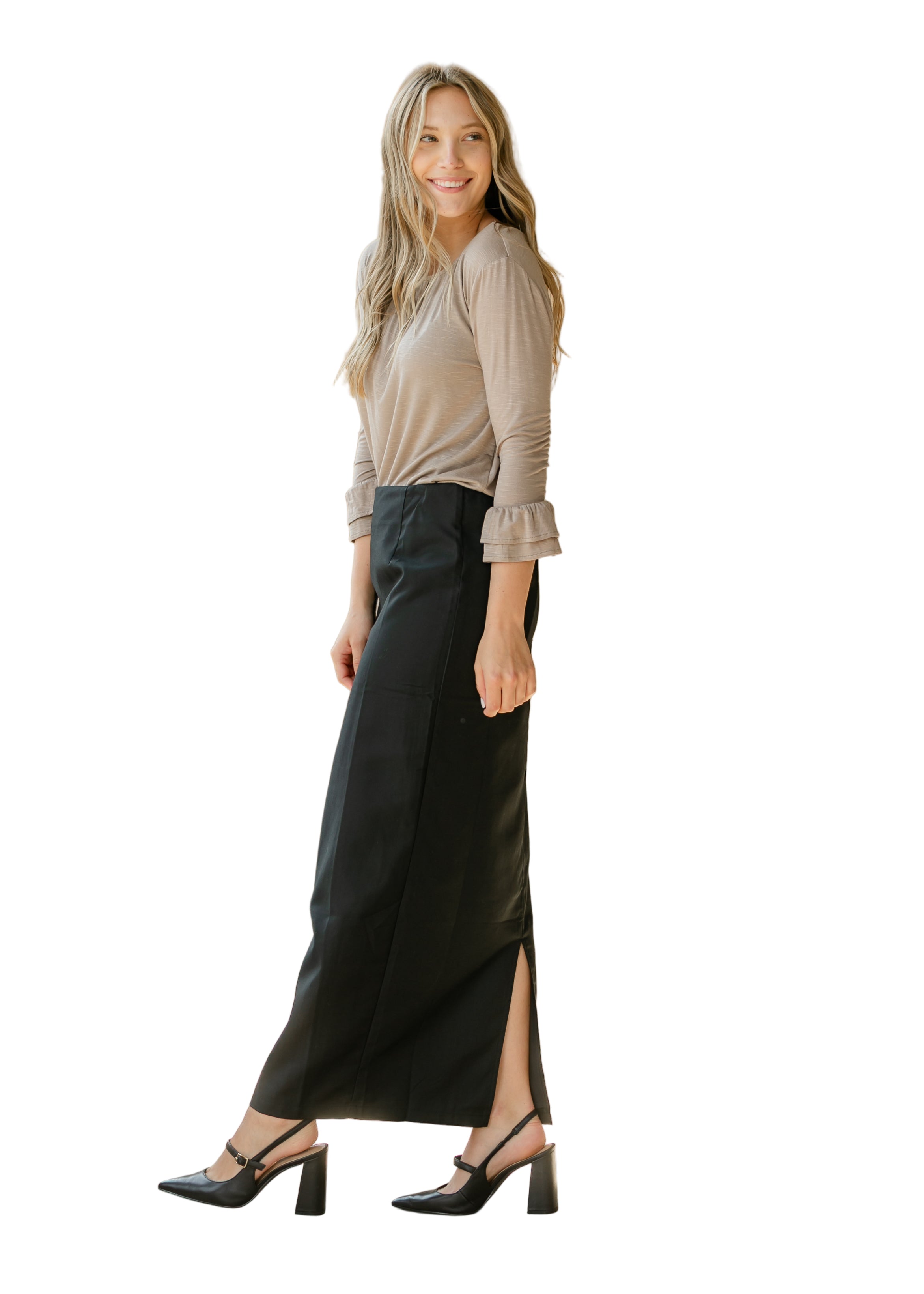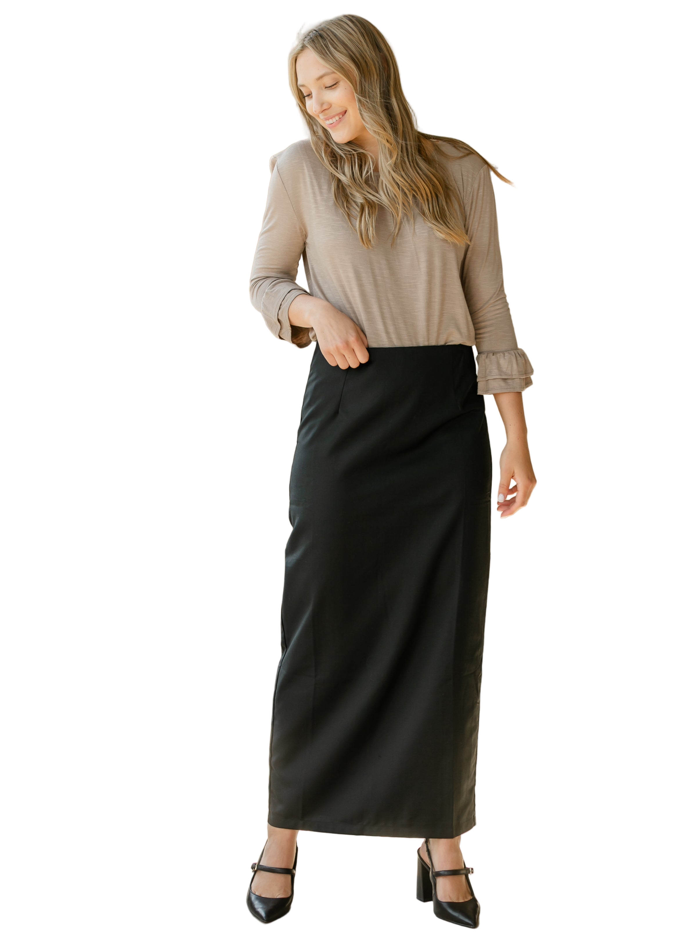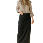 Embrace the allure of the Hollis Long Maxi Skirt, a piece that whispers elegance with every sway. Crafted to caress your silhouette, its structured waistband and clean lines create a canvas of sophistication, while the modest maxi length drapes gracefully around you.