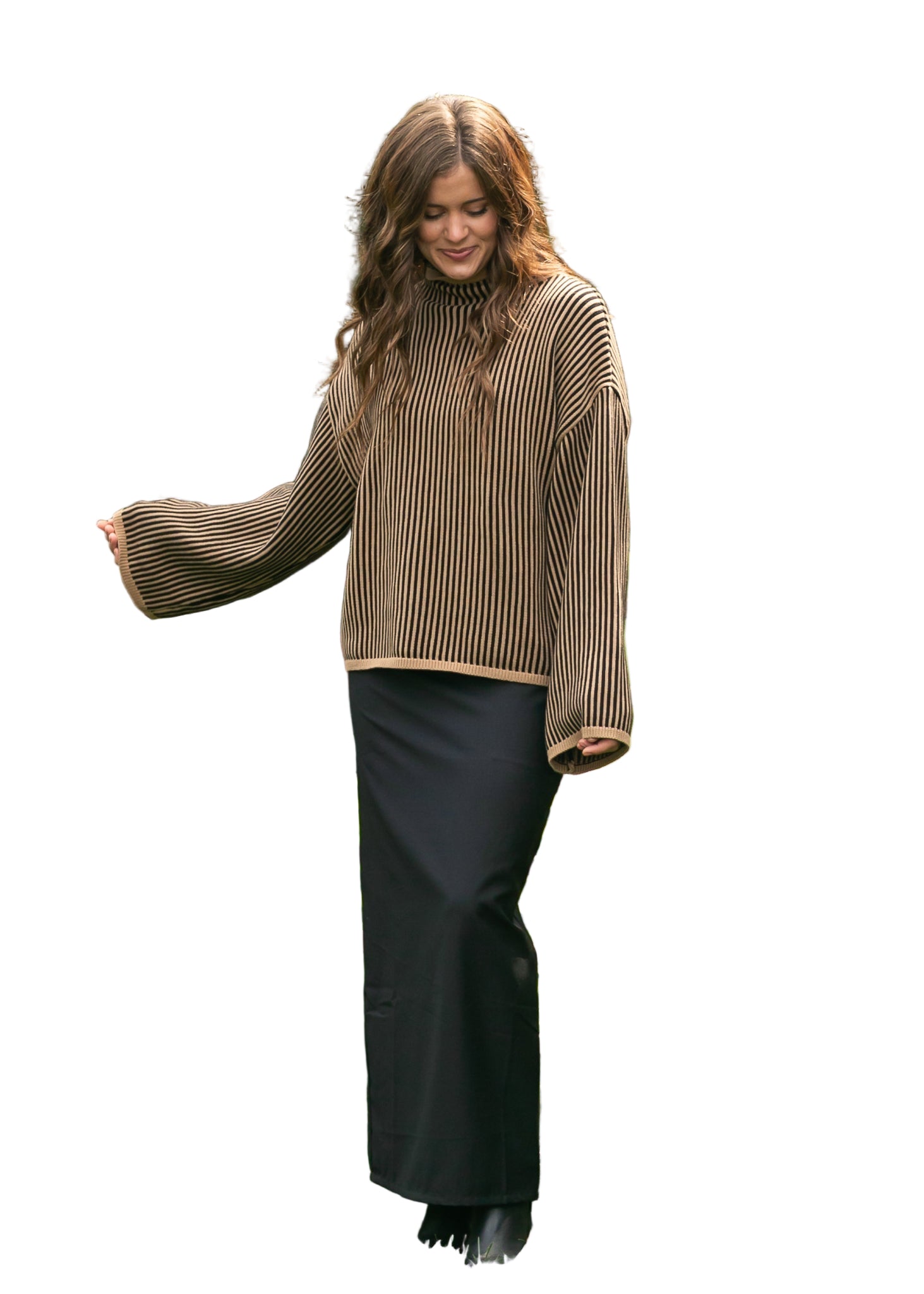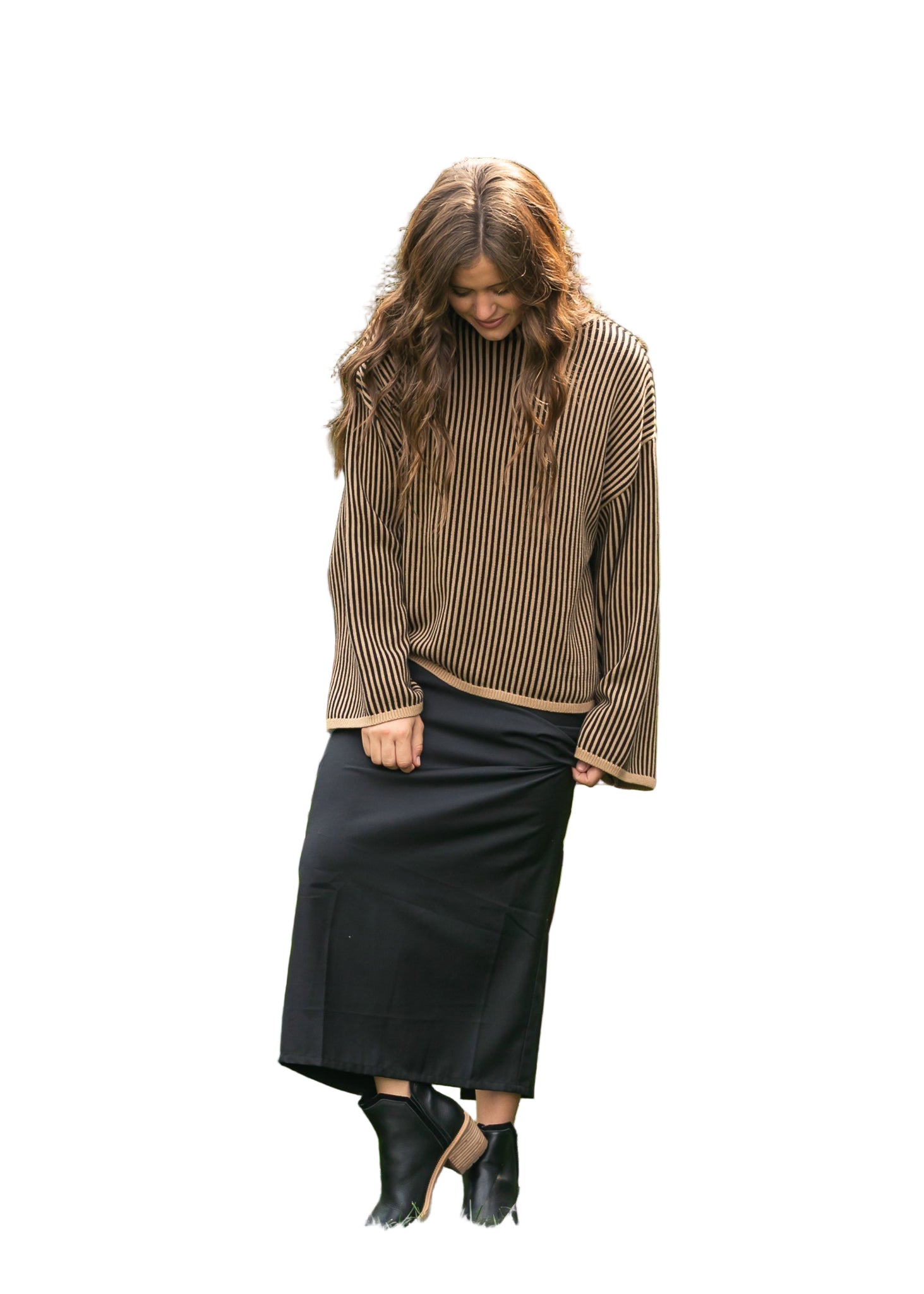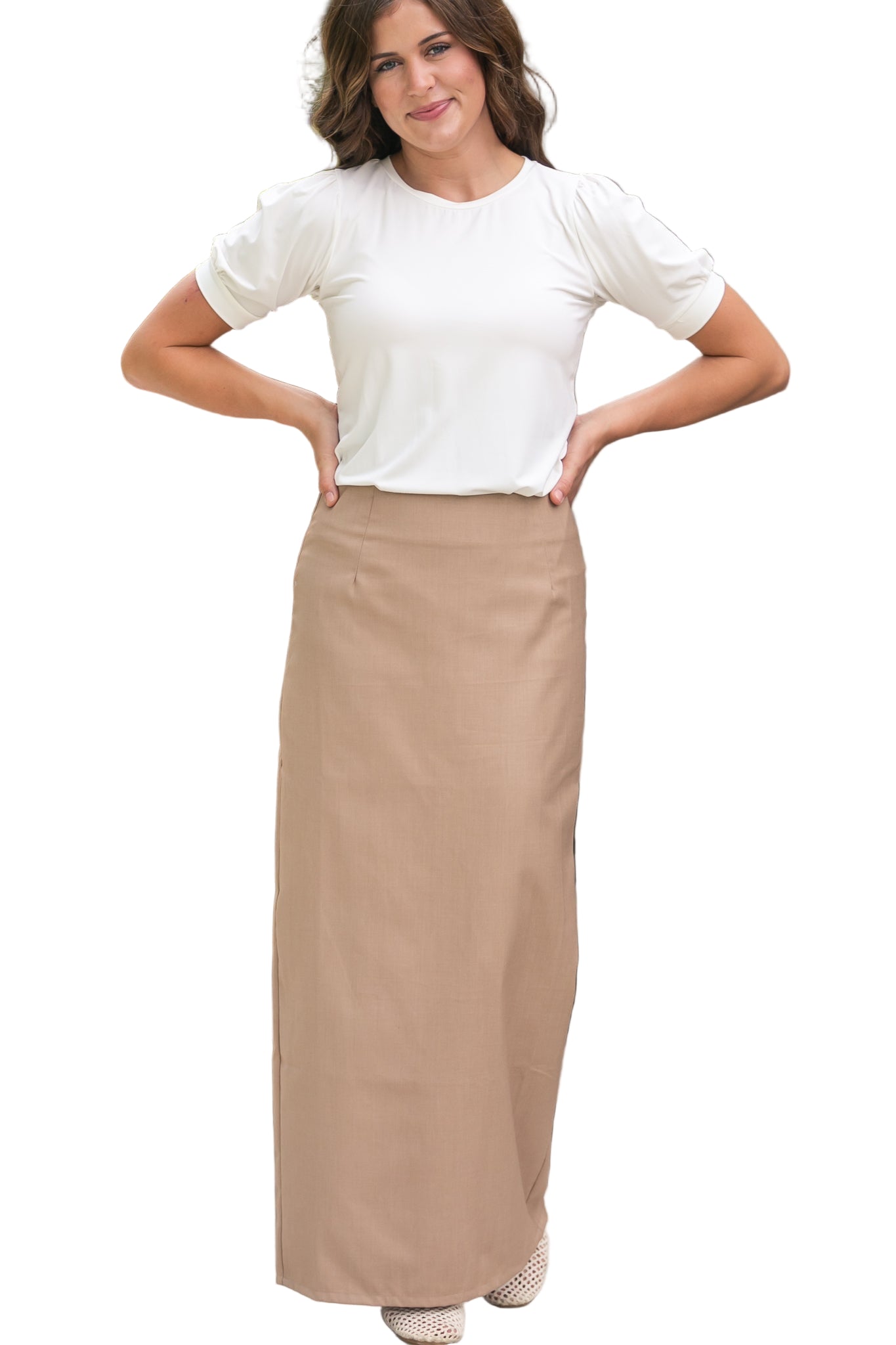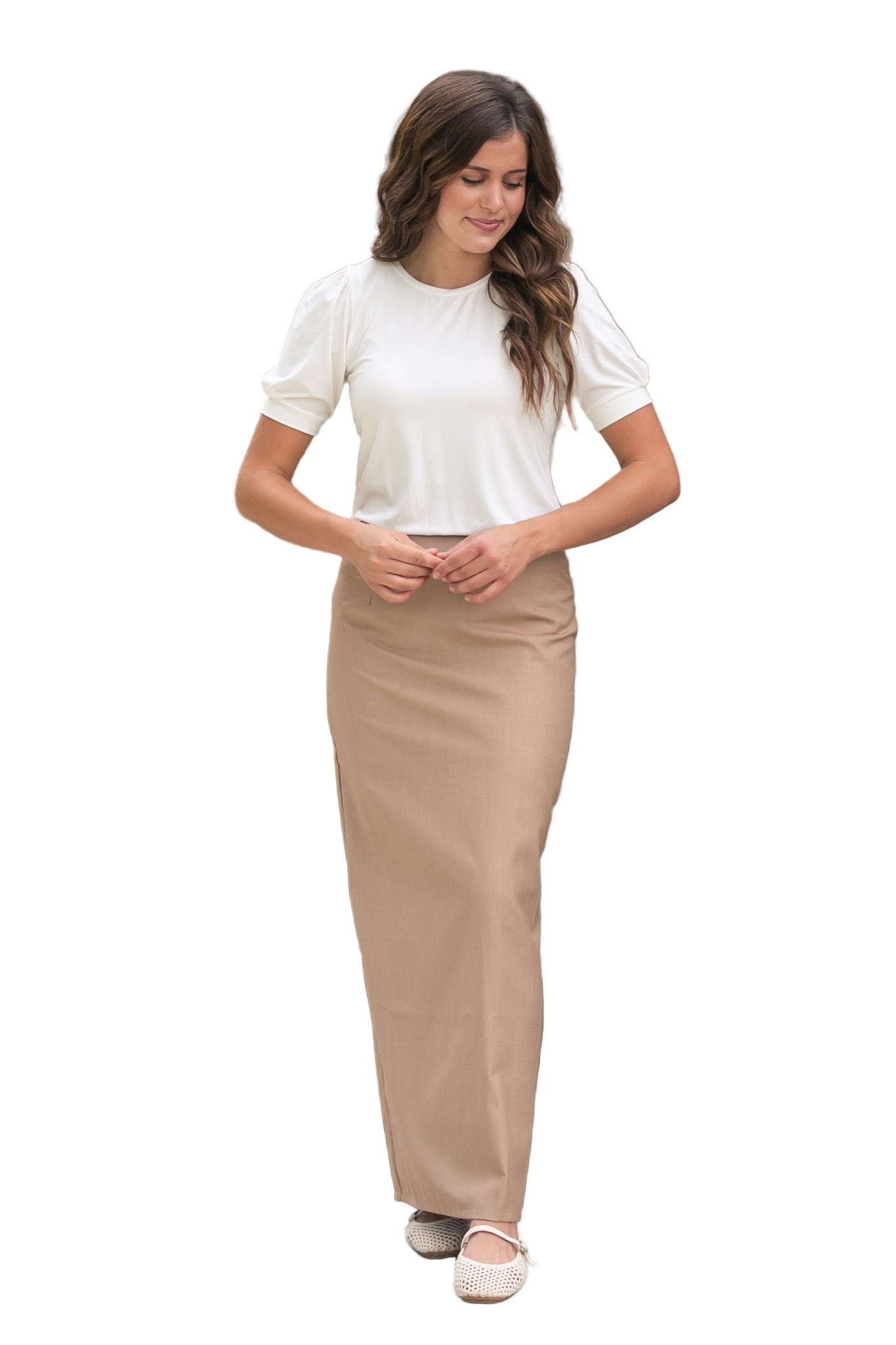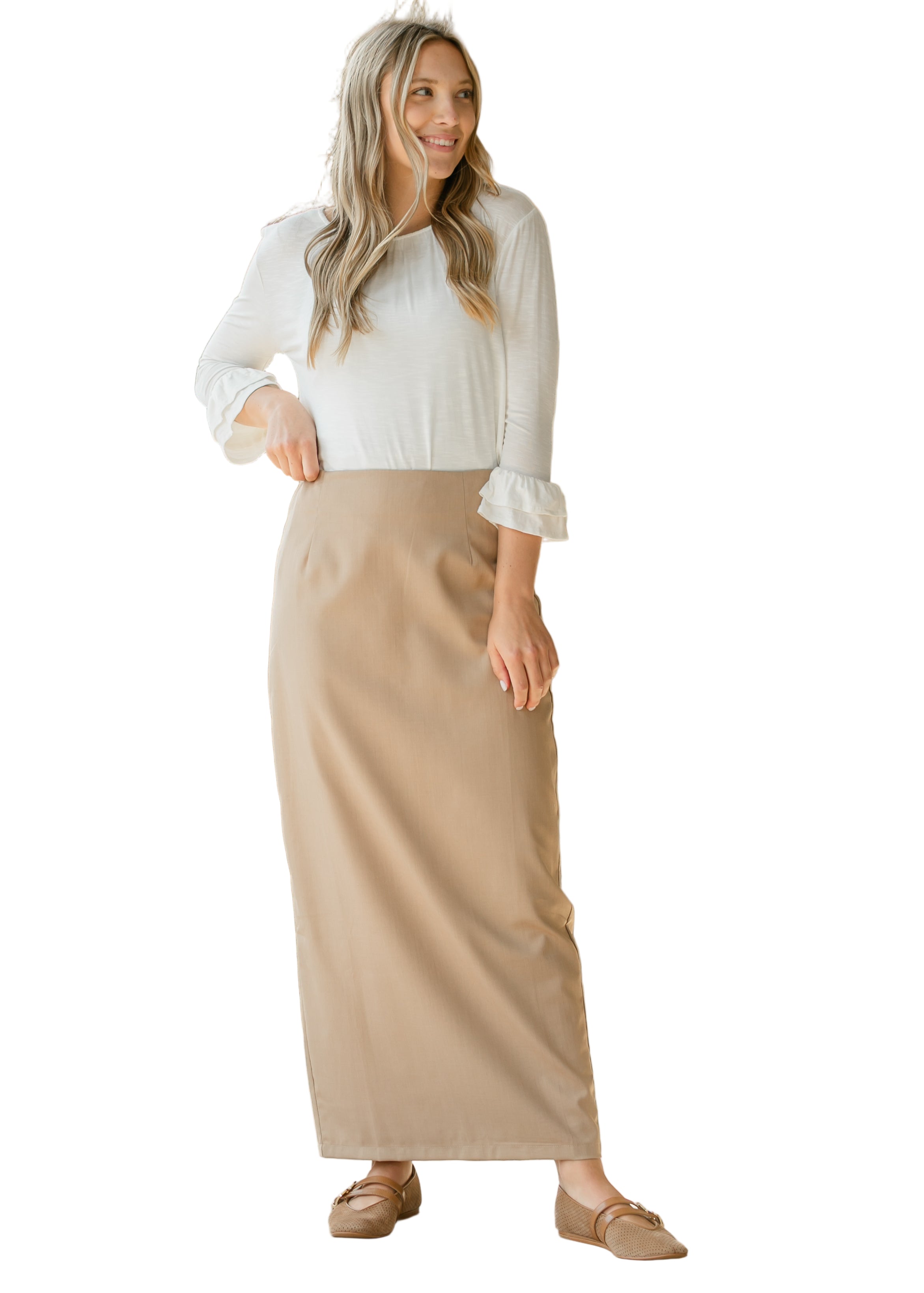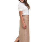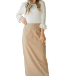 Available in classic black or warm tan, this skirt is a timeless companion for any occasion. The subtle back slit invites movement, allowing you to glide effortlessly through life, embodying romance and charm with each step.