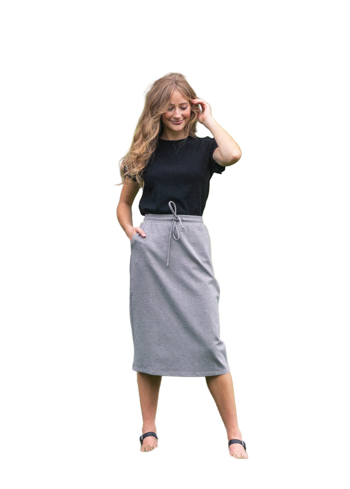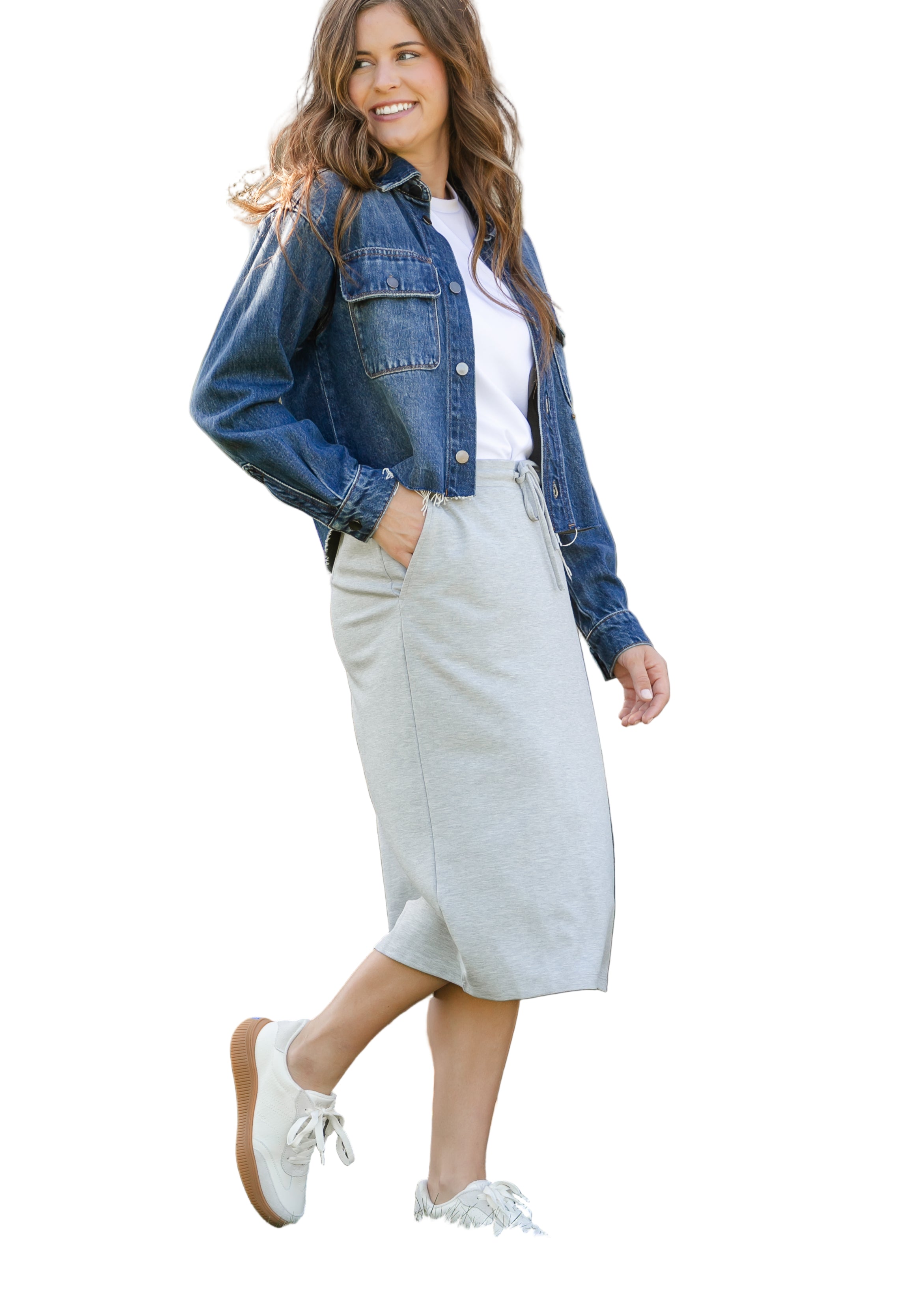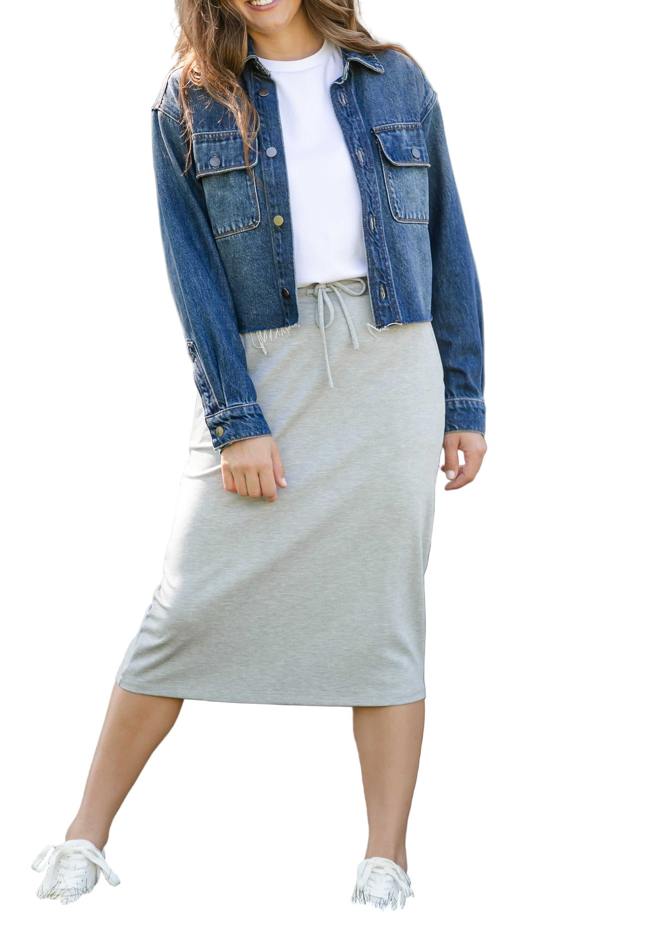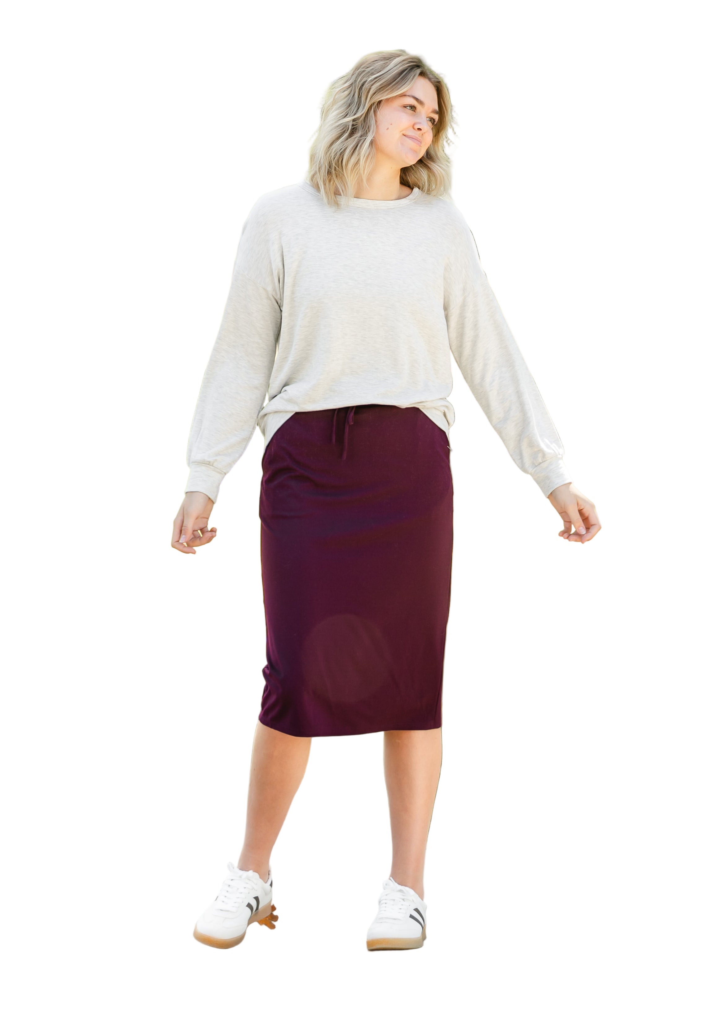Embrace the allure of effortless elegance with the Jordan Knit Midi Skirt. This enchanting piece caresses your silhouette, offering a dreamy blend of comfort and style. The soft, stretchy fabric gently hugs your curves, while the adjustable drawstring waist ensures a perfect fit, making it a delightful companion for any occasion.