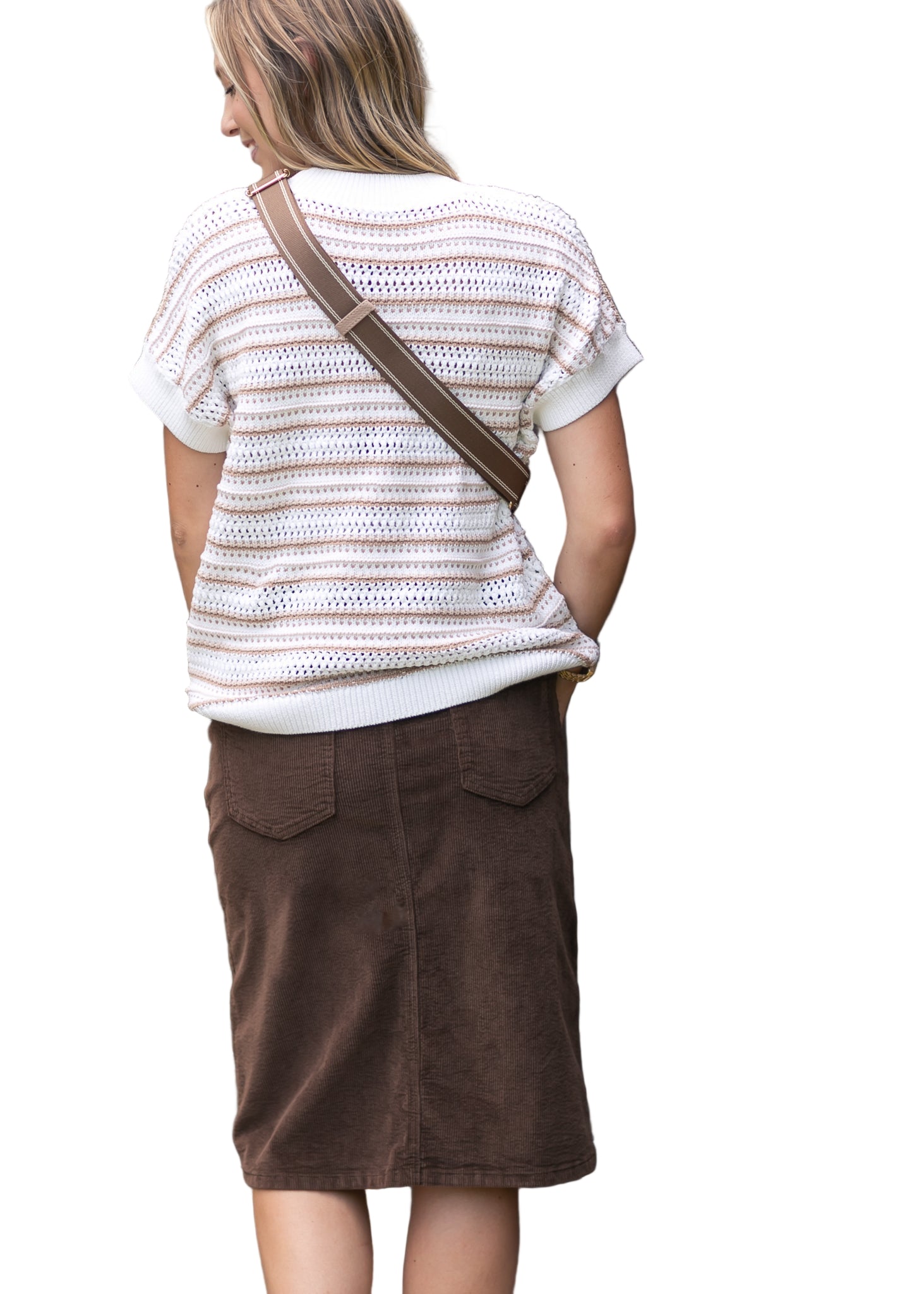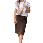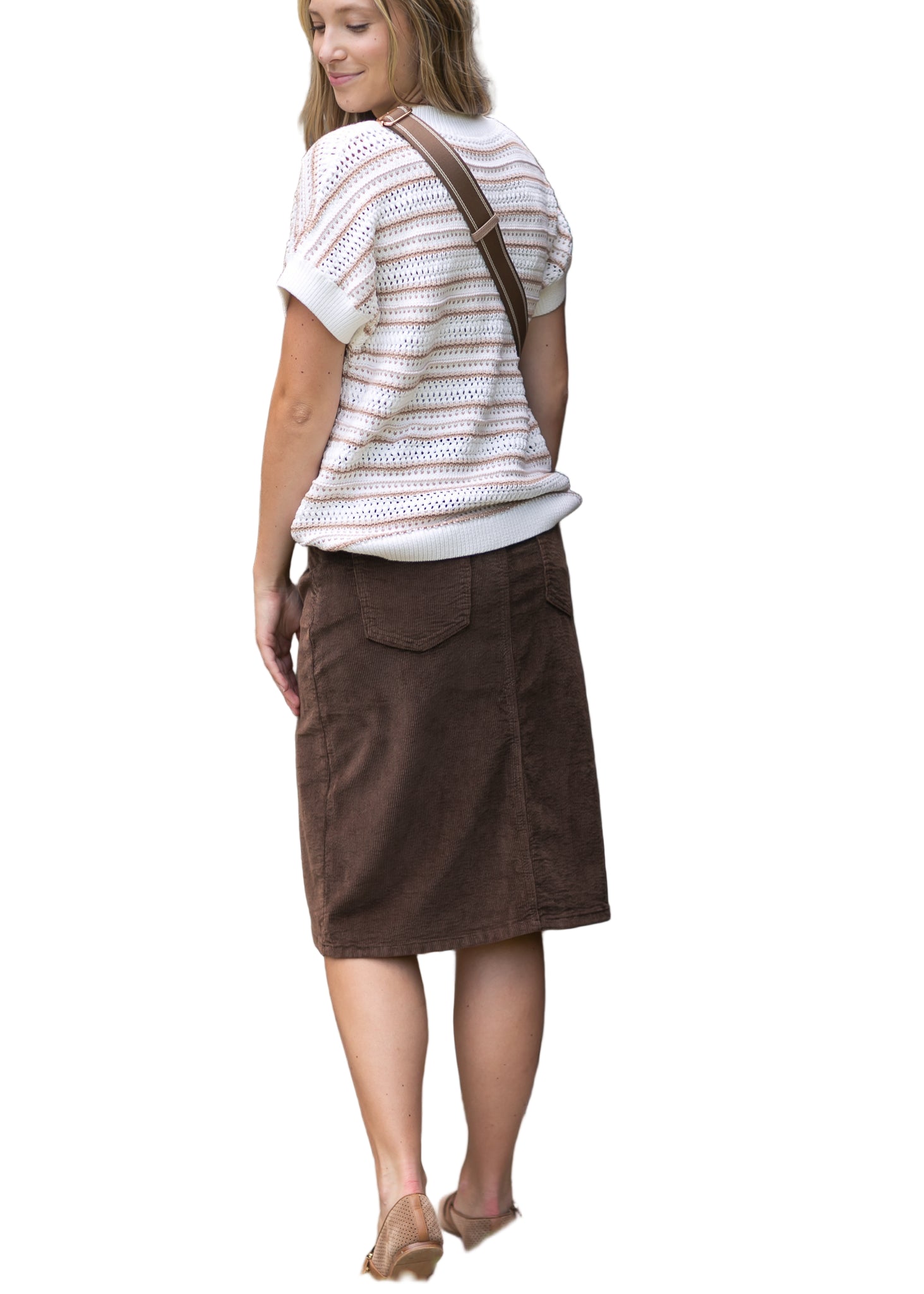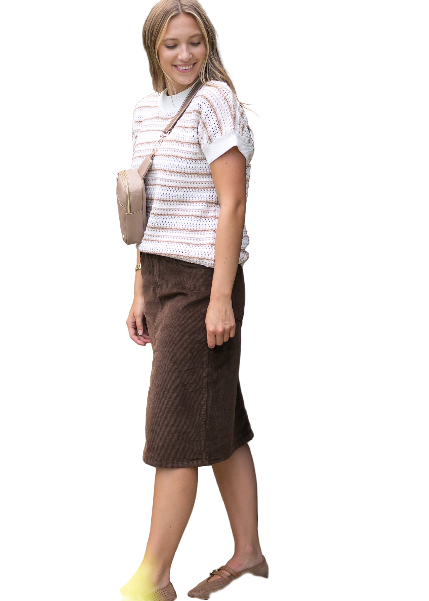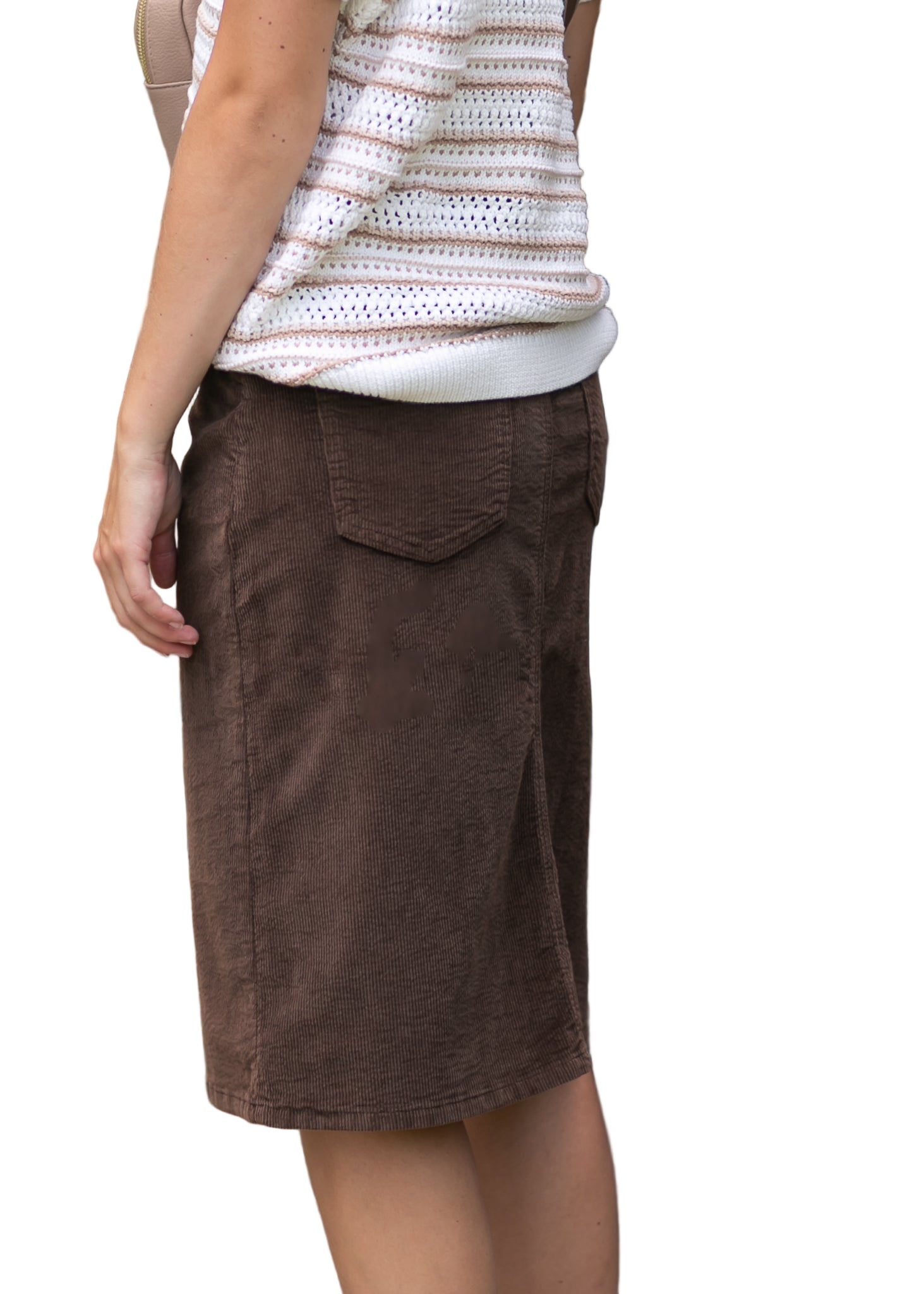 Embrace the allure of the season with the Remi Corduroy Midi Skirt, a timeless piece that whispers romance in every stitch. Crafted from soft, luxurious corduroy, this 28' skirt envelops you in warmth and elegance, making it your go-to for any occasion.