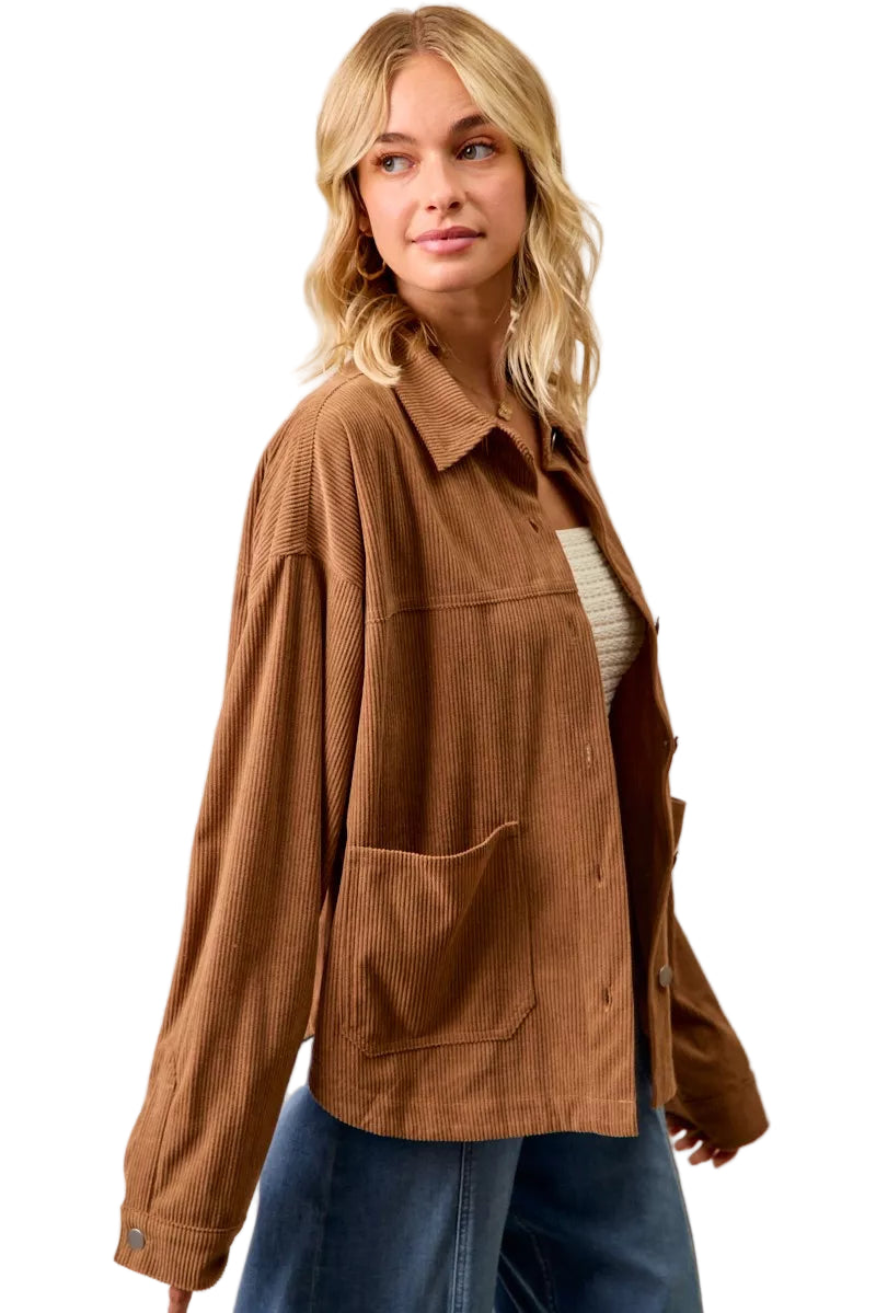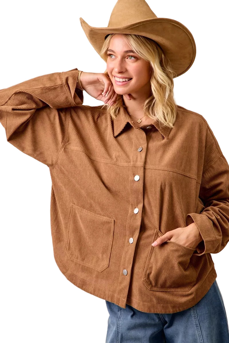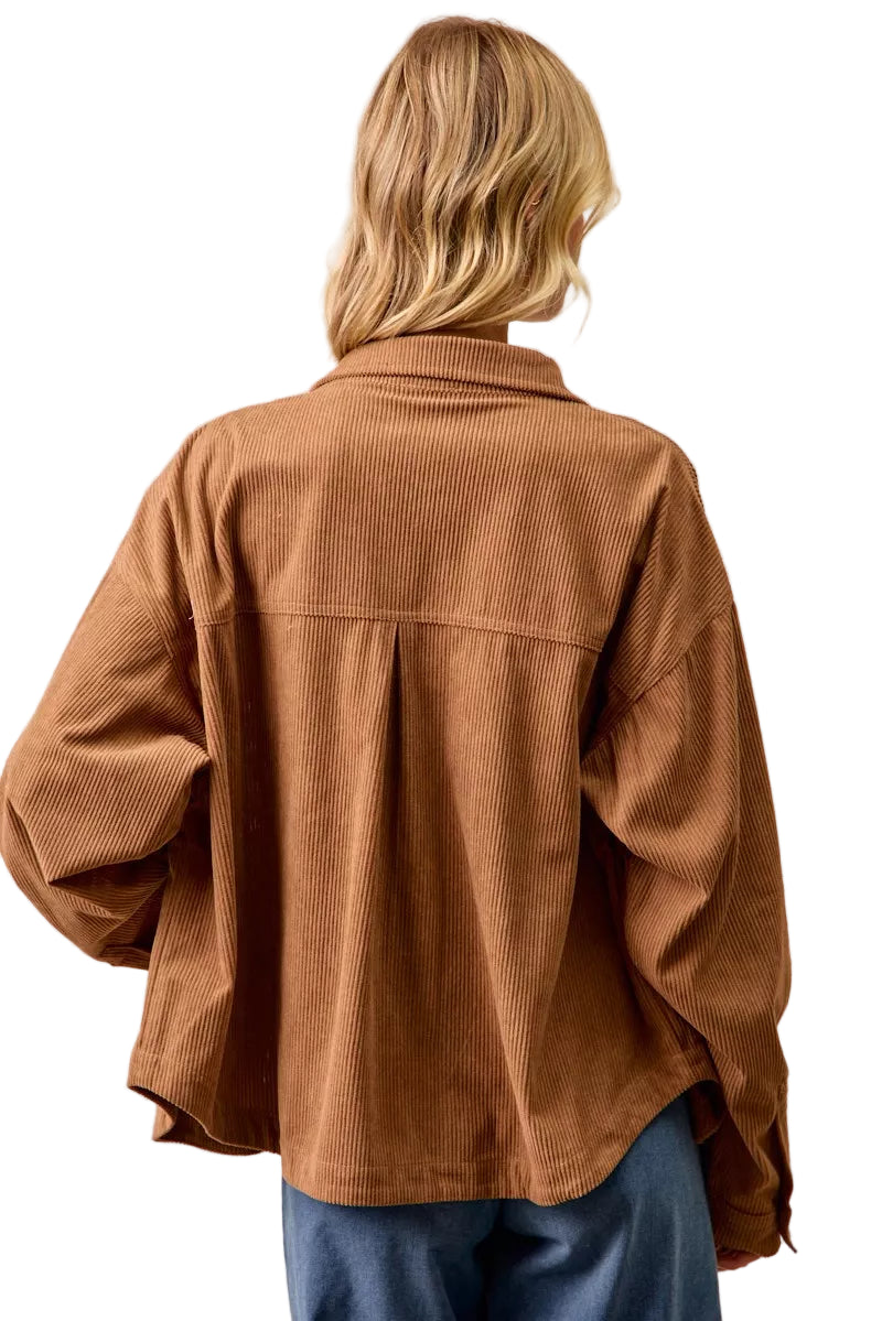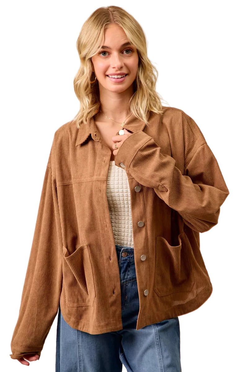 Wrap yourself in the tender embrace of the BiBi Corduroy Relaxed Fit Shacket, where style meets warmth in a delightful dance. This enchanting piece, with its soft corduroy fabric, whispers of cozy evenings and romantic strolls under the stars.