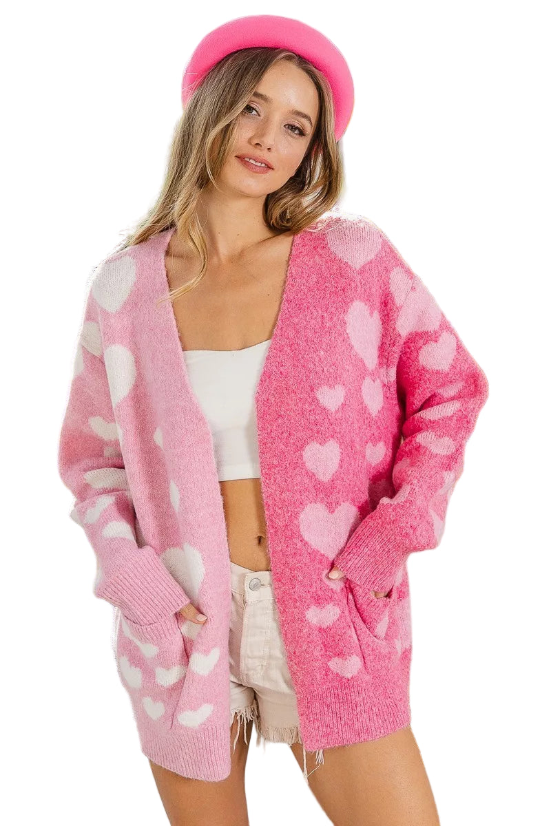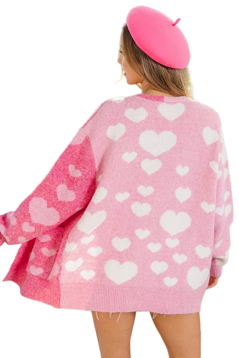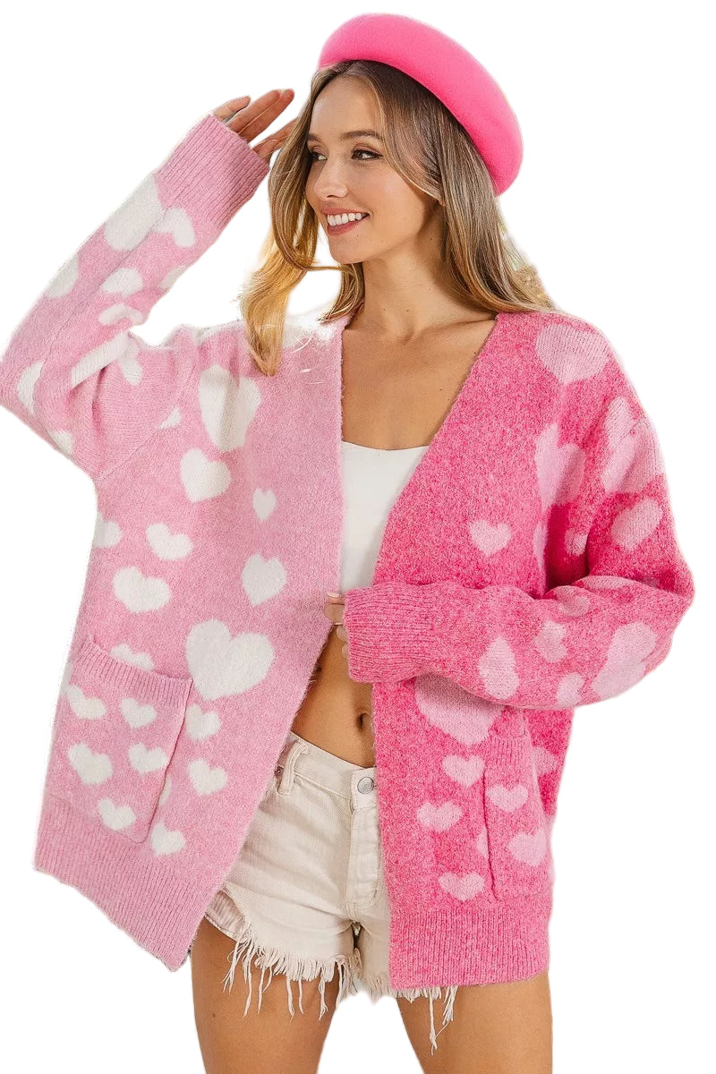 Wrap yourself in the warmth of romance with the BiBi Heart Color Block V-Neck Knit Cardigan. This enchanting piece, adorned with a playful heart design, invites you to embrace your whimsical side while staying effortlessly chic.