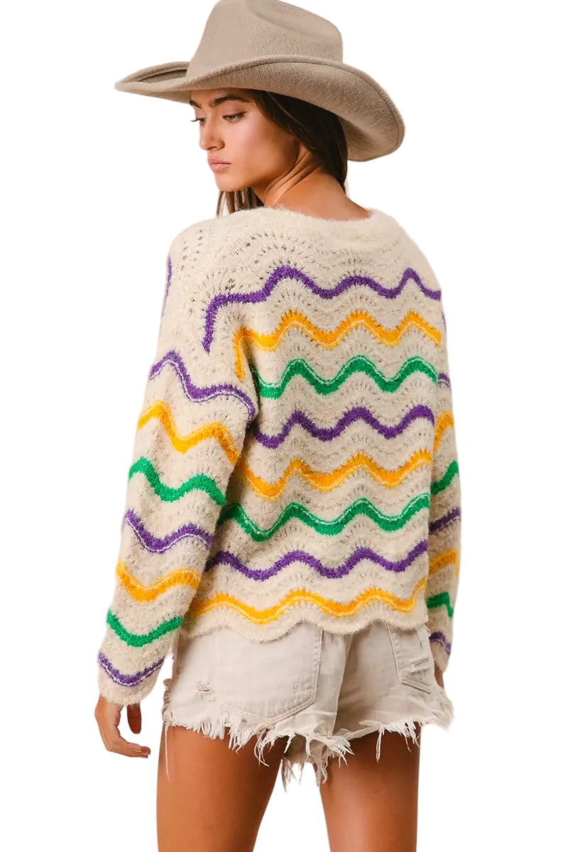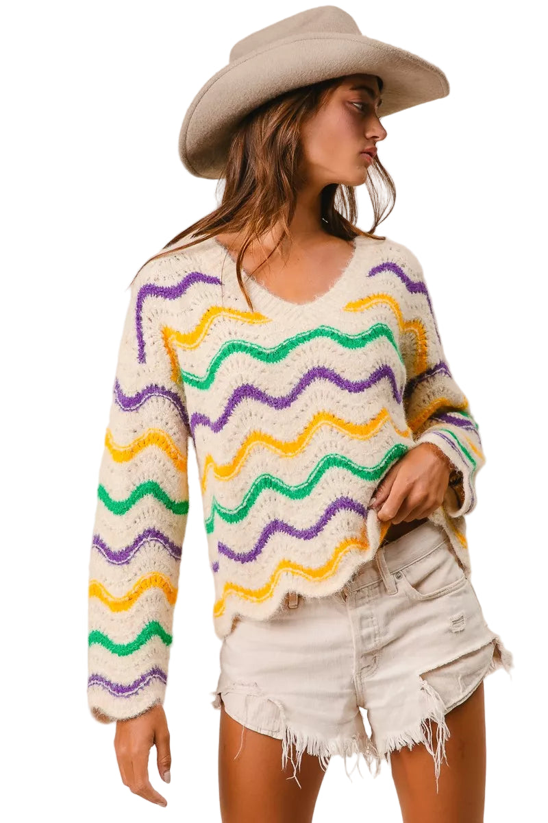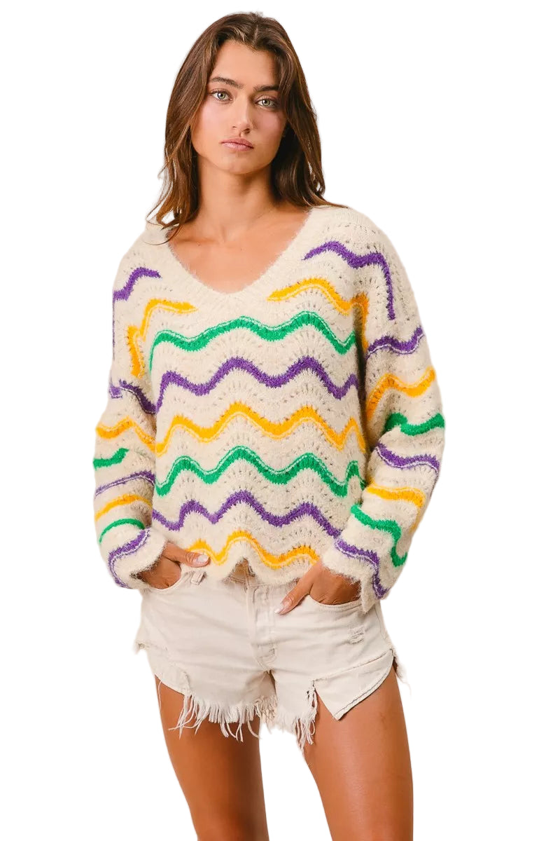 Wrap yourself in the enchanting embrace of the BiBi Mardi Gras Wavy Stripes V-Neck Sweater, where vibrant hues dance like confetti in the air. This delightful piece captures the spirit of celebration, inviting you to indulge in its playful charm.