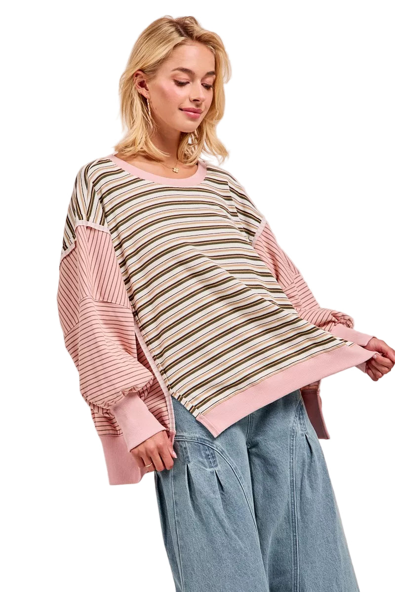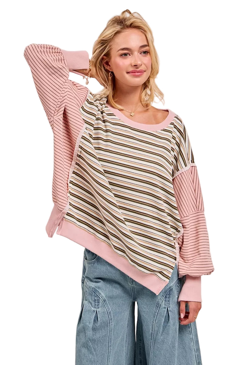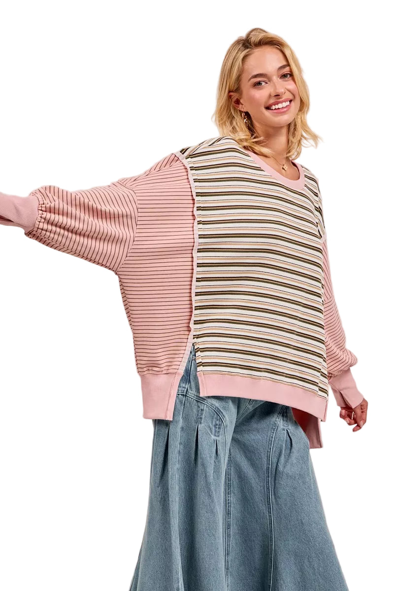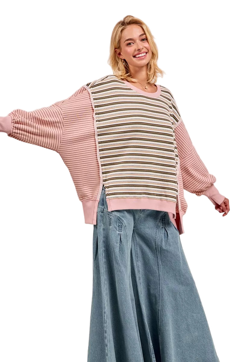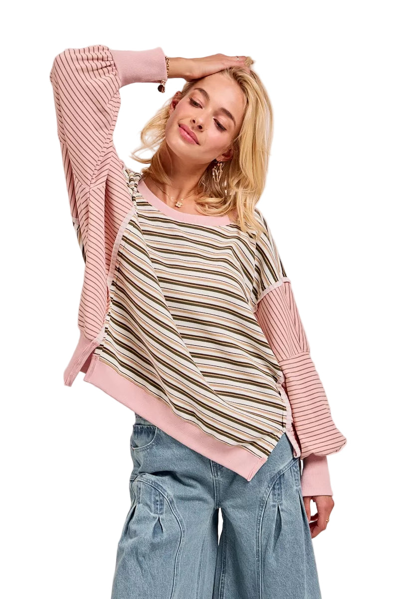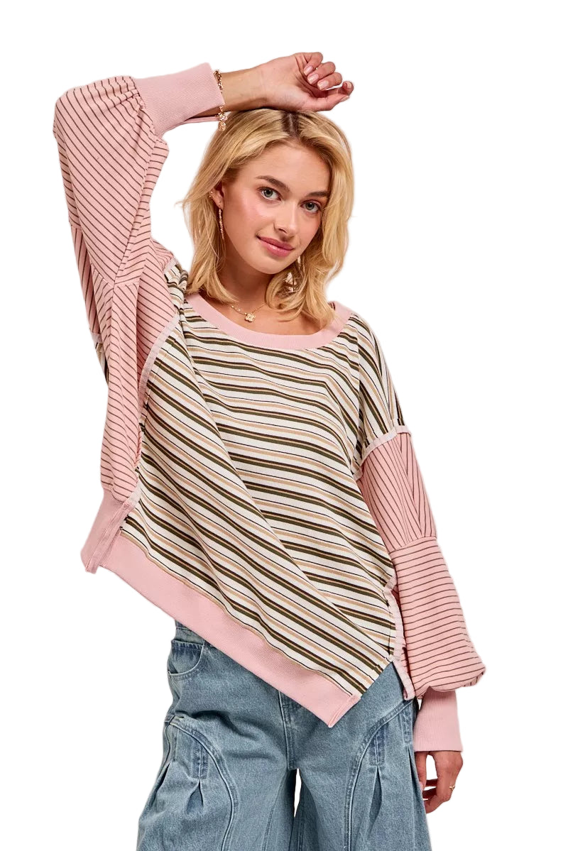 Embrace the allure of romance with the BiBi Stripe Mixed Top, a piece that whispers elegance and charm. The enchanting stripe pattern dances across the fabric, creating a modern silhouette that captivates the eye.