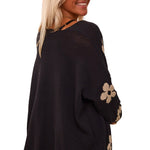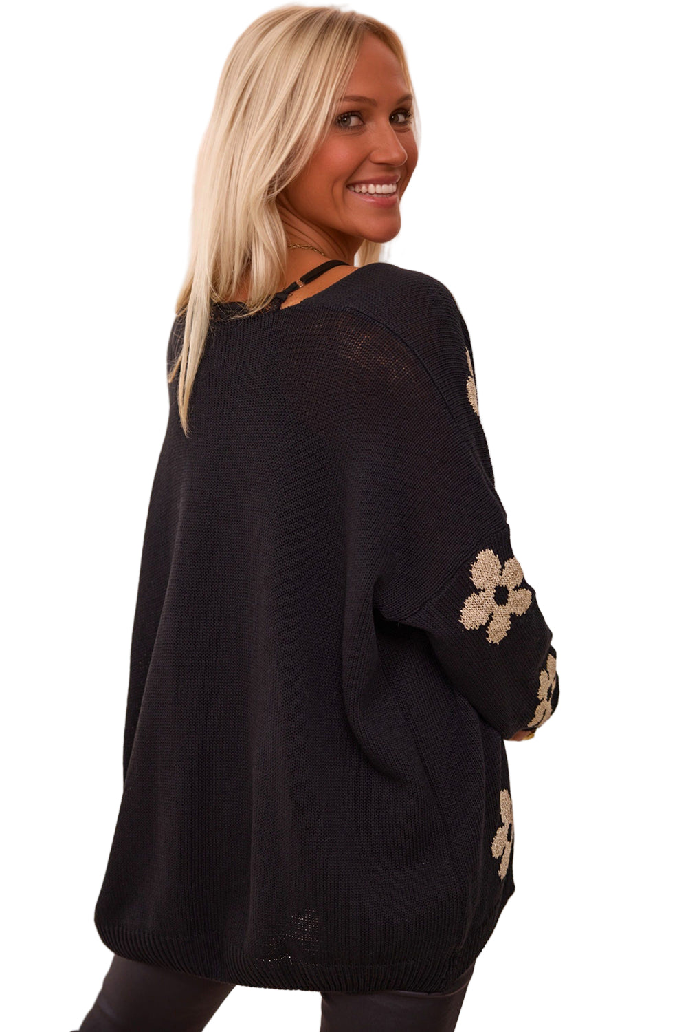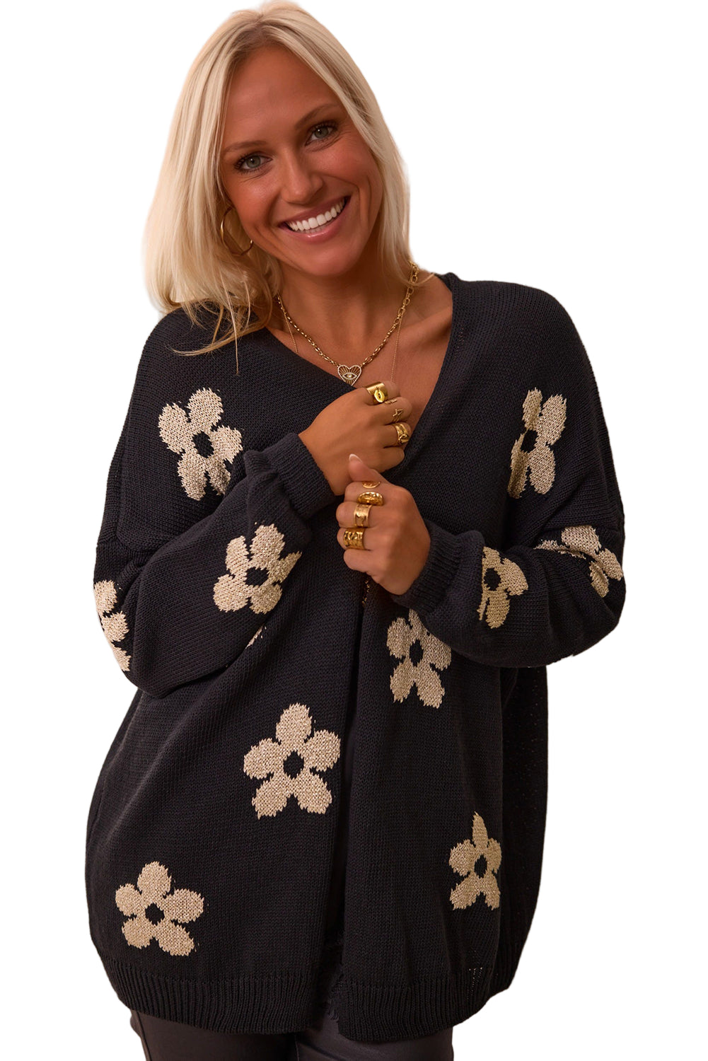Wrap yourself in the enchanting embrace of our Black Floral Print Knitted Open Front Loose Cardigan. This exquisite piece whispers romance with its delicate floral patterns, reminiscent of a moonlit garden in full bloom.