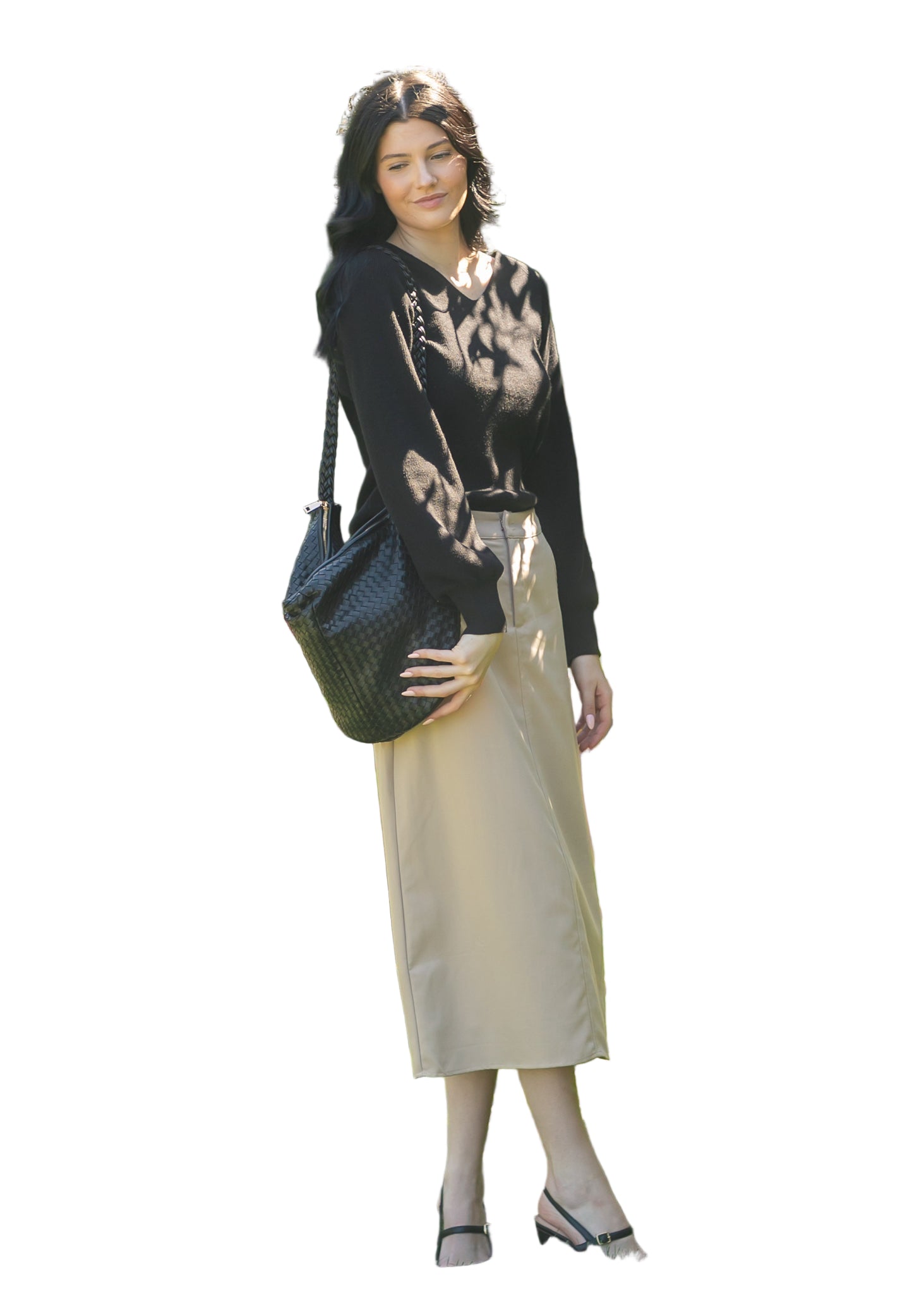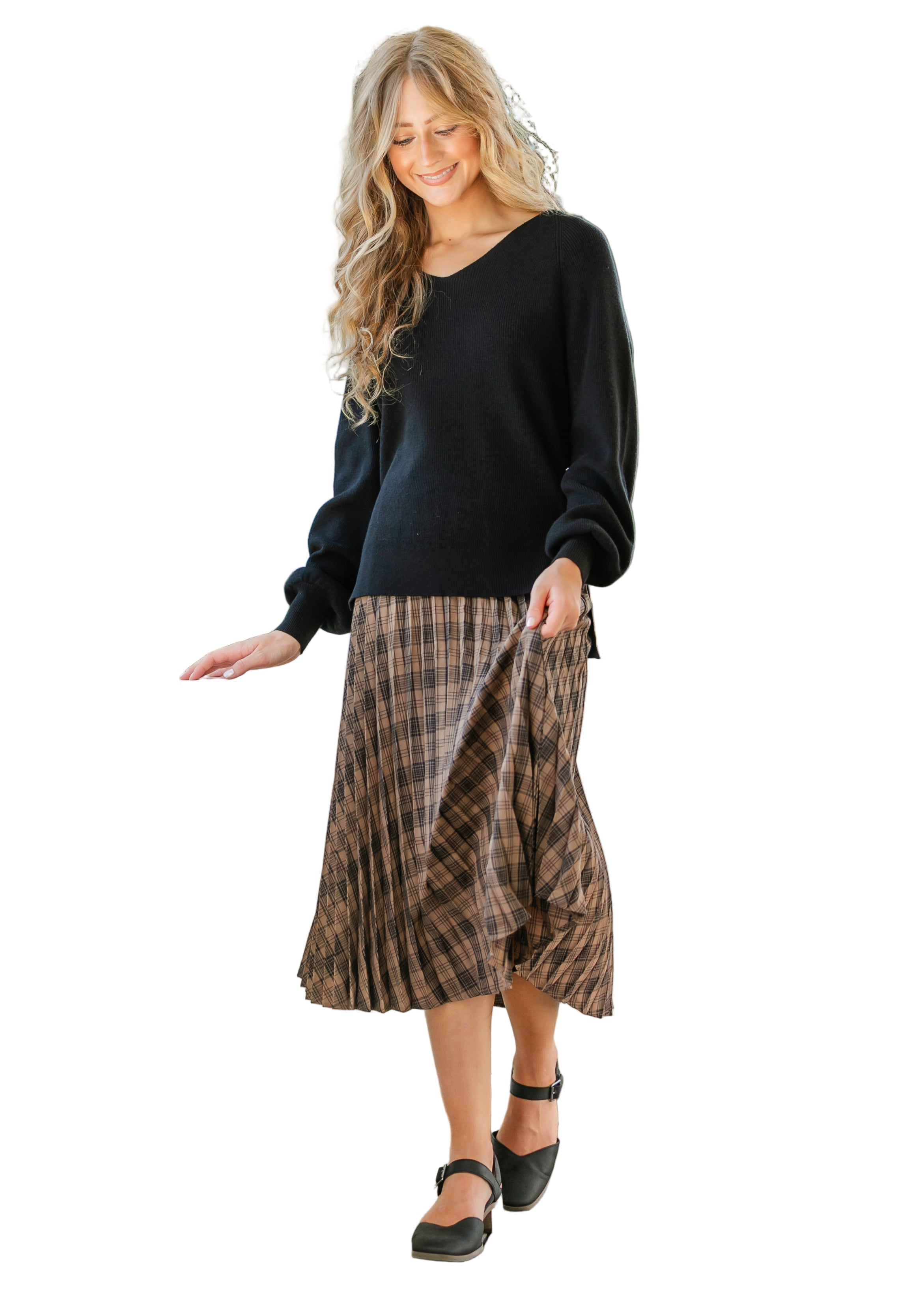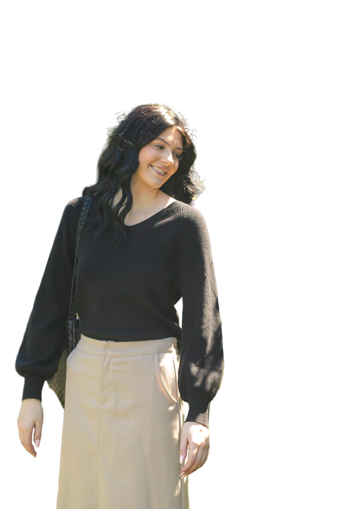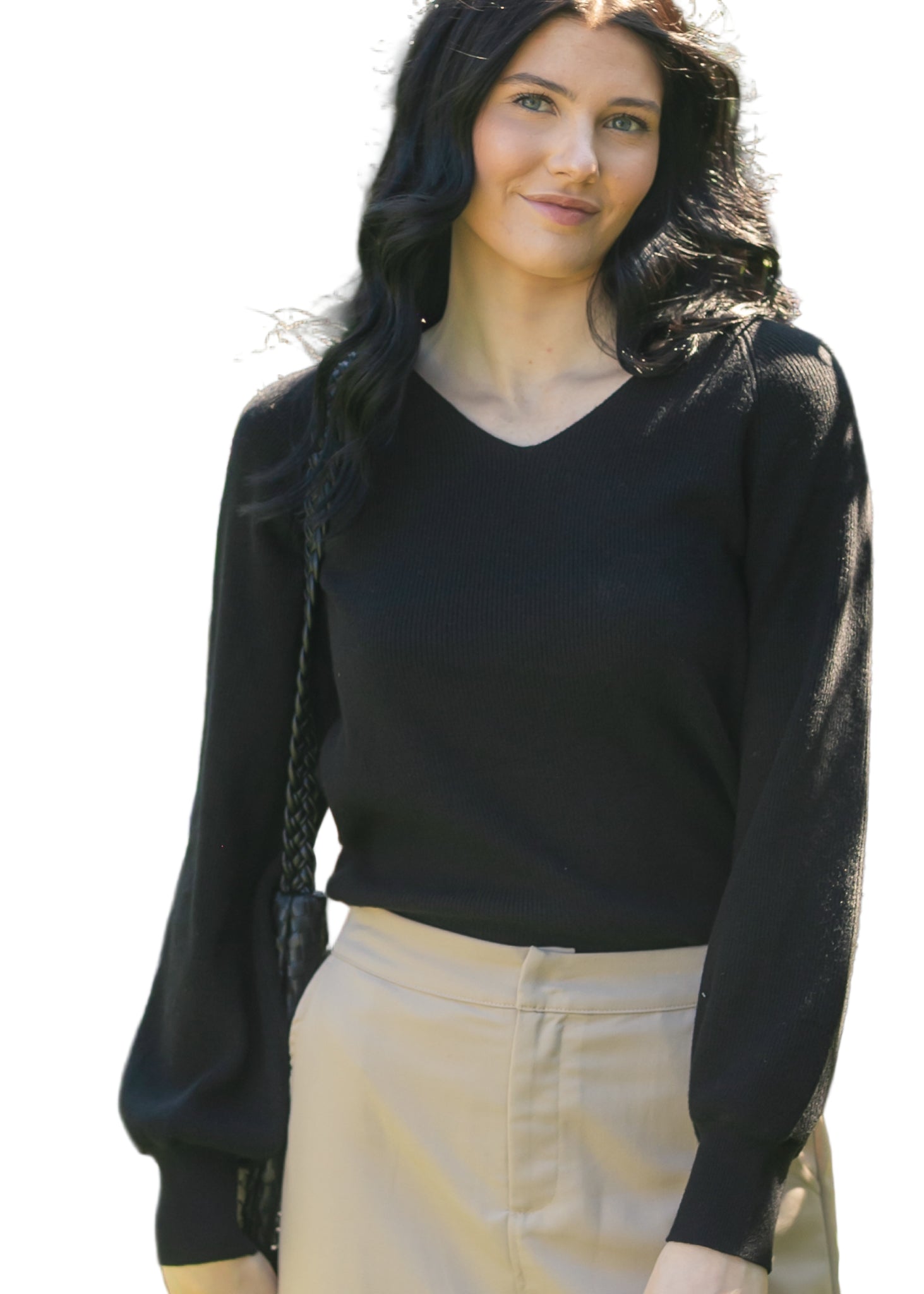 Wrap yourself in the tender embrace of our Essential V-neck Balloon Sleeve Sweater, where elegance meets comfort. The soft, stretchy knit fabric caresses your skin, making every moment feel like a gentle whisper of romance.