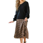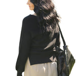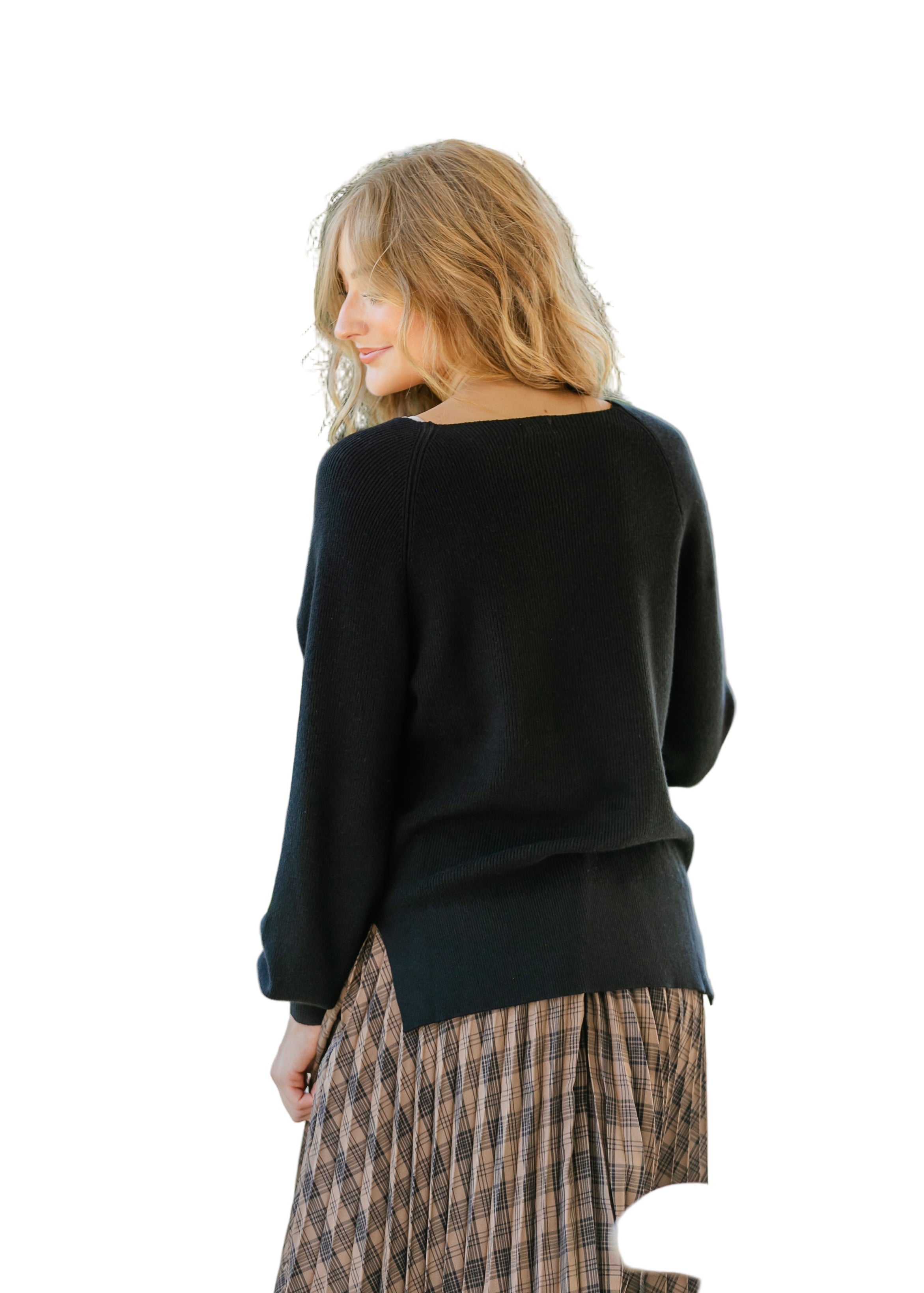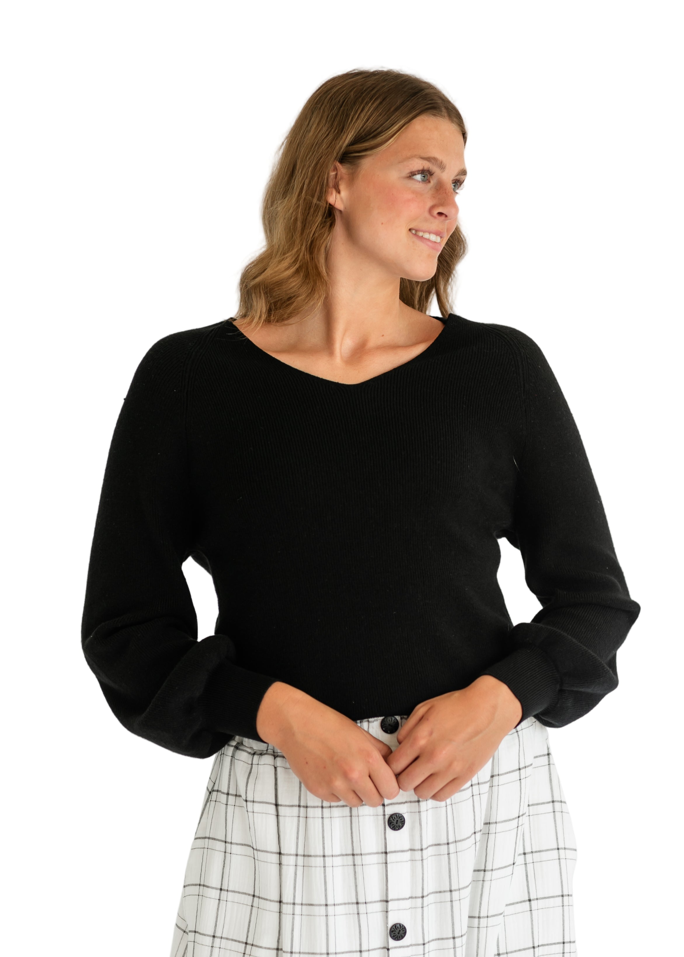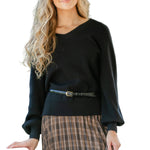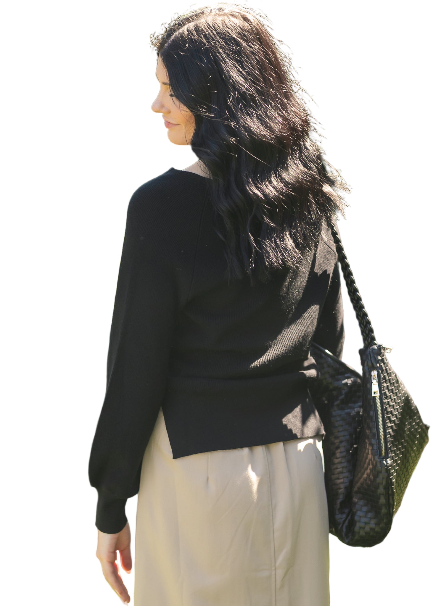 With its alluring v-neck and enchanting balloon sleeves, this sweater dances between timeless charm and modern flair. The high-low hem adds a touch of intrigue, perfect for those intimate evenings or casual strolls under the stars.