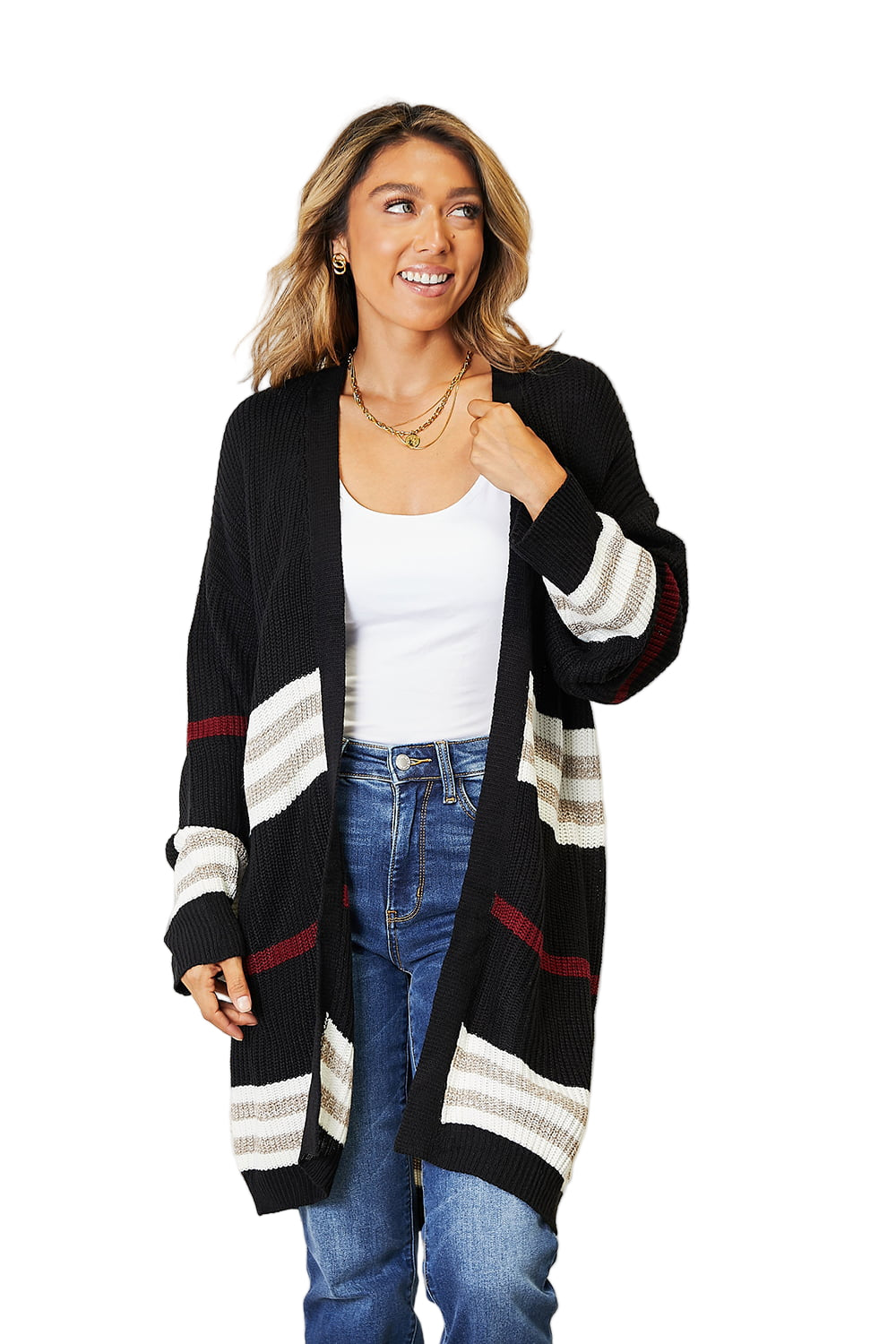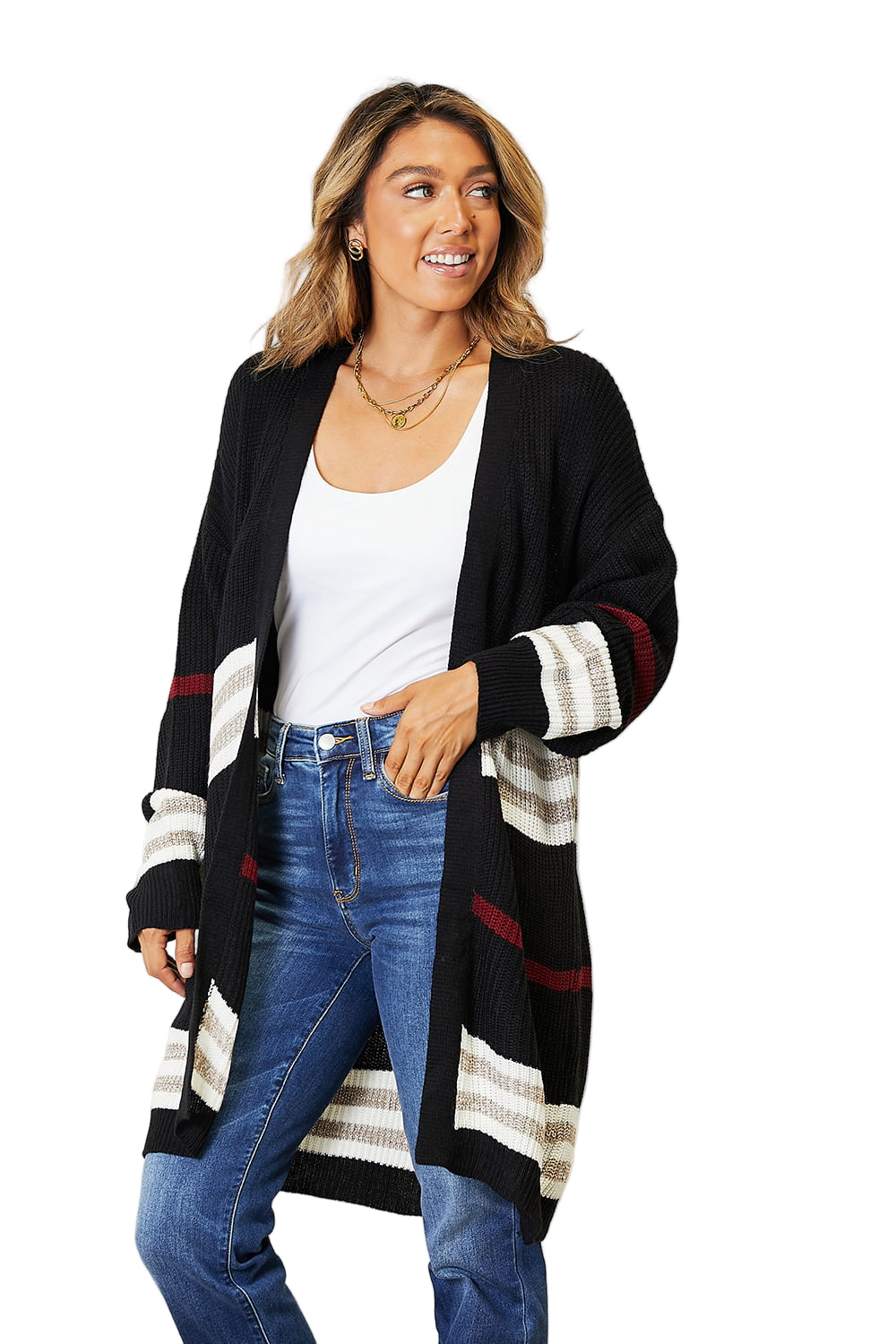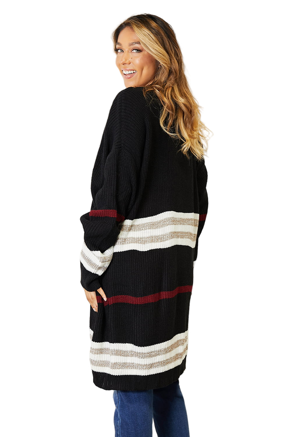 Wrap yourself in the warmth of romance with the Perfee Striped Rib-Knit Drop Shoulder Open Front Cardigan. This enchanting piece caresses your skin, inviting you to embrace its cozy embrace. The relaxed drop shoulder design flows effortlessly, while the playful striped pattern dances with your every movement, whispering tales of style and grace.