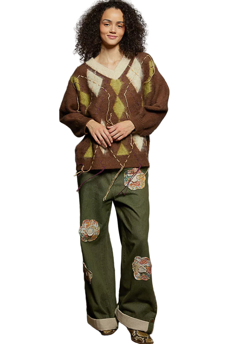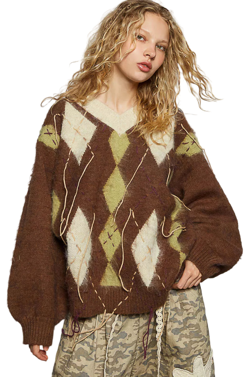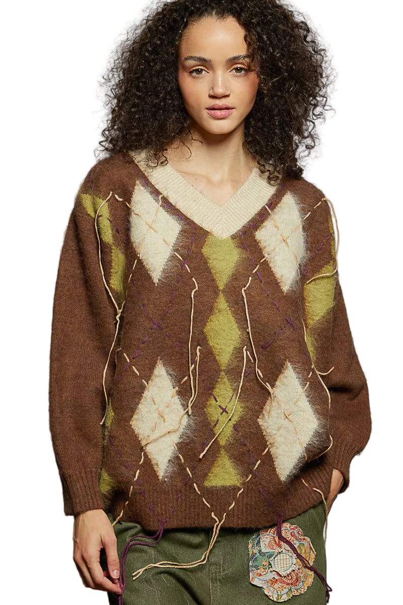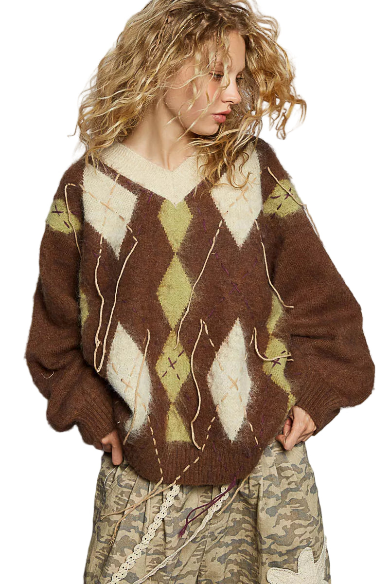 The enchanting argyle pattern dances across the fabric, whispering tales of timeless elegance, while the contrast exposed stitch detail adds a modern twist, igniting a spark of intrigue. With its relaxed fit and alluring V-neckline, this sweater effortlessly blends comfort and style, making it the perfect companion for both cozy evenings and elegant outings.