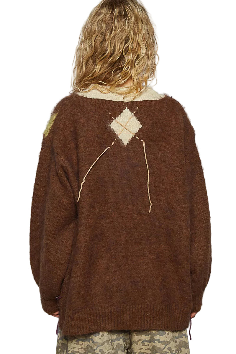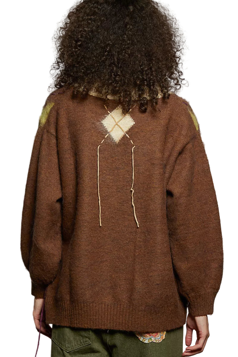 POL V-Neck Argyle Pattern Mohair Sweater with Contrast Exposed Stitch Detail