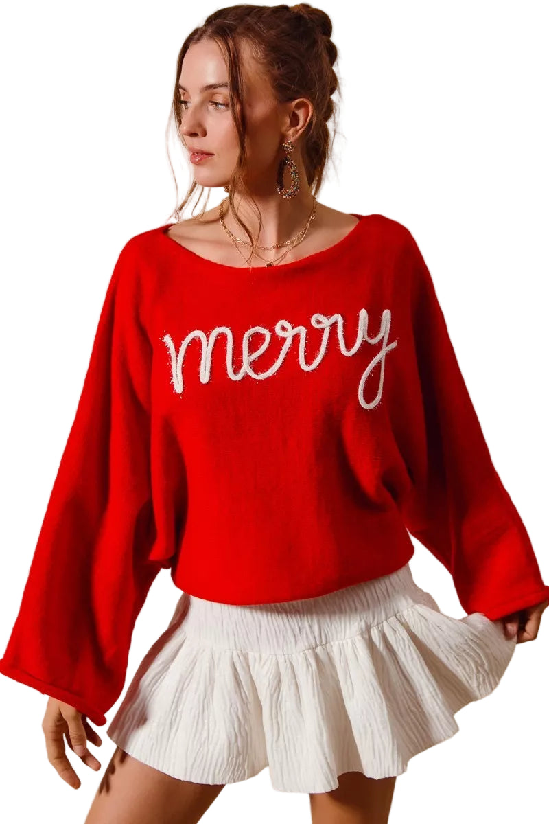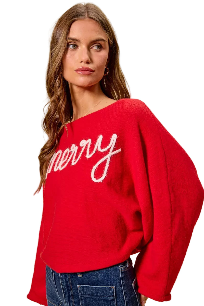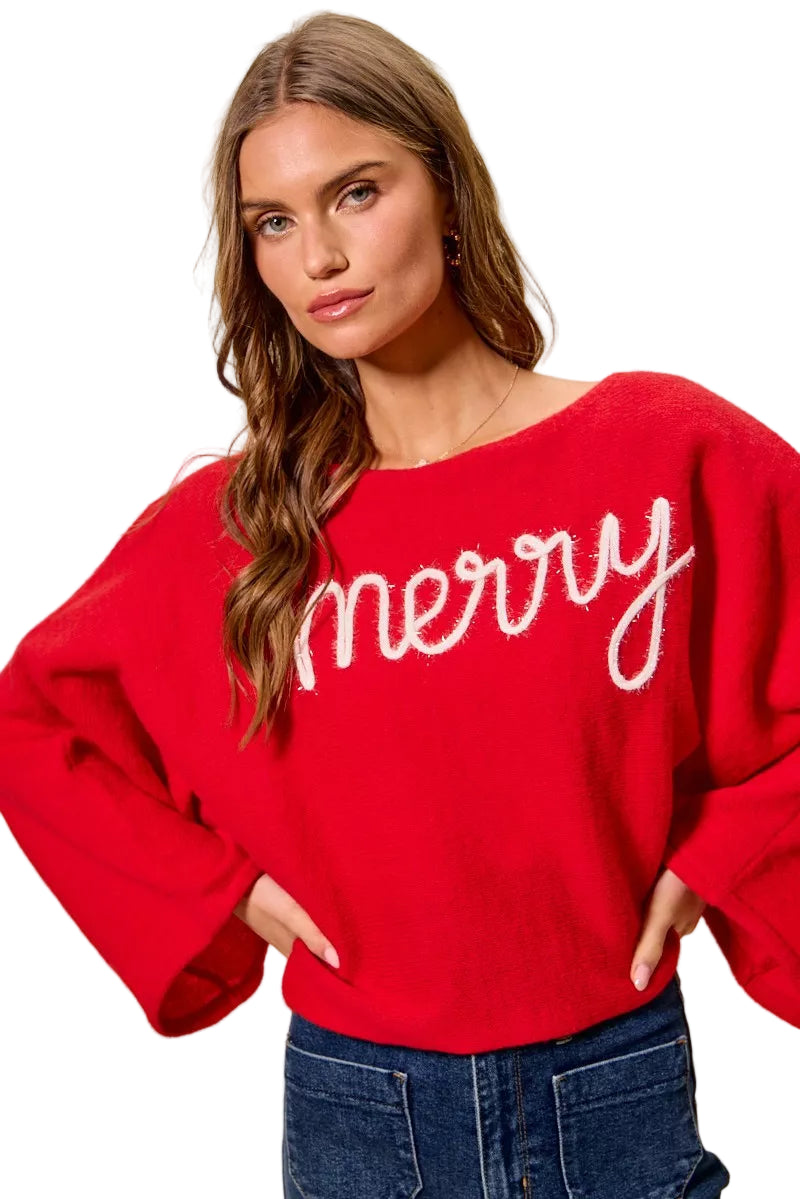 Wrap yourself in the warmth of the season with the SO ME Merry Tinsel Lettering Christmas Sweater Top. This enchanting piece, adorned with festive tinsel lettering, captures the essence of holiday joy, inviting you to celebrate love and laughter.